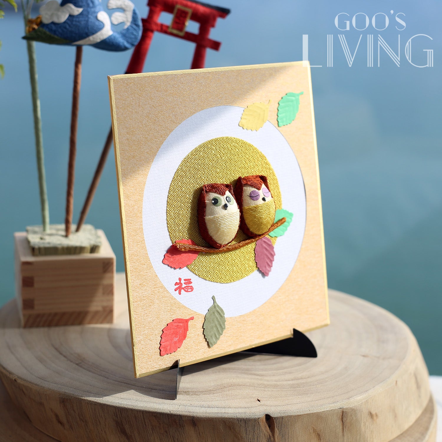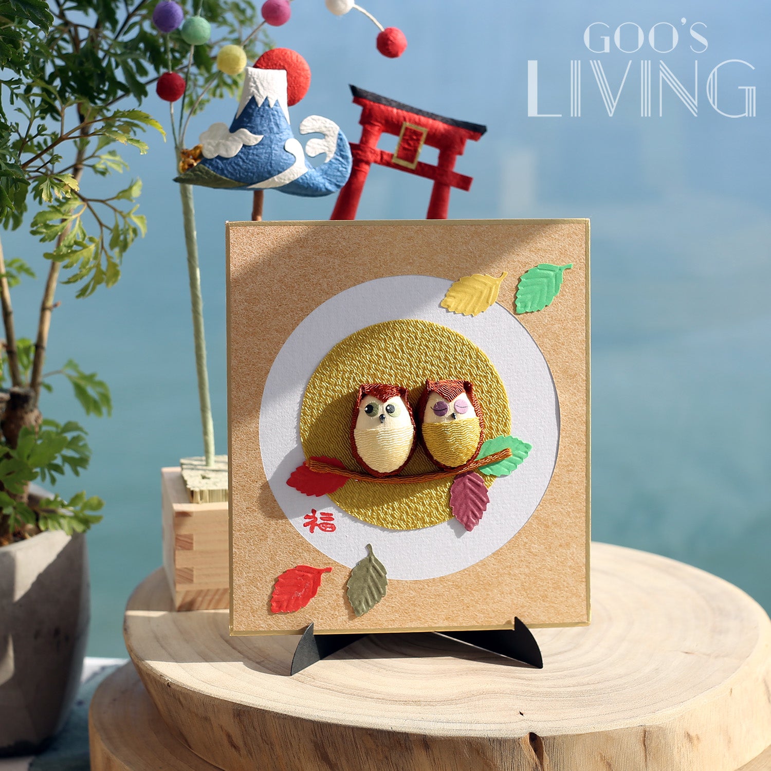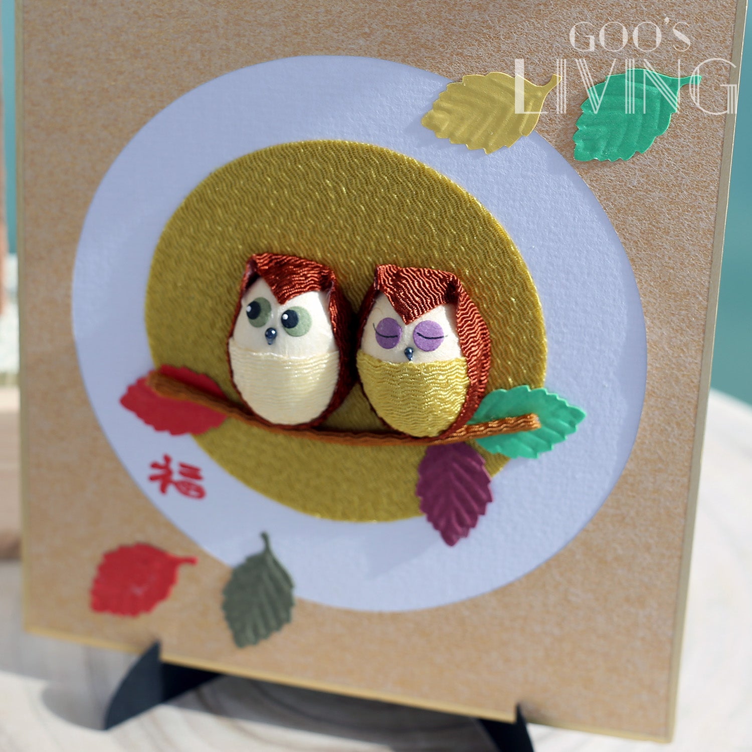 貓頭鷹的日文發音(Fukurou)與「不苦勞」這個日文詞語發音相同,因此有不用受苦的意思,加上與「福來郎」、「福老」、「富老來」等諧音相同,故同樣擁有長壽不老、有福氣與幸福等好兆頭。工藝師把2隻貓頭鷹並列一起,配以布藝製作,打造出一幅立體感滿分的福氣紙畫,讓人一見難忘,財富幸運兩兼備。