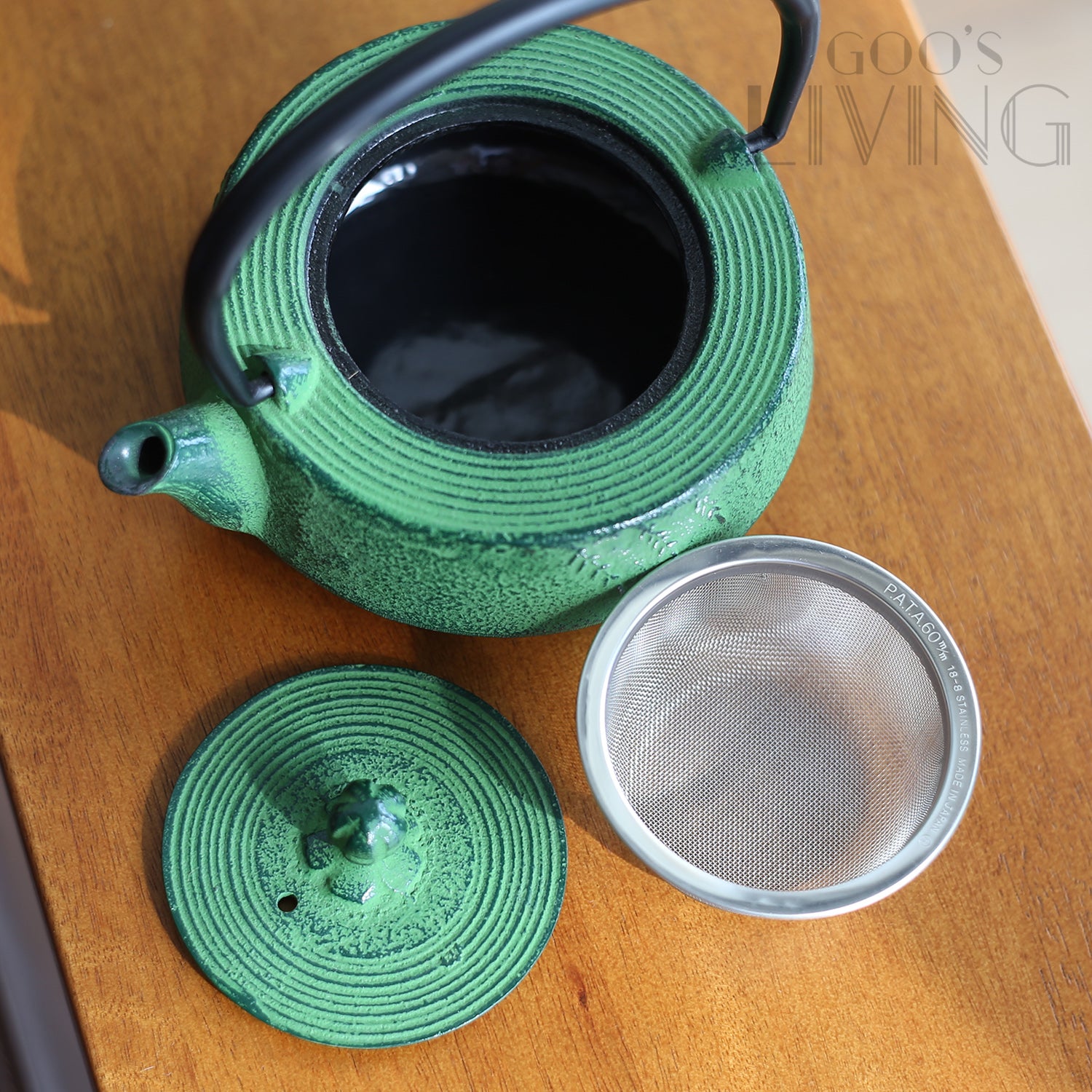 這款以草綠色為主的急須設有獨立濾網可放入茶葉,茶壺內部更鍍上了琺瑯材質,故不用怕生銹,耐用度大大提升,而瓶身上更繪製了樹葉紋路,兼具傳統與創新之美。