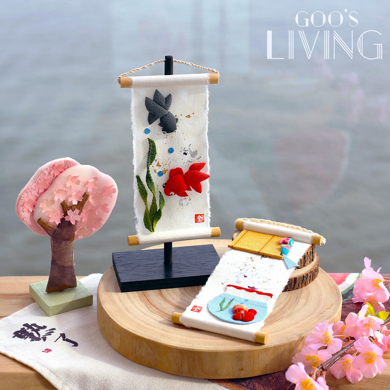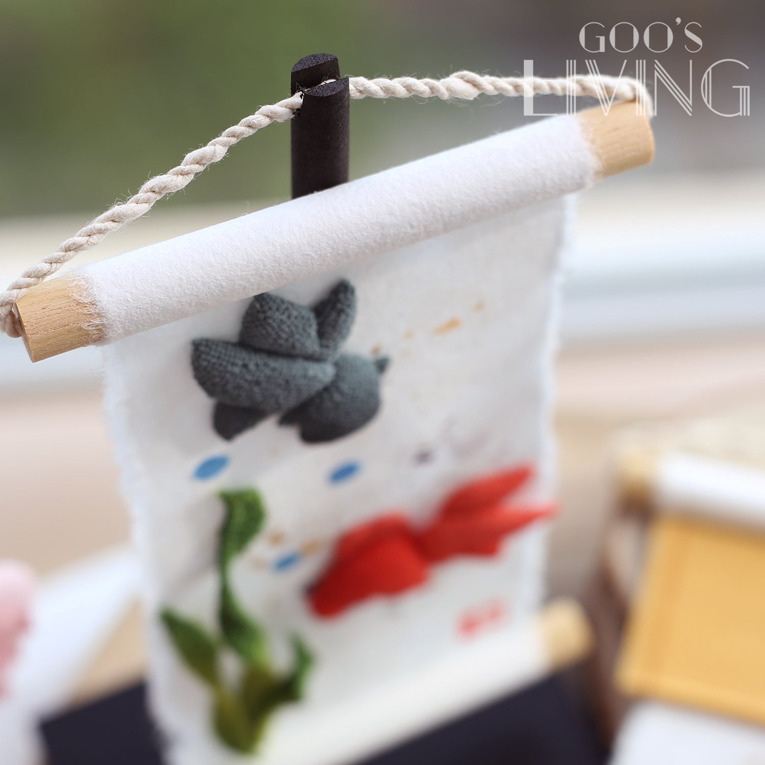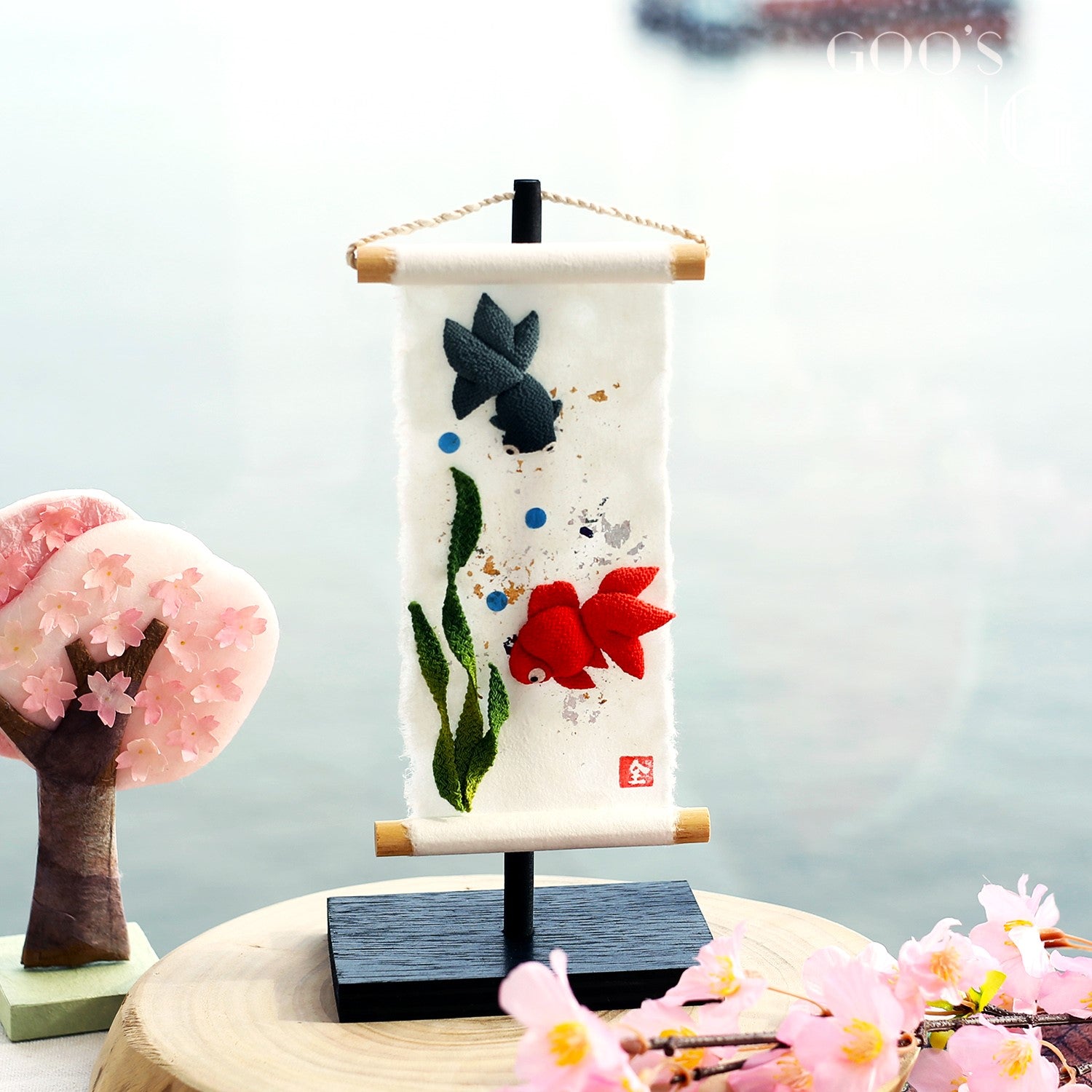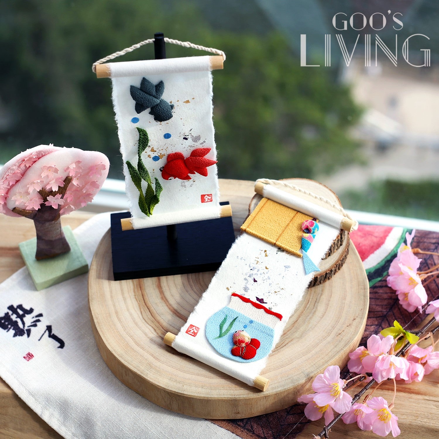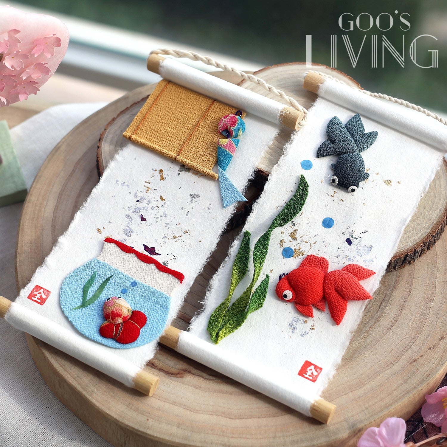 由日本紙和縐紗製成的迷你掛軸,由京都工匠全人手製作,以極講求手工技術的染色方法逐筆點上金銀箔,並剪出惟肖惟妙的金魚或魚缸,擁有濃厚的和風之美,為夏天帶來一股清涼快意。掛軸雖小,卻讓人一看難忘,有著強烈的存在感,亦相當適合裝飾空間有限的小蝸居,飯廳、睡房、兒童房或電視櫃上也可隨處佈置。