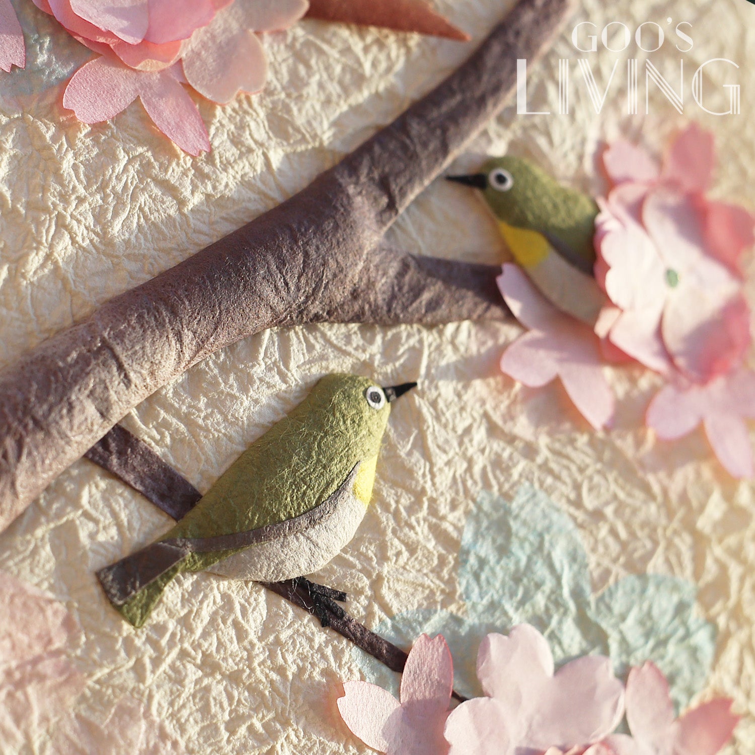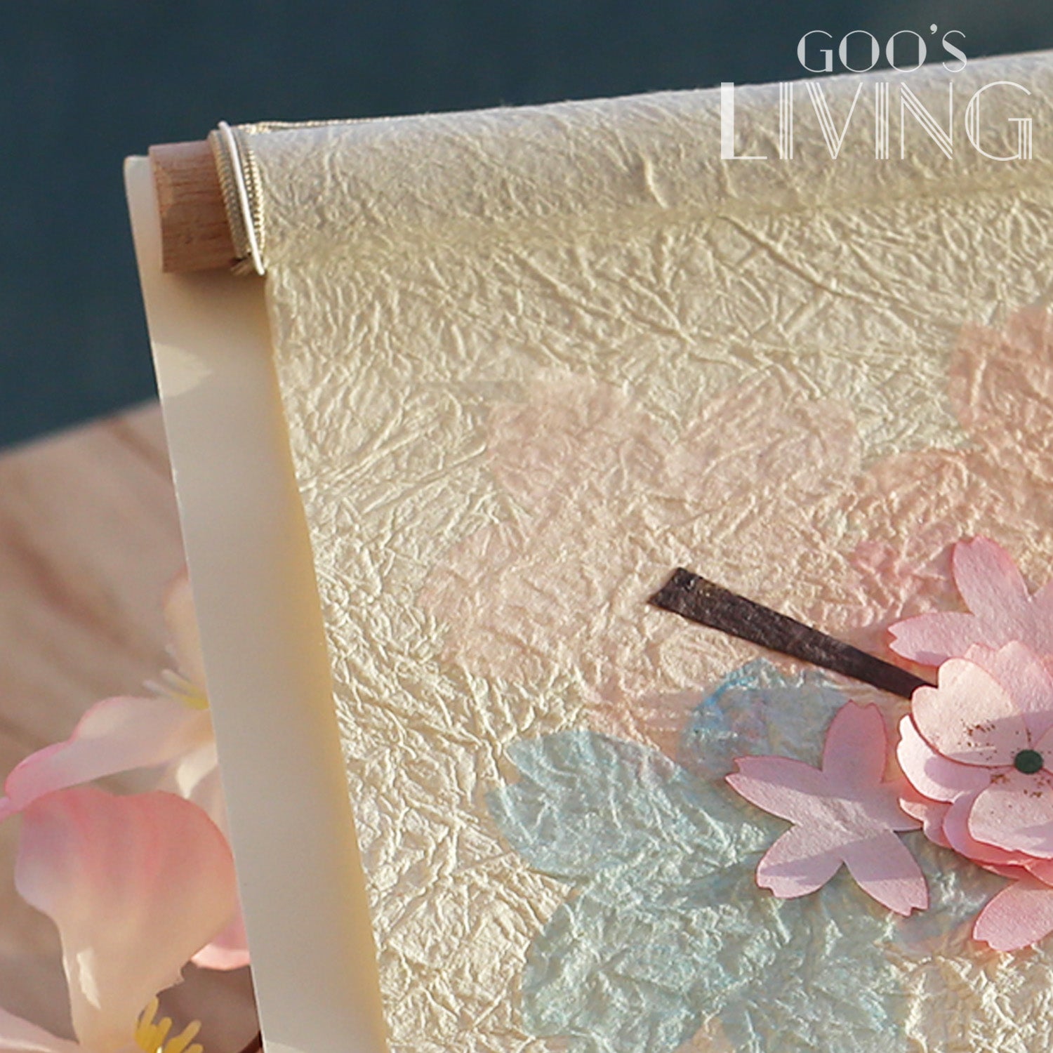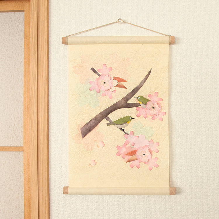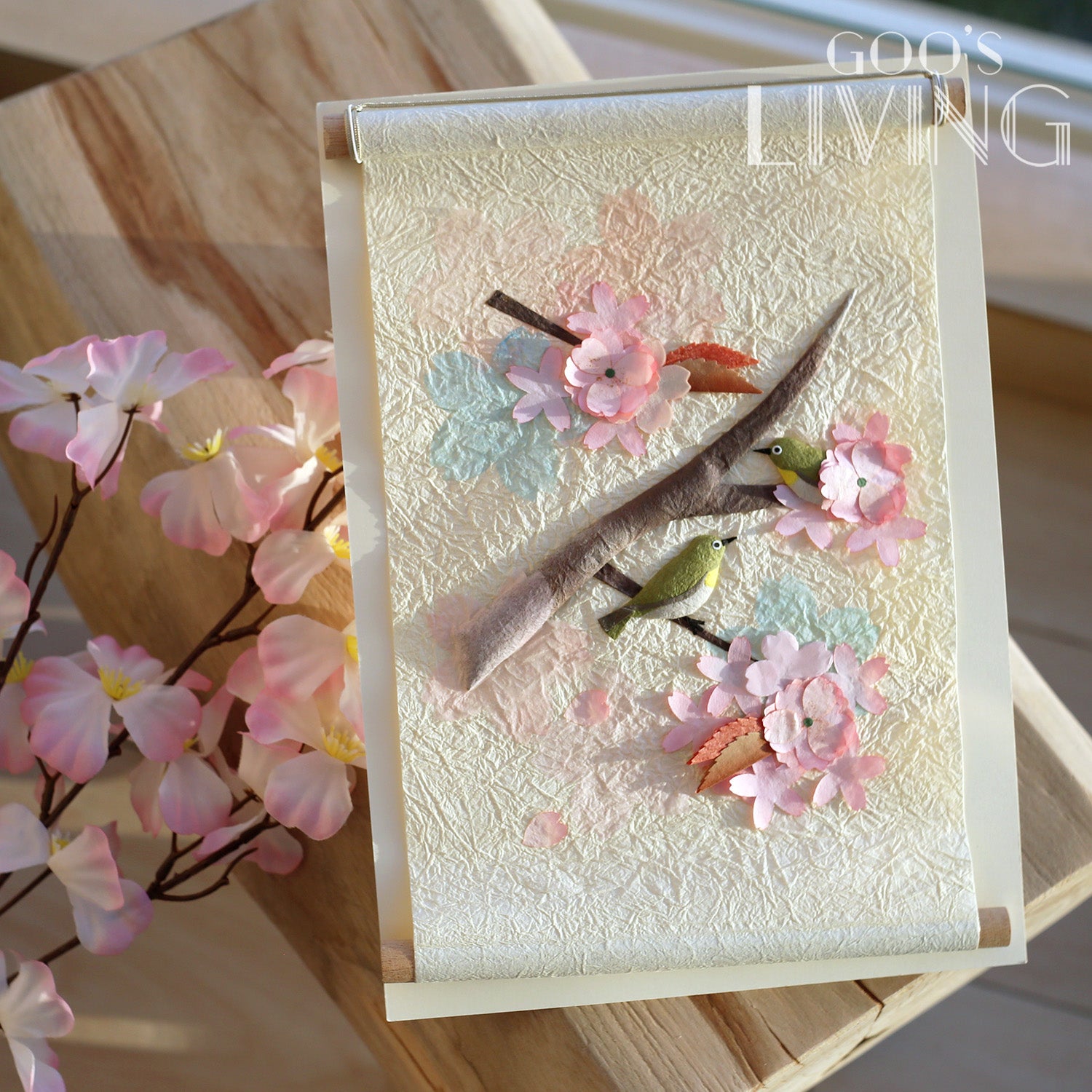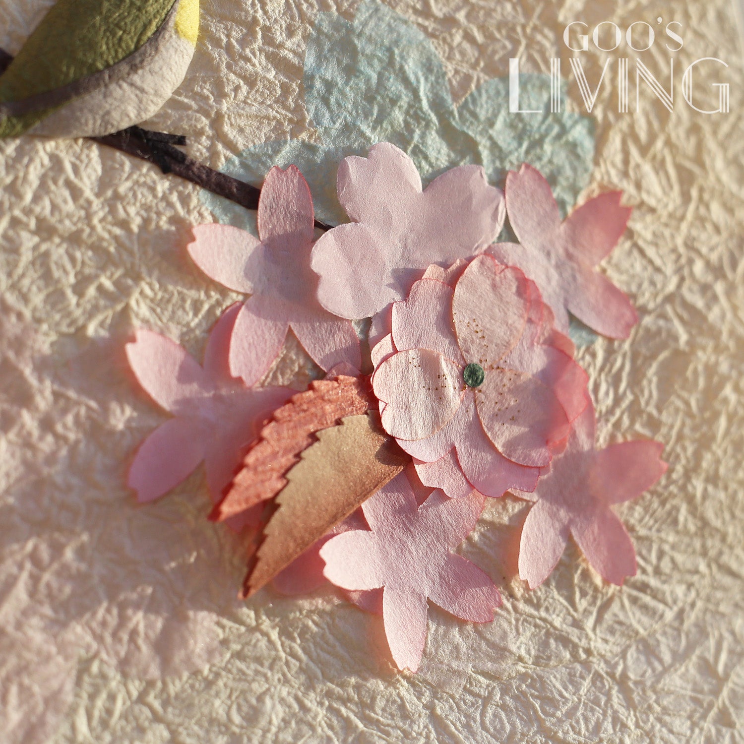 這幅以日本紙製作的軸畫,由京都工匠全人手製作,以極講求手工技術的染色方法逐筆點上金箔,並剪出惟肖惟妙的櫻花和相思鳥,再加入棉花讓牠們成為立體畫,擁有濃厚的日本傳統美學,讓你隨時隨地享受花鳥寧靜的溫暖季節。