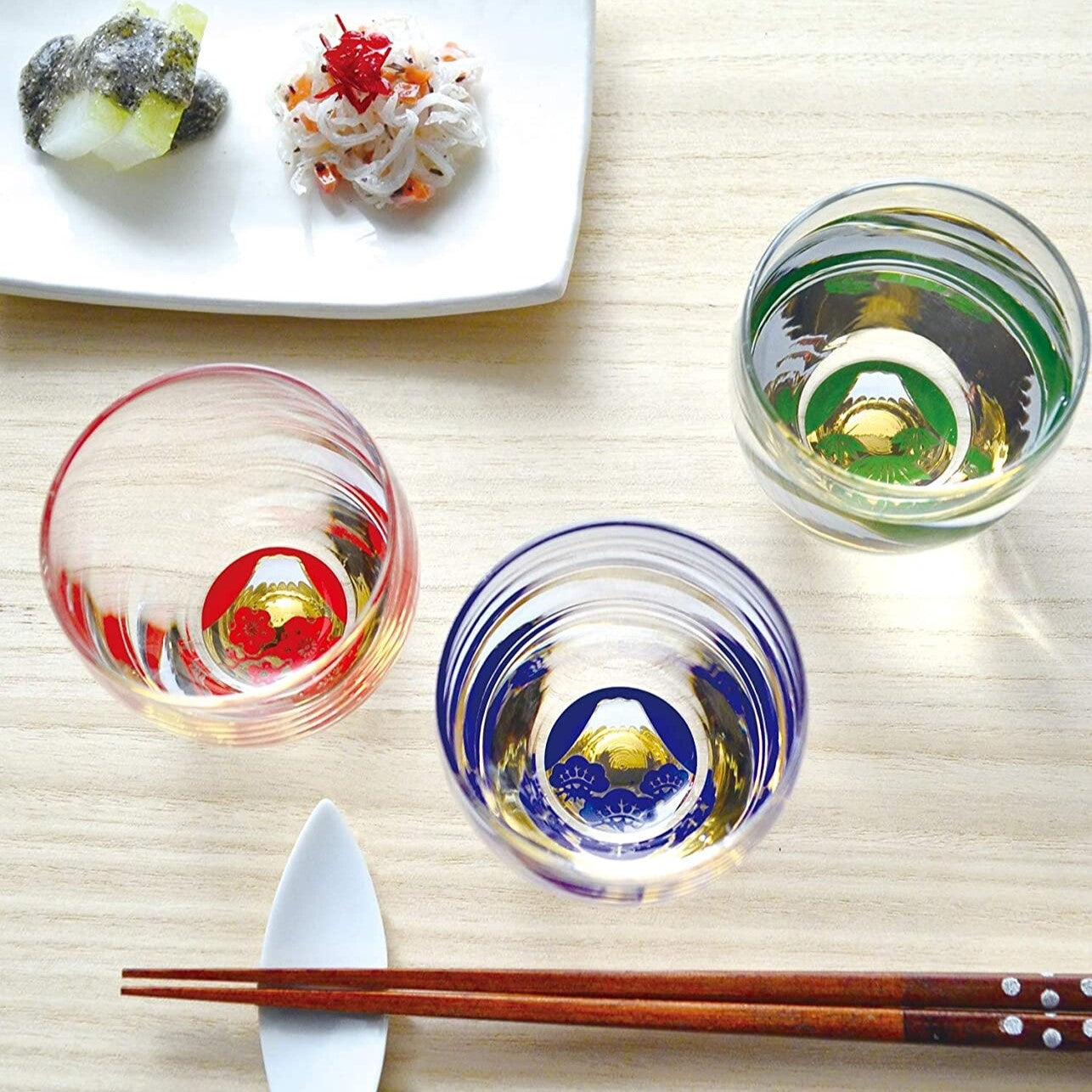 富士山在日本是帶來幸運和福氣的象徵,故不少以富士山作主題的清酒杯均叫作「招福杯」。是次的招福杯一盒備有三隻,以紅、藍、綠三色配以神聖的富士山為題,杯底的富士山圖案更分別設有代表強大生命力的松樹、象徵健康成長的竹子、與有喜慶幸運意思的梅花,不論自用或作禮物均是完美選擇。