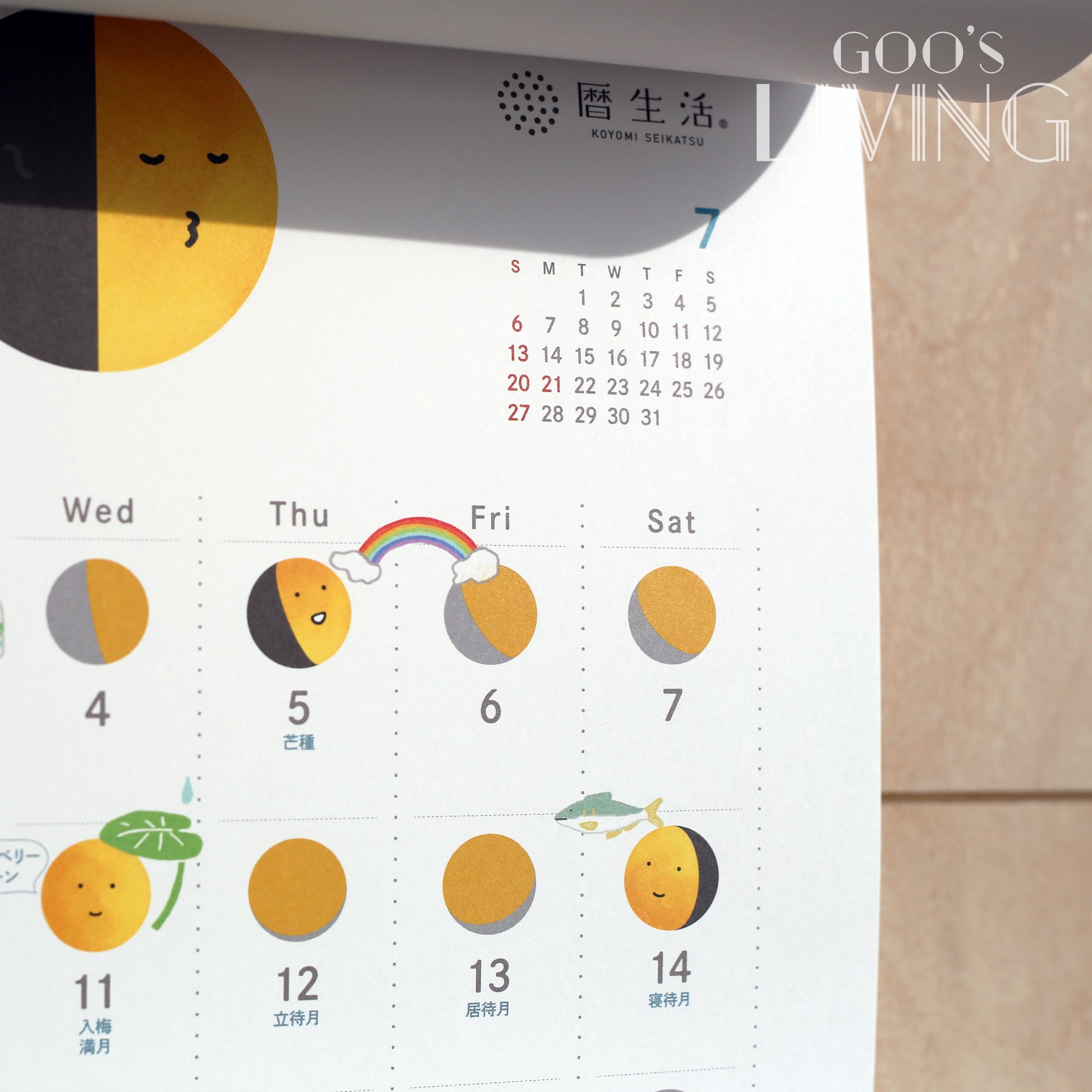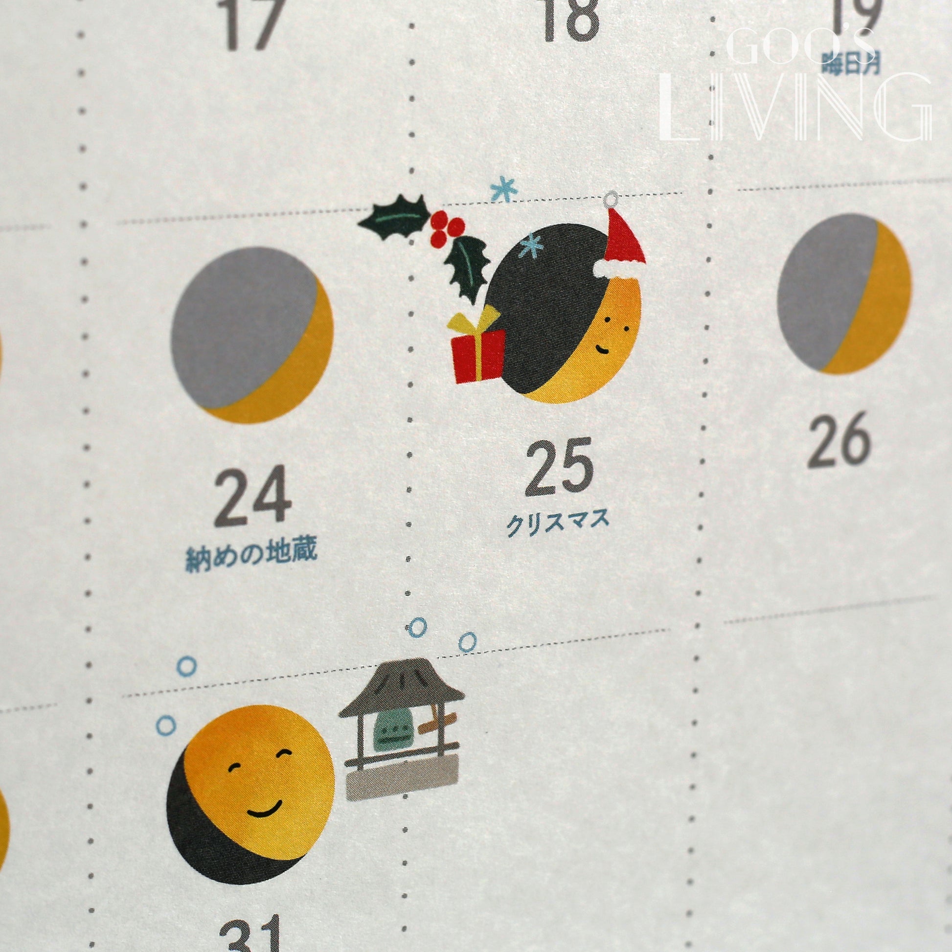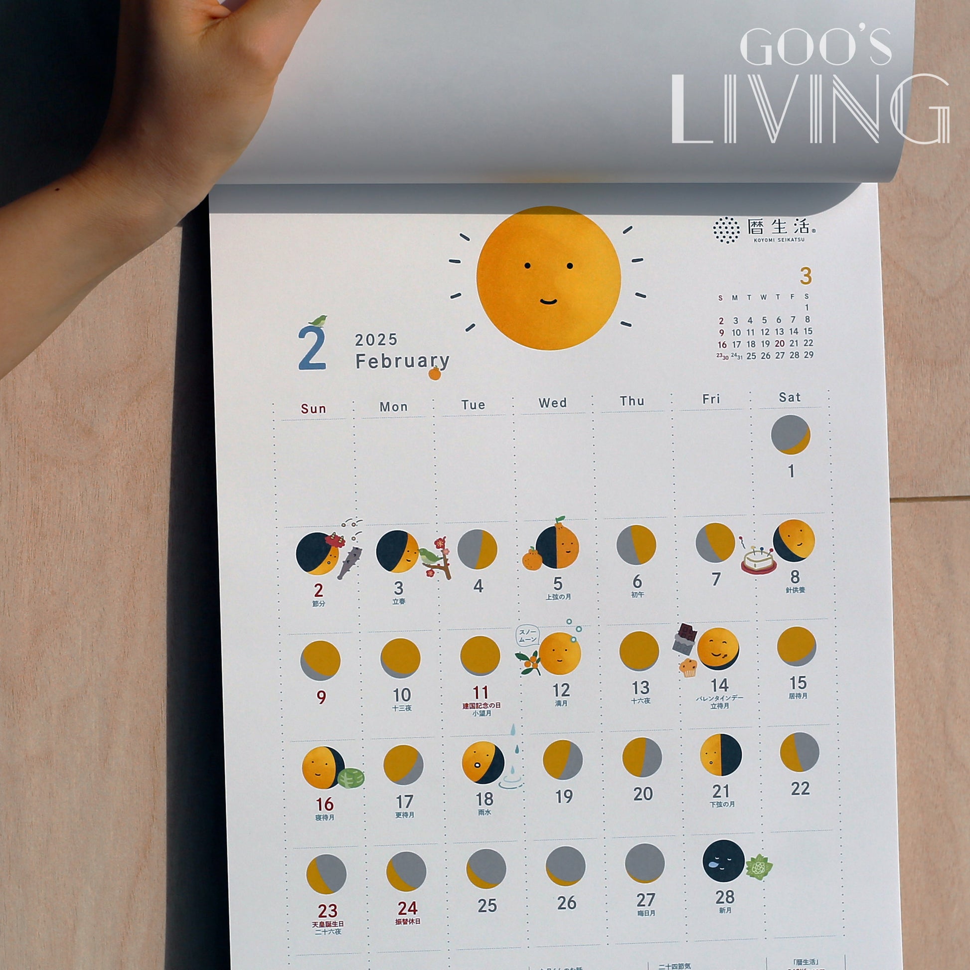 大月君近年在日本備受歡迎,單是社交媒體的粉絲總數已突破50萬,以大月君為滿月月曆的主角最適合不過。翻開不同月份,均可看到不同表情的大月君,不同的節日上更有特別裝扮,而大月君亦代表了當天的月亮狀況,資訊與趣味並存,更可讓你隨時得知日本節日盛事。