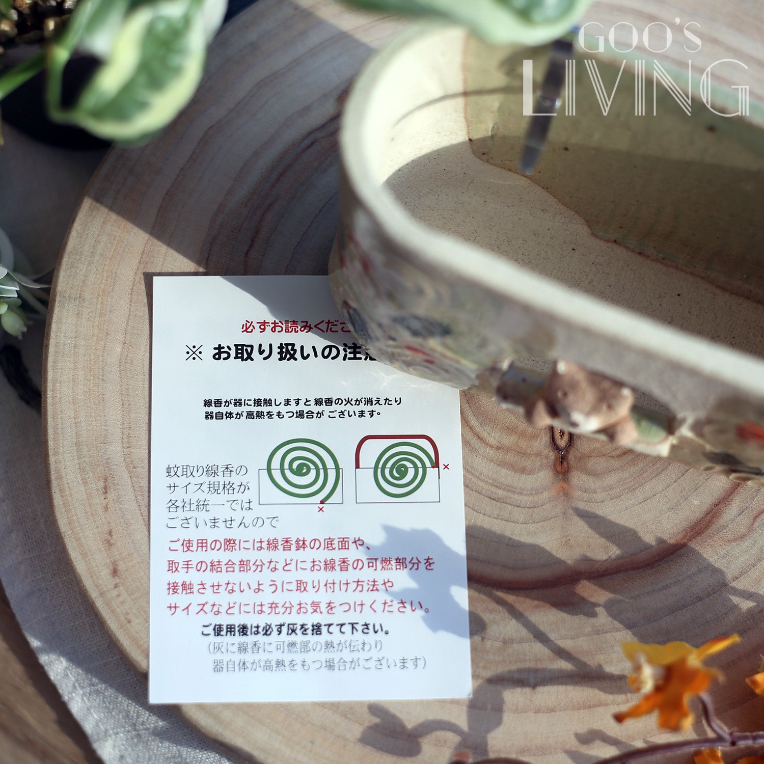 日本人於夏天常會在窗邊或露台點盤香,除了可防止蚊蟲入屋,隨著盤香的不同成份亦有不同的舒壓效果,故日本同時設有多款不同的線香盆。