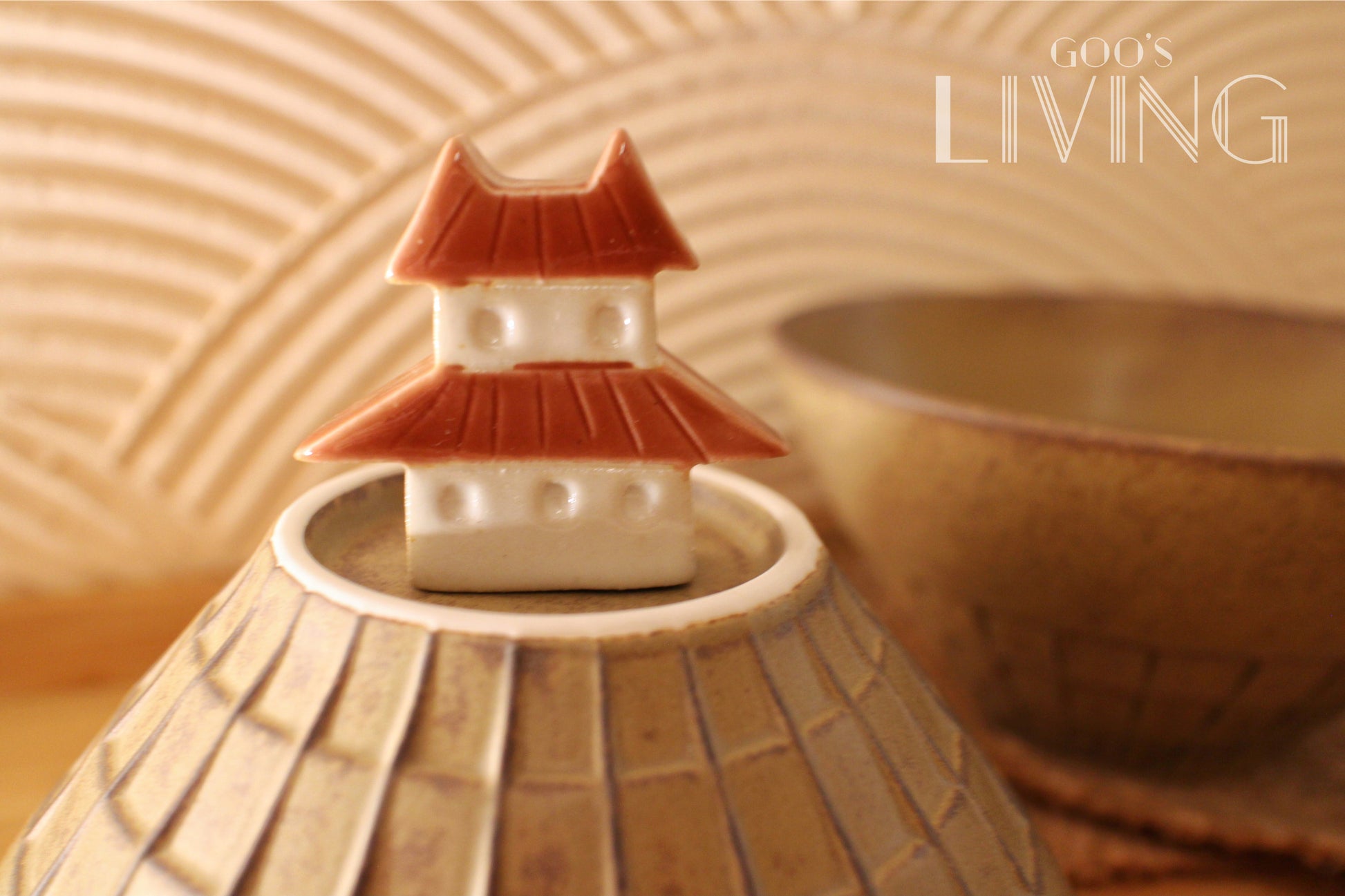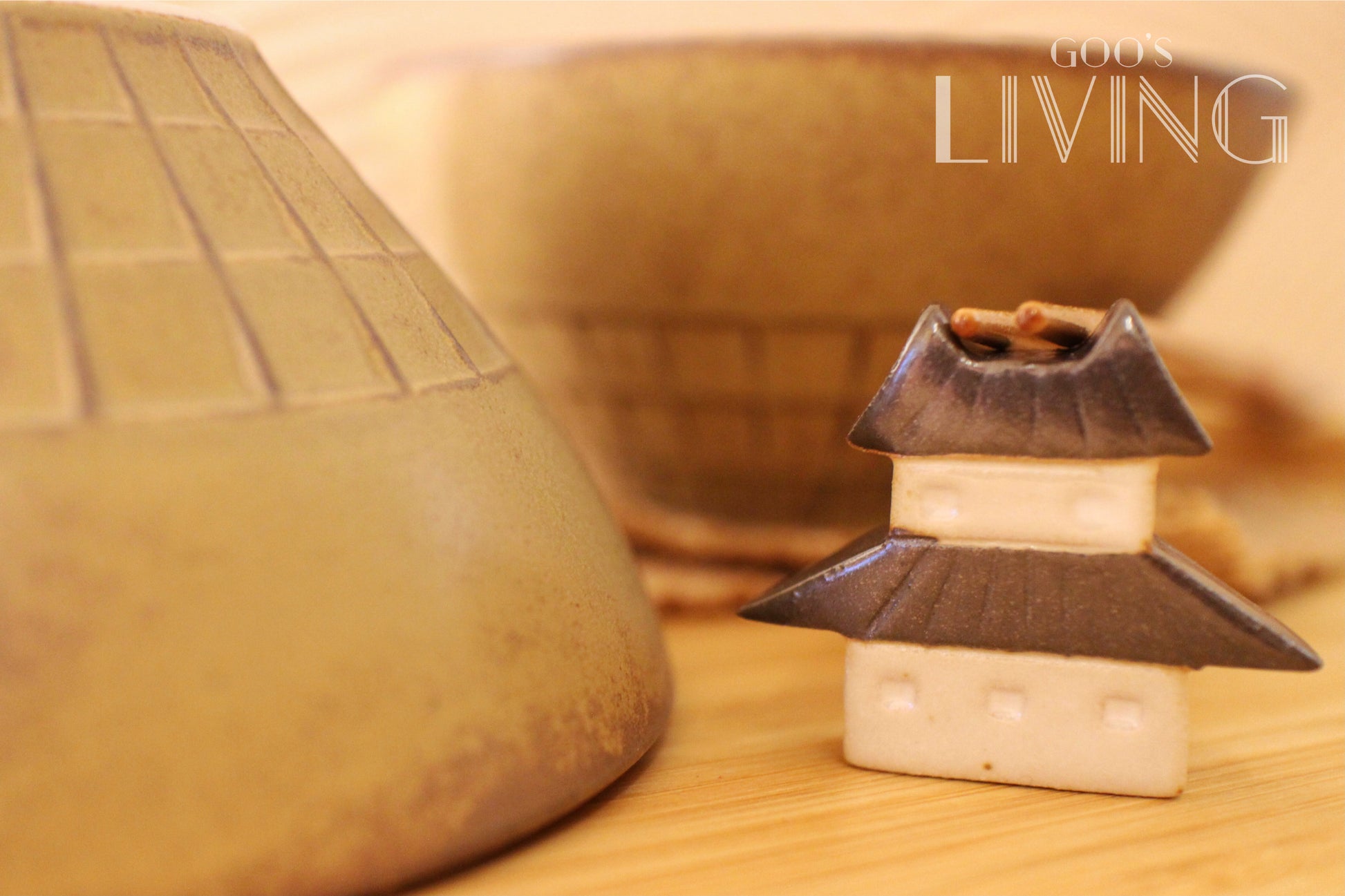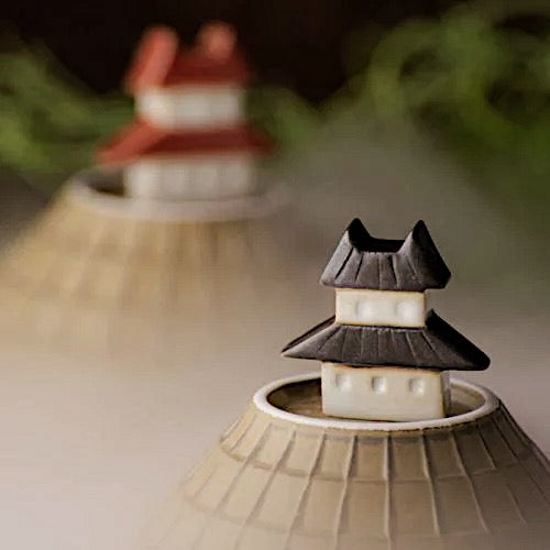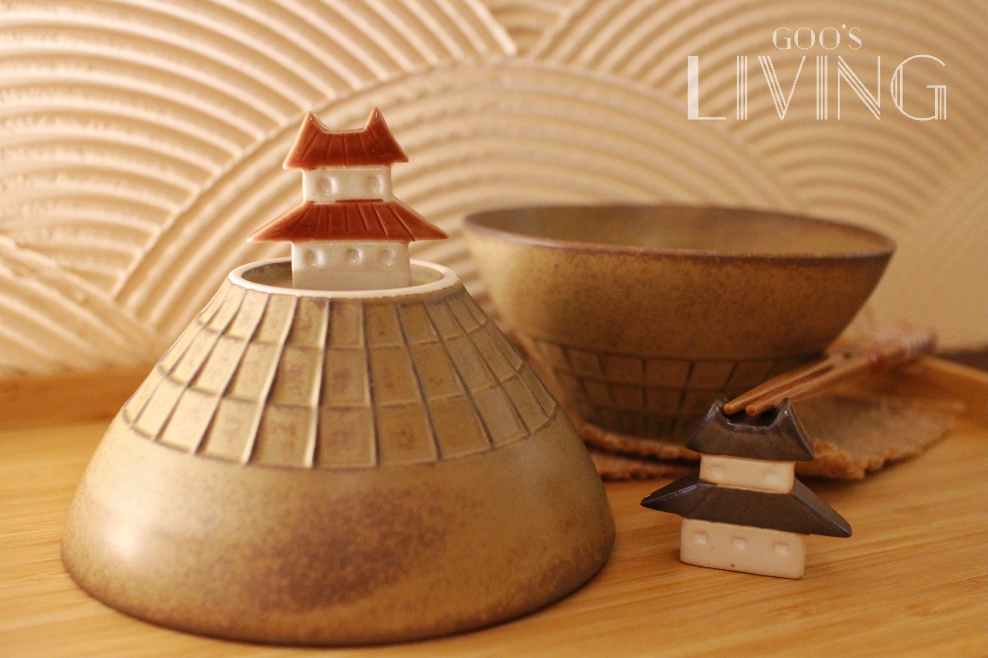 以神奈川縣的石垣山城為概念的碗筷架套裝,飯碗上的紋路配以泥黃色的釉料,就如一堵石牆般逼真。以人手製作的筷子托一紅一黑,配合飯碗使用可輕鬆營造出獨特的穩重感。此為飯碗套裝,一套備有兩個飯碗,兩個筷子托,自用送禮均可。