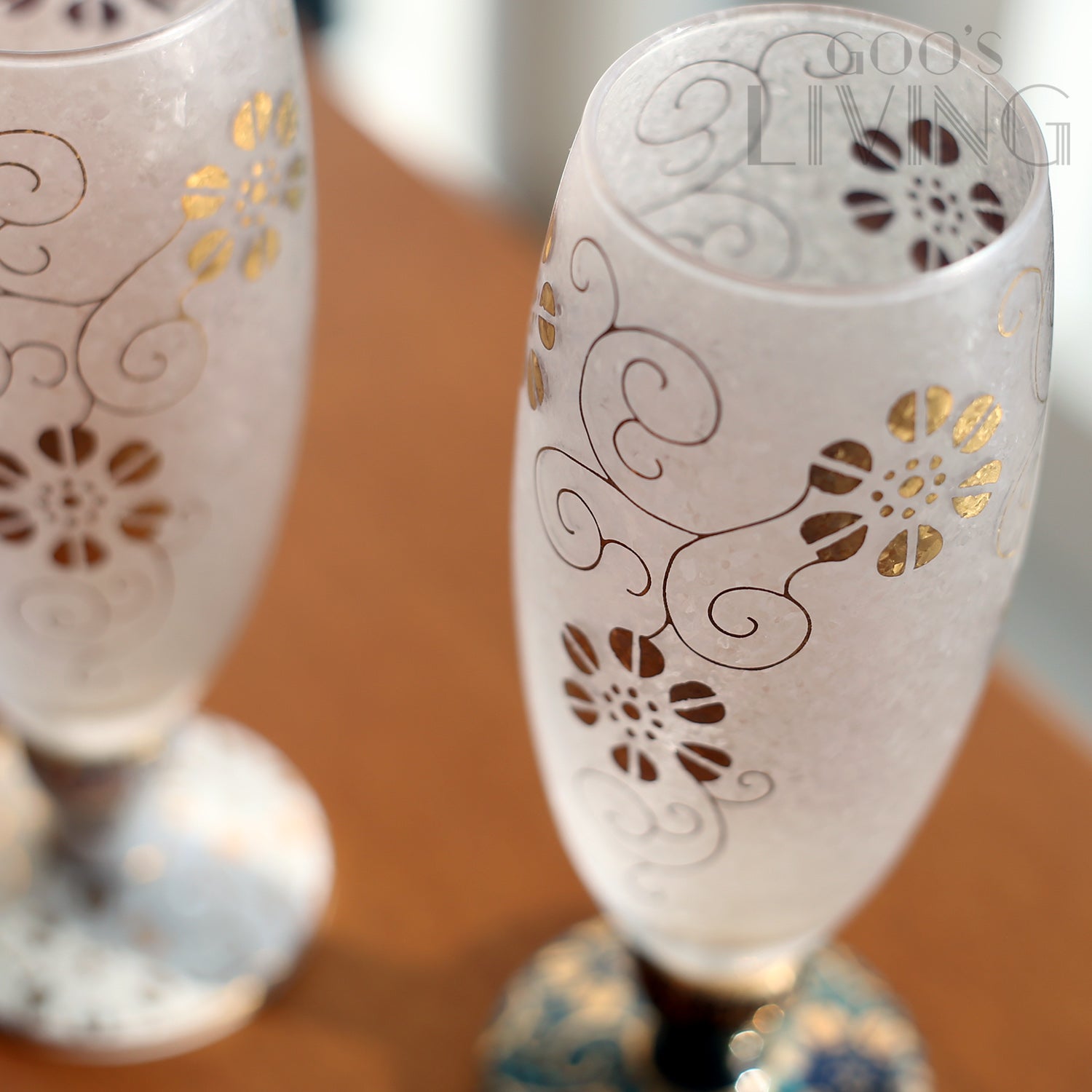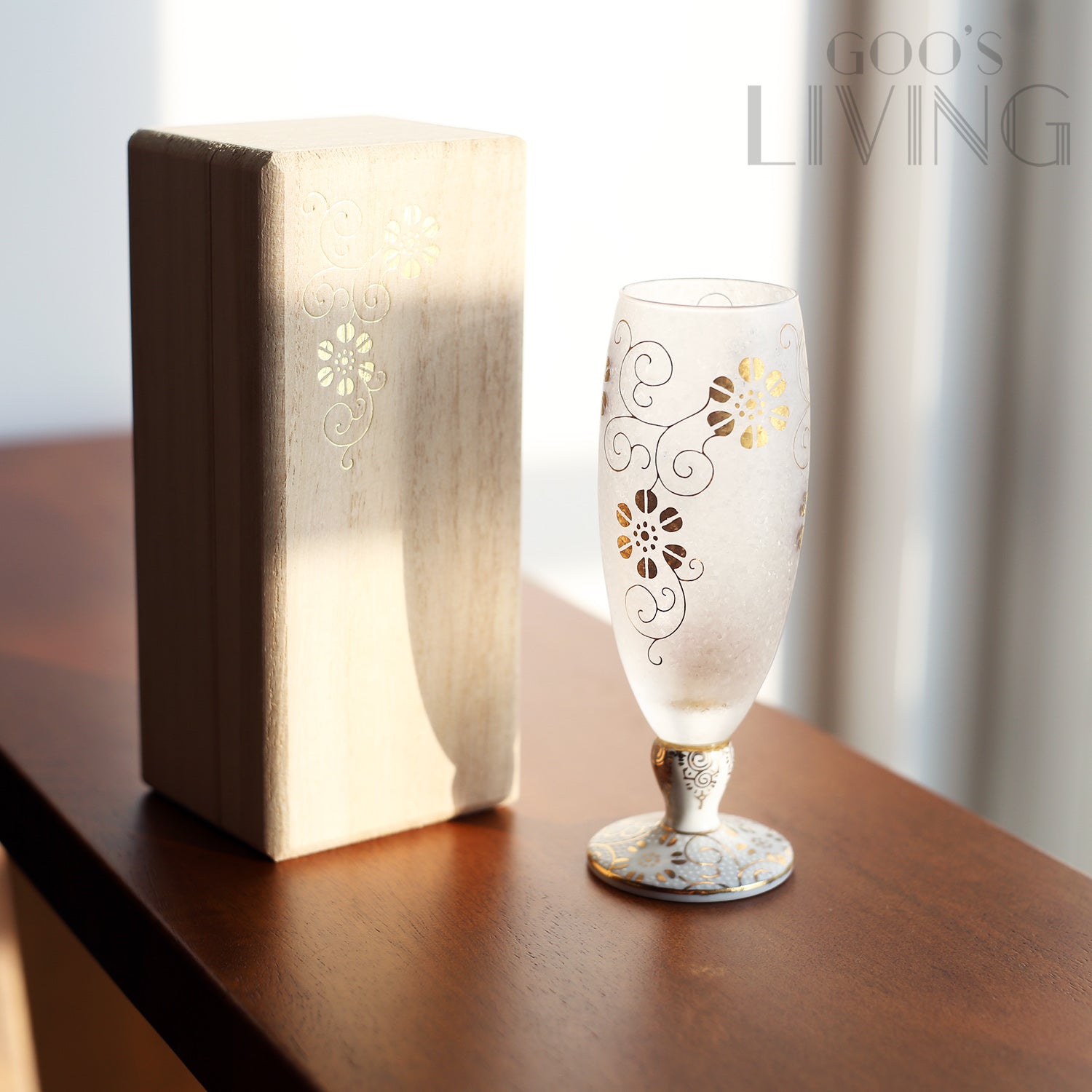 石塚硝子向來是玻璃品牌中的品質保證,獨特的霧面結晶玻璃可大幅減少水珠凝結,更可打造出下雪時打落玻璃上的霜凍質感,配以杯身上以金漆繪製的蔓藤花圖案,如冰晶般閃閃發光。