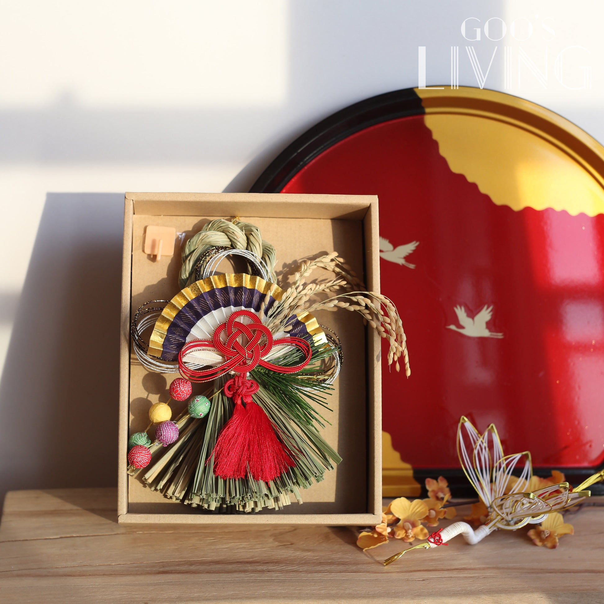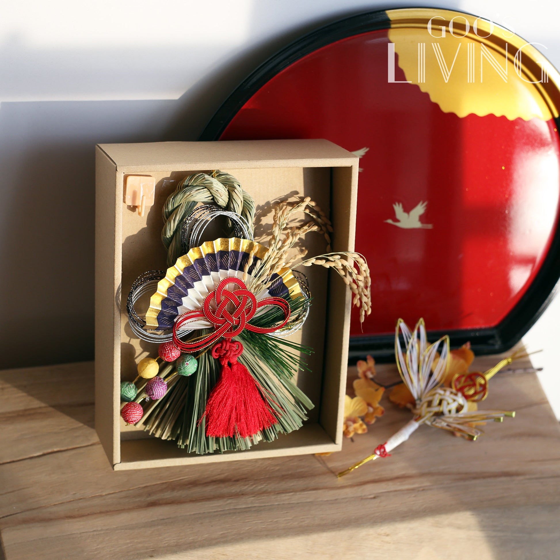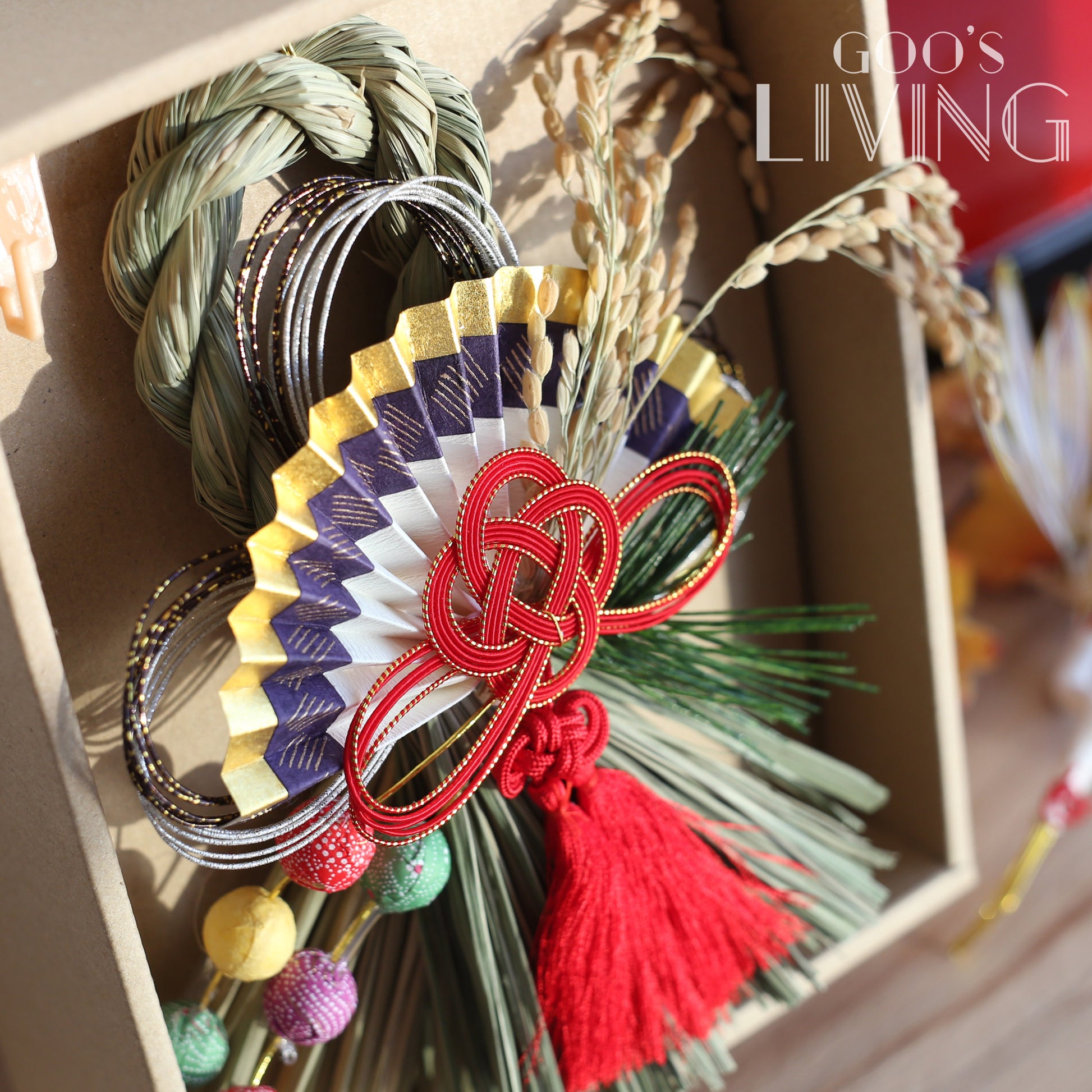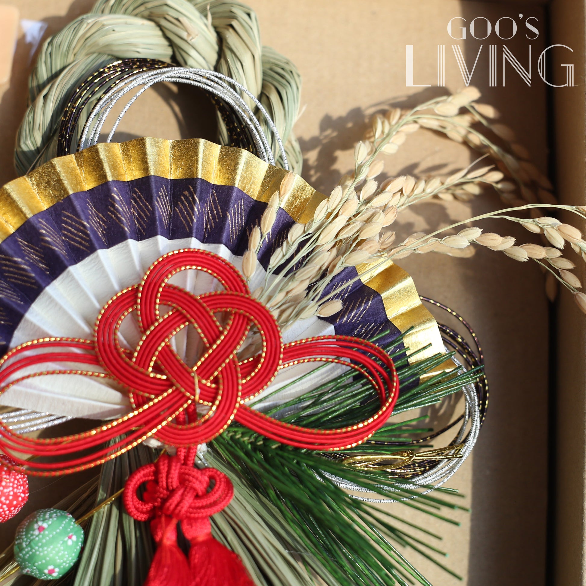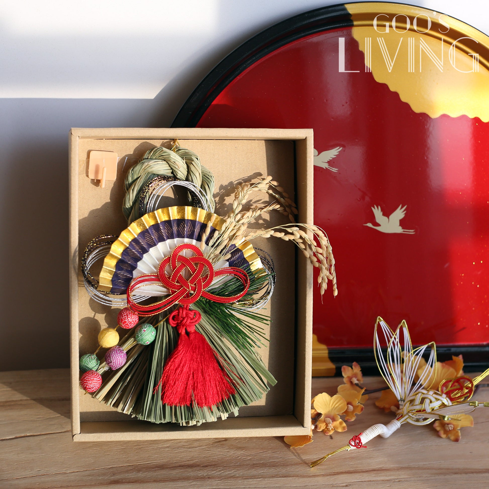 正月飾以新潟縣南魚沼產的稻草作骨架,並以工匠非凡的心血和精湛技術裝飾,獨有的稻草香亦可提升新一年的好景象。而正月飾上的東西各有不同寓意,如作為骨架的稻草圈是具有祈福意涵的護身符,以其結繩形象延伸為「結界」,意諭此地為神祇所照護的領域;稻穗代表感恩、豐收以及孕育新生命的能量;紅白或金銀搭配的繩結水引表示美好的願望;葉象徵多子多孫;中間的仙鶴則代表長壽健康:而金摺扇就被視為繁榮的象徵,代表開運、招福,為你帶來財運意思。