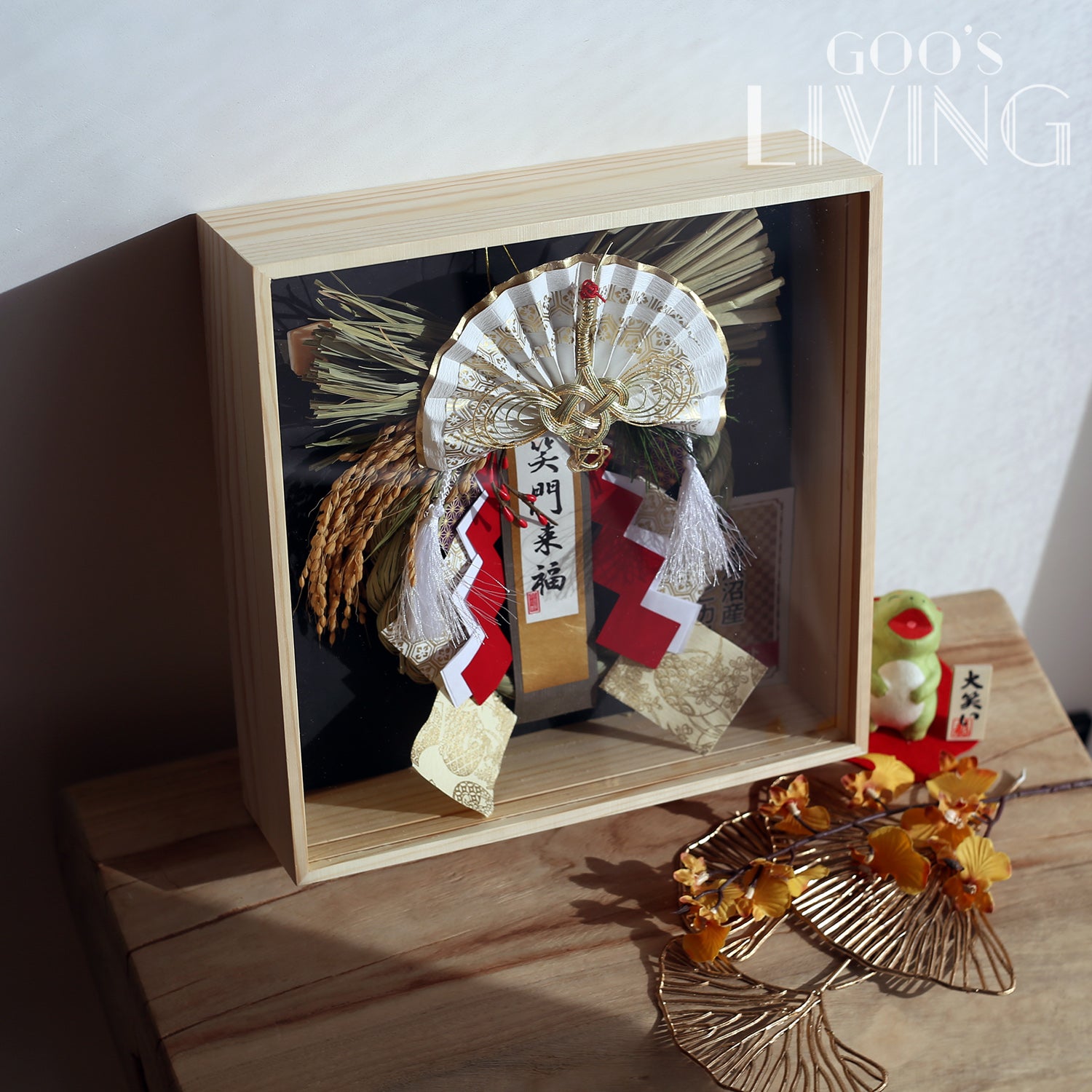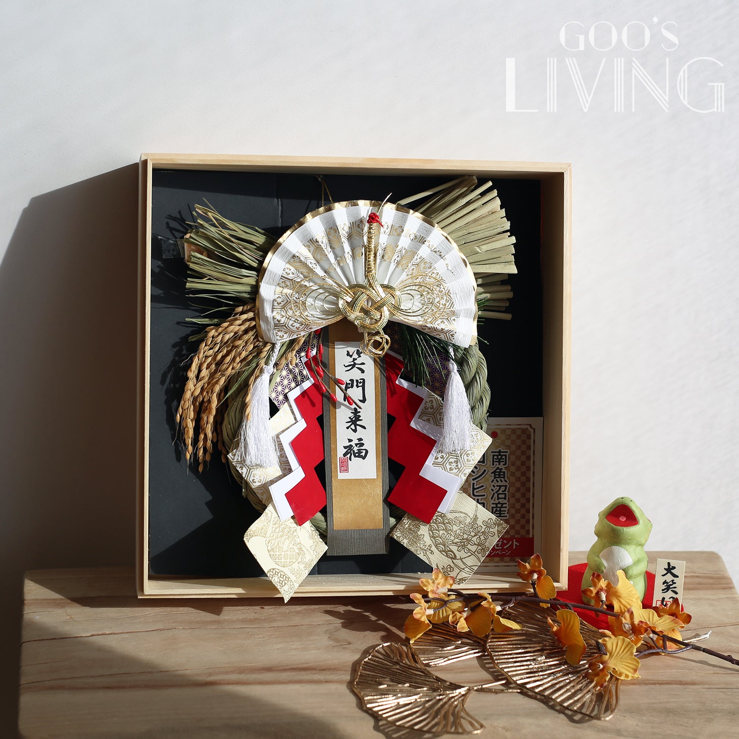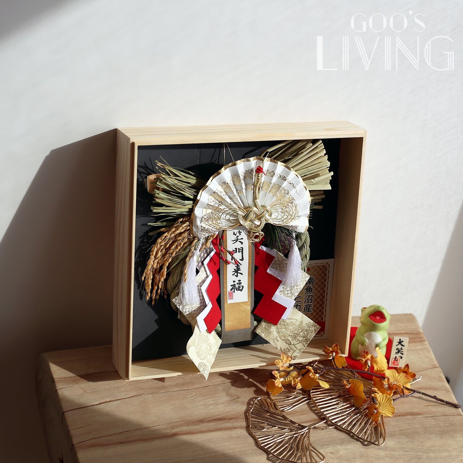 正月飾上的東西各有不同寓意,如作為骨架的稻草圈是具有祈福意涵的護身符,以其結繩形象延伸為「結界」,即意諭為此地為神祇所照護的領域;稻穗代表感恩、豐收以及孕育新生命的能量;紅白或金銀搭配的繩結水引表示美好的願望;葉象徵多子多孫;中間的仙鶴則代表長壽健康:而金摺扇就被視為繁榮的象徵,代表開運、招福,為你帶來財運意思。