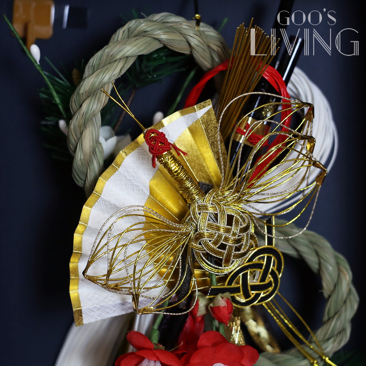 正月飾上的東西各有不同寓意,如作為骨架的稻草圈是具有祈福意涵的護身符,以其結繩形象延伸為「結界」,即意諭為此地為神祇所照護的領域;稻穗代表感恩、豐收以及孕育新生命的能量;紅白或金銀搭配的繩結水引表示美好的願望;葉象徵多子多孫;中間的仙鶴則代表長壽健康:而金摺扇就被視為繁榮的象徵,代表開運、招福,為你帶來財運意思。