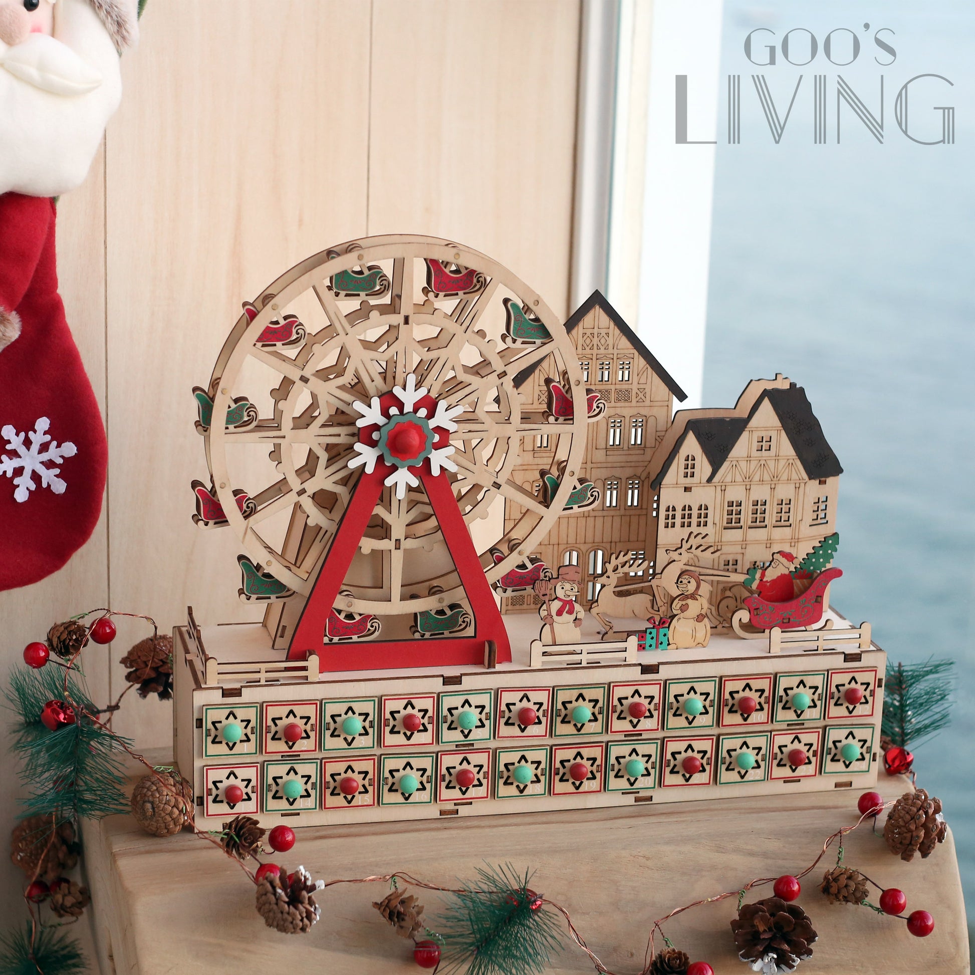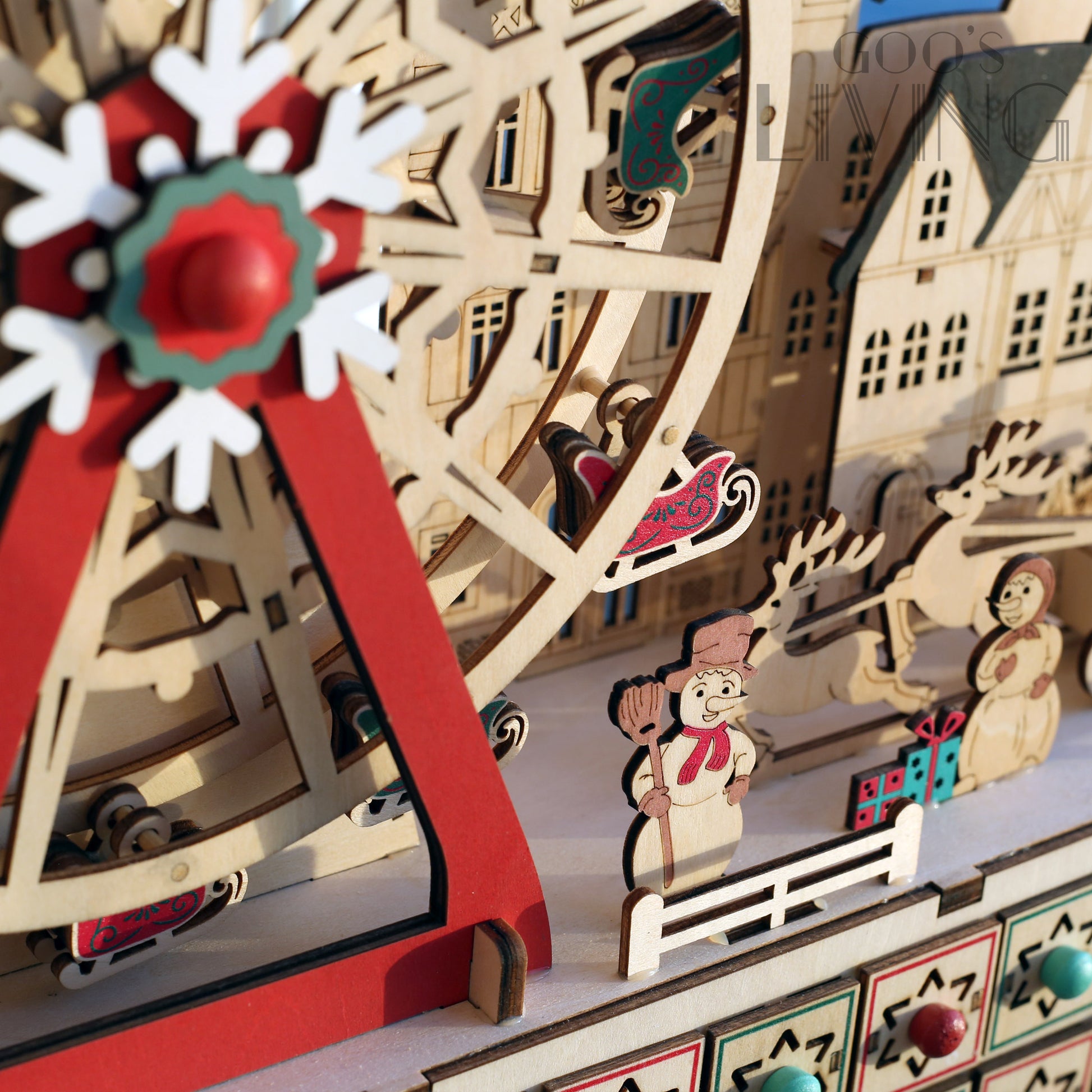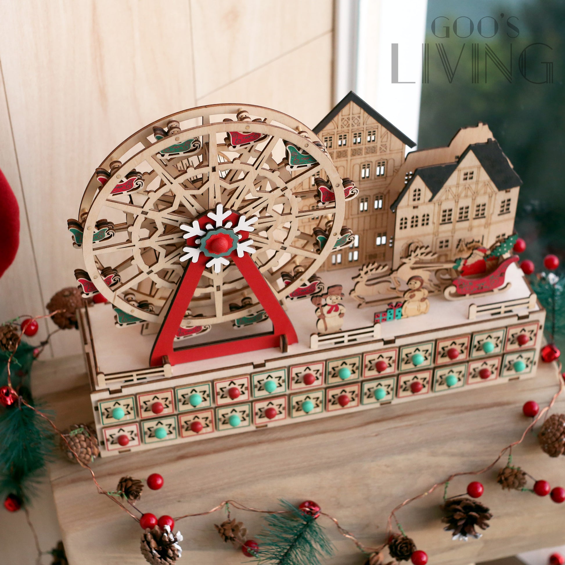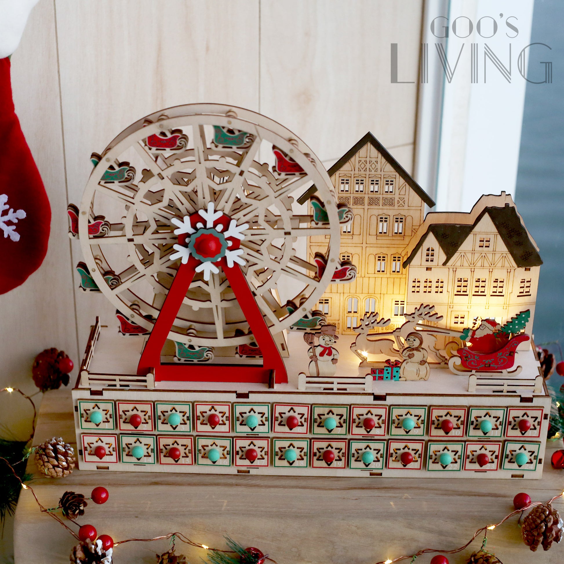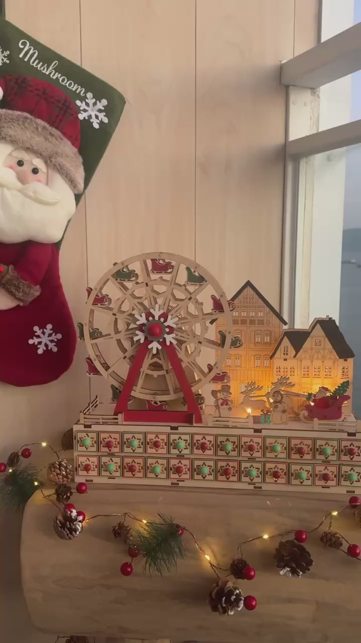 以聖誕摩天輪為主題的木製倒數日曆,由紅綠雪橇相隔而成,配以主軸的雪花圖案,聖誕氣氛十足,而入電後整個摩天輪更可轉動,節日感大增。摩天輪旁亦設有聖誕小屋、雪人與聖誕老人等聖誕元素,隨著LED燈亮起有著另一感覺,而摩天輪下的24個小盒子可在內放糖果或小禮物,讓你每天充滿驚喜。