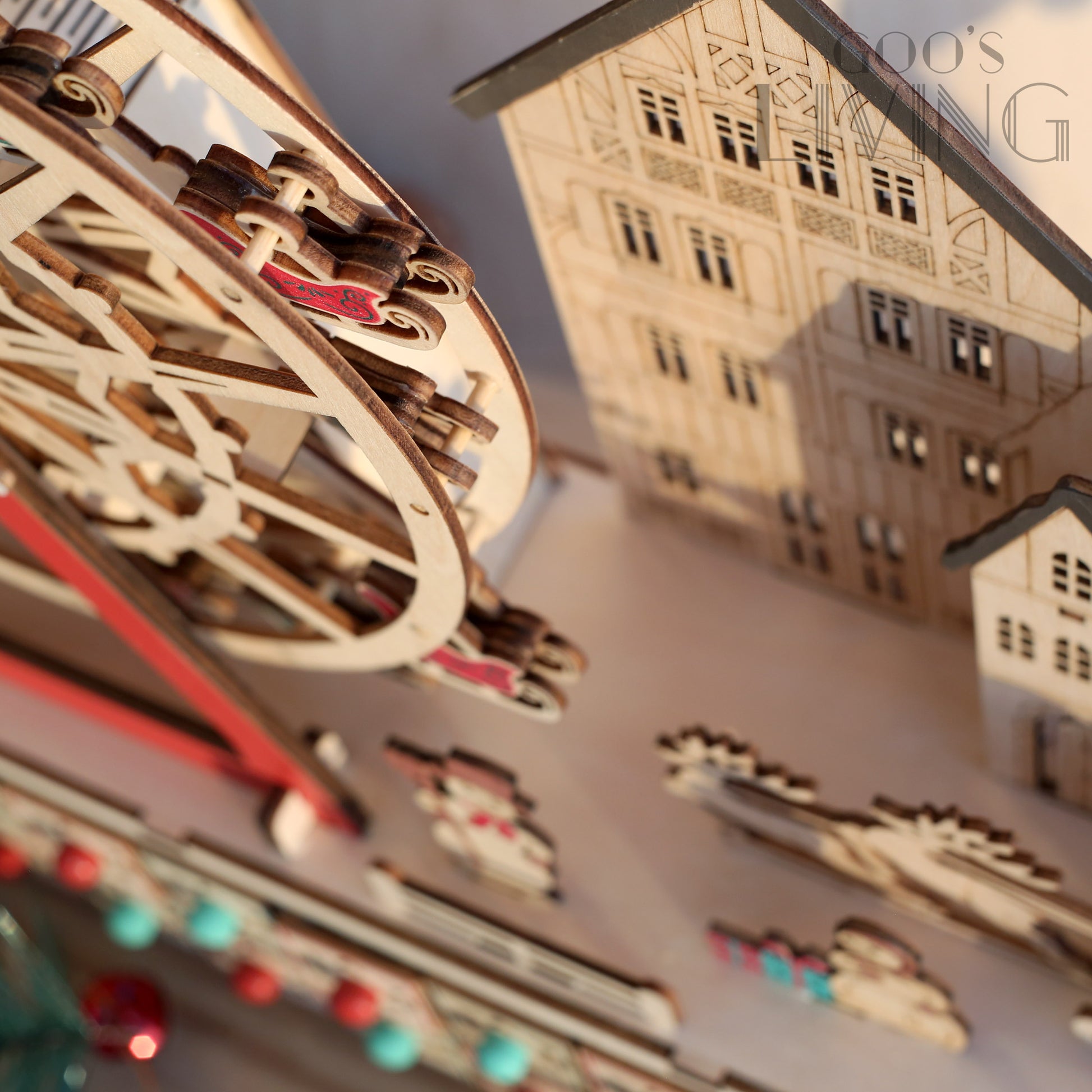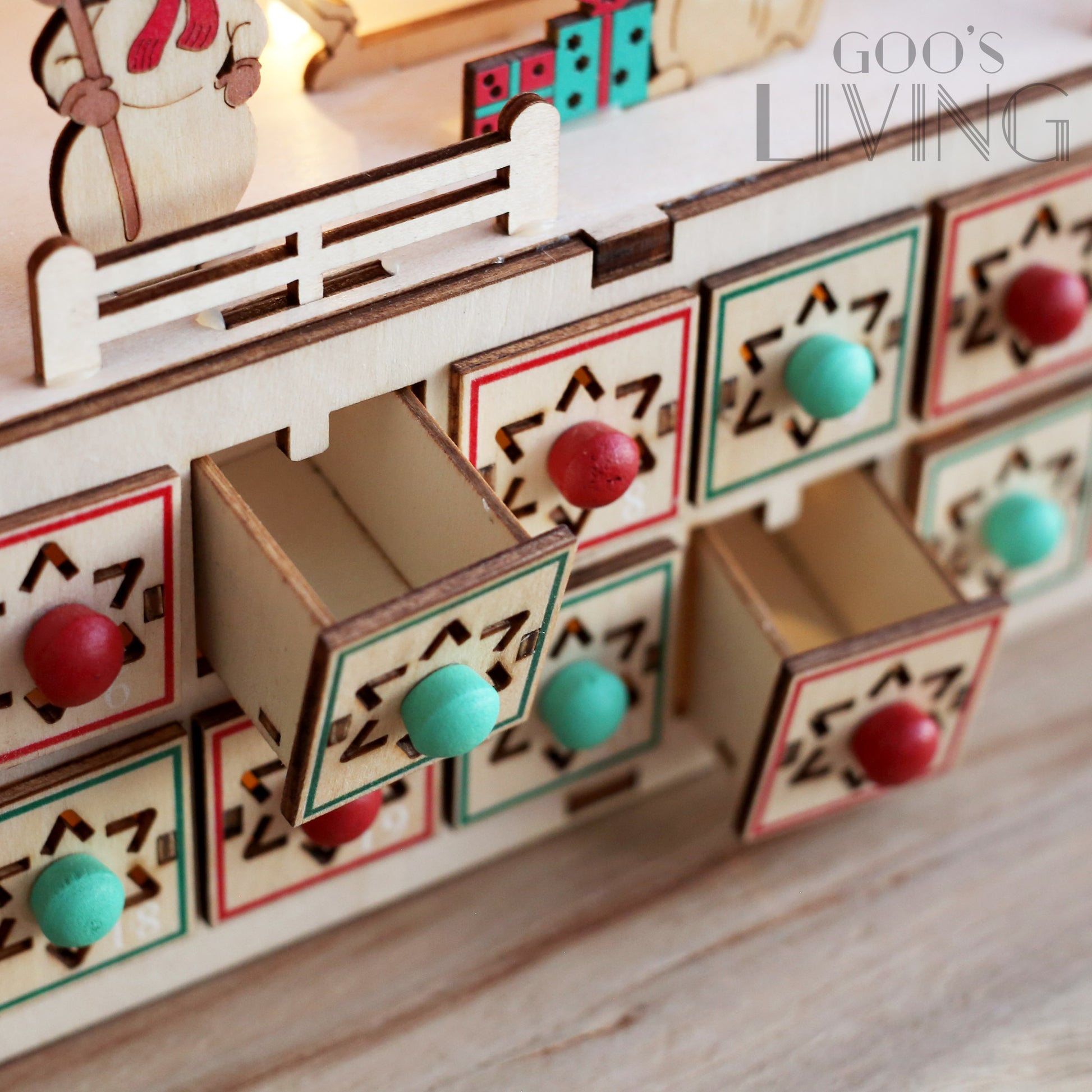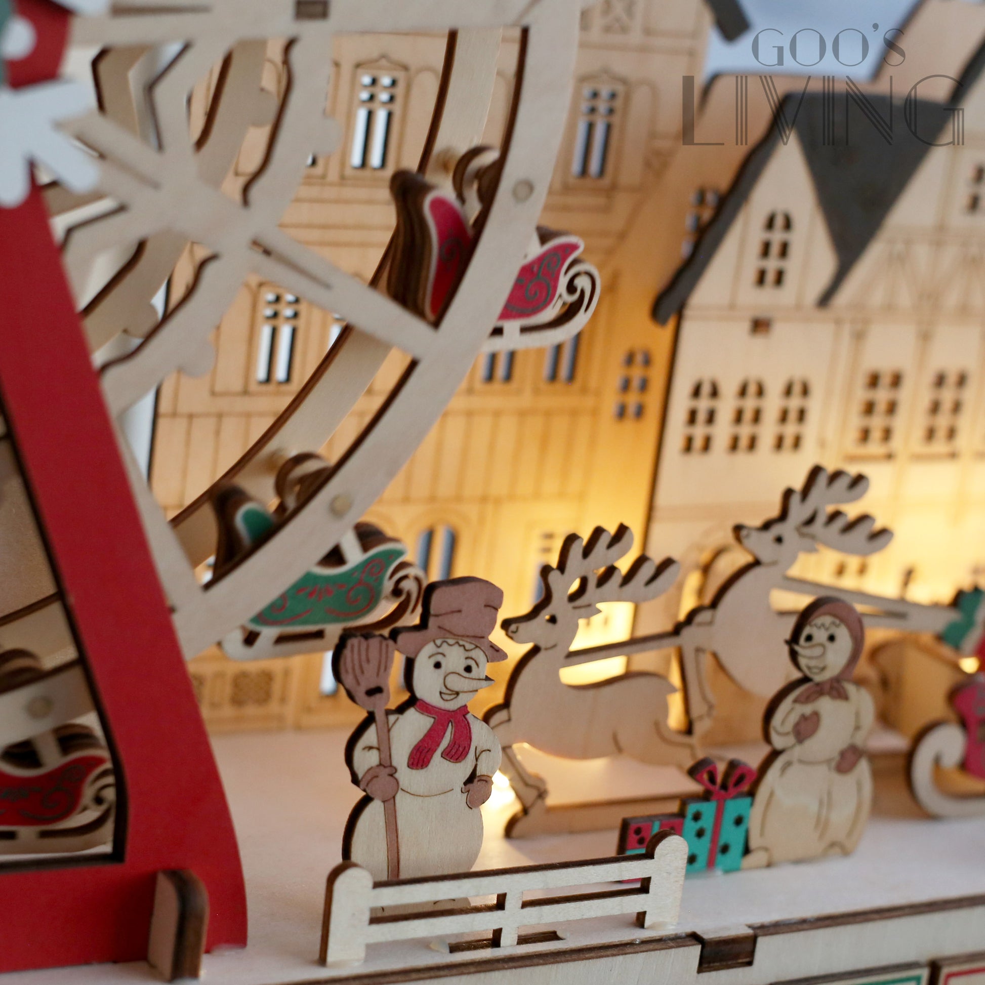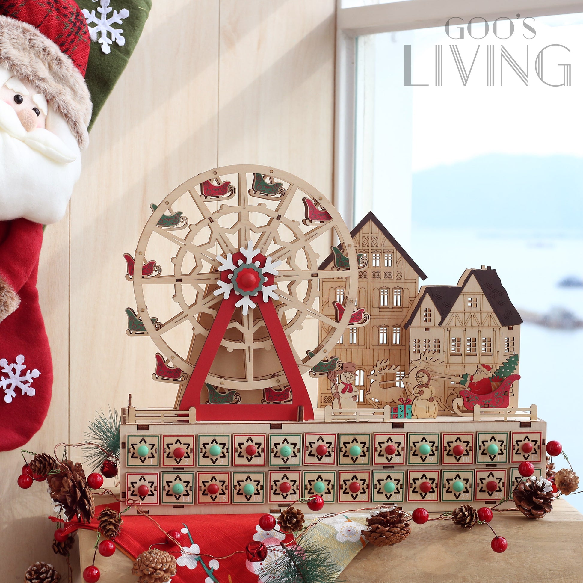 以聖誕摩天輪為主題的木製倒數日曆,由紅綠雪橇相隔而成,配以主軸的雪花圖案,聖誕氣氛十足,而入電後整個摩天輪更可轉動,節日感大增。摩天輪旁亦設有聖誕小屋、雪人與聖誕老人等聖誕元素,隨著LED燈亮起有著另一感覺,而摩天輪下的24個小盒子可在內放糖果或小禮物,讓你每天充滿驚喜。