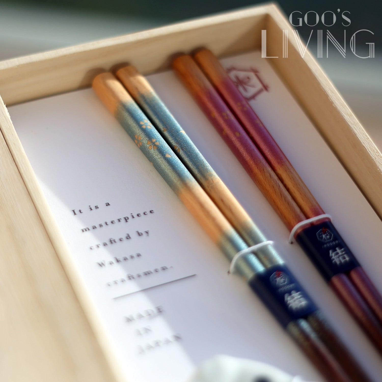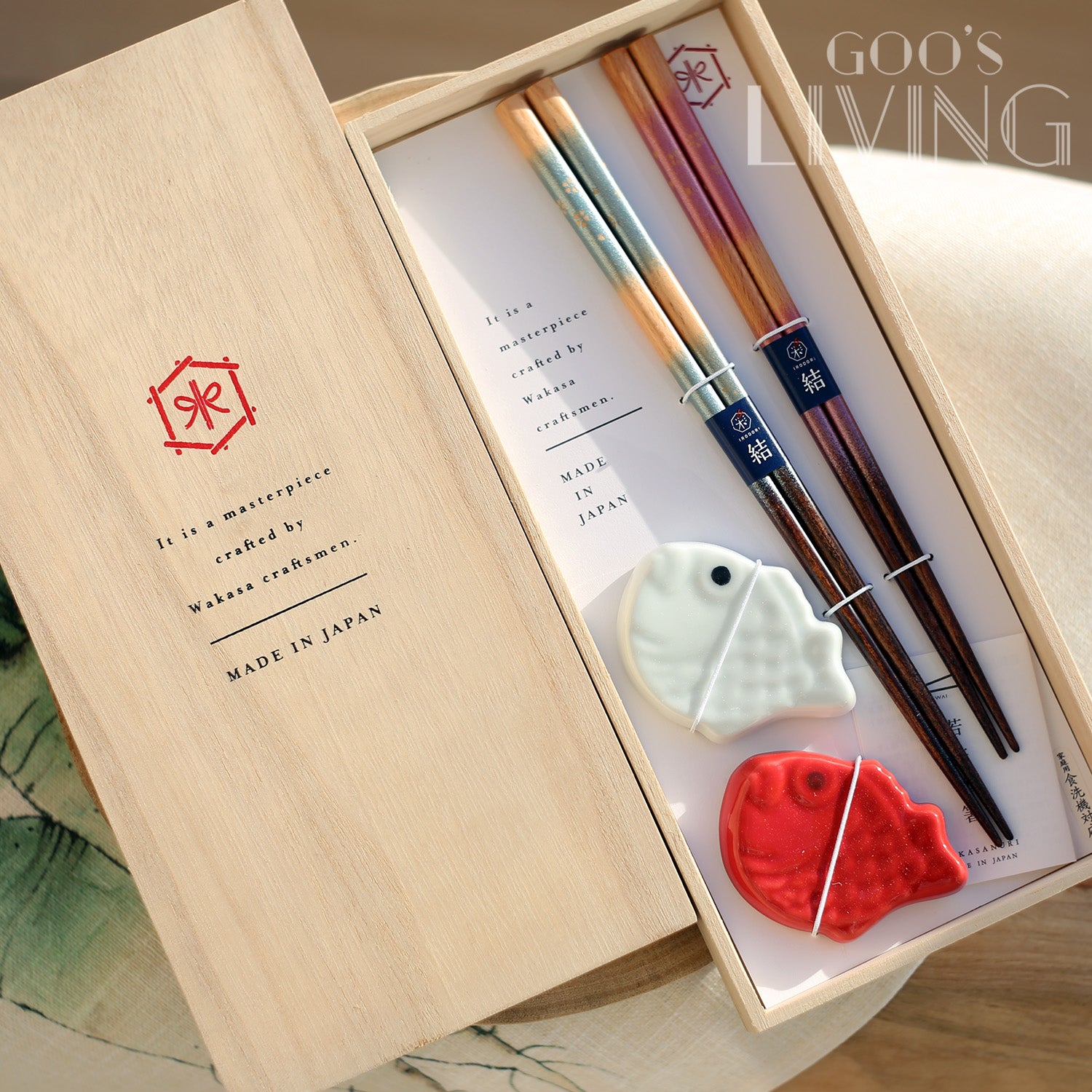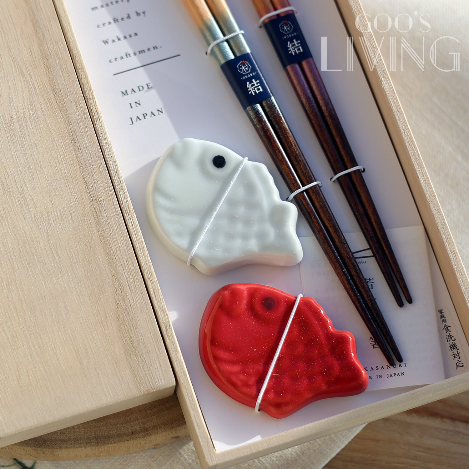 紅、白色的鯛魚分別打造成筷子托,配以木筷子上的粉藍與粉紅櫻花圖案,喜慶優雅兩兼備。兩雙木筷子更用上若狹塗技術,筷子托則用上波佐見燒。「若狹」是福井縣小浜市的舊稱,由小浜市生產的若狹漆器,製作工序繁複,需經過200次反覆塗抹,包括噴塗、貼貝殼、塗漆等,最後通過仔細打磨才能產生美麗的圖案,故早於1978年已被指定為傳統工藝品。