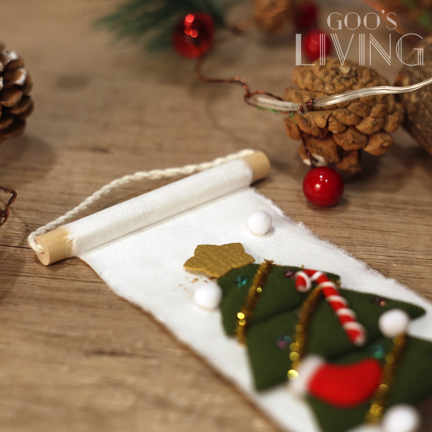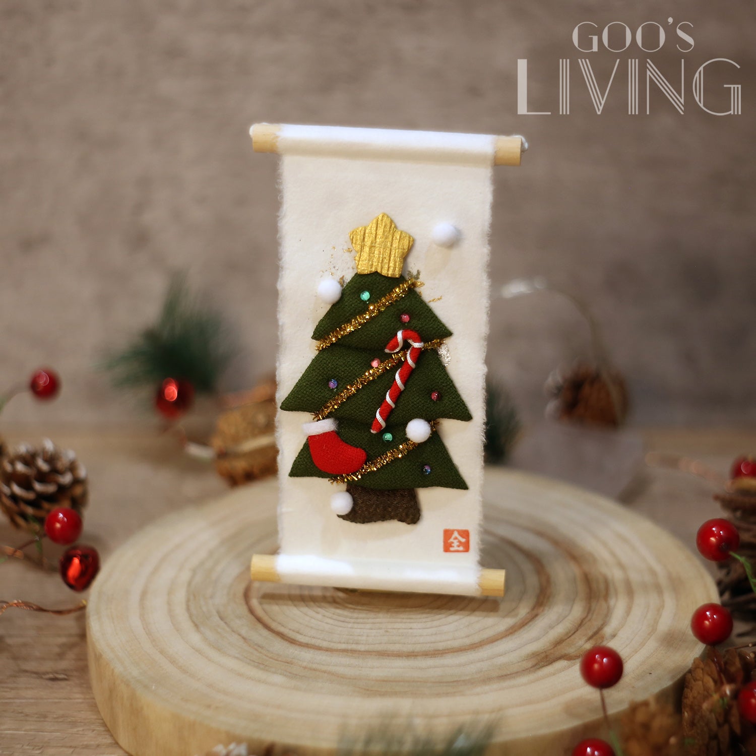 由日本紙和縐紗製成的迷你掛軸,由京都工匠全人手製作,以極講求手工技術的染色方法逐筆點上金銀箔,並剪出惟肖惟妙的聖誕老人或聖誕樹,擁有濃厚的傳統美。掛軸雖小,卻讓人一看難忘,有著強烈的存在感,亦相當適合裝飾空間有限的小蝸居,飯廳、睡房、兒童房或電視櫃上也可隨處佈置。