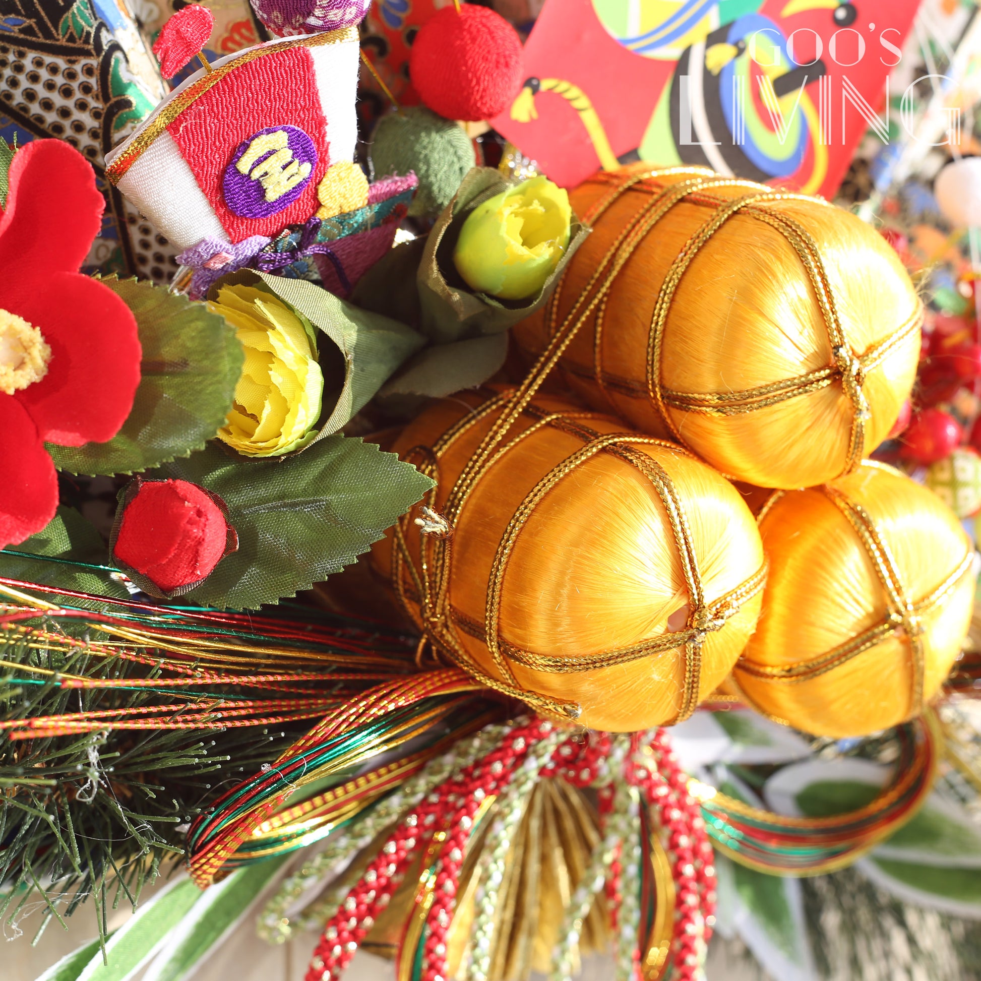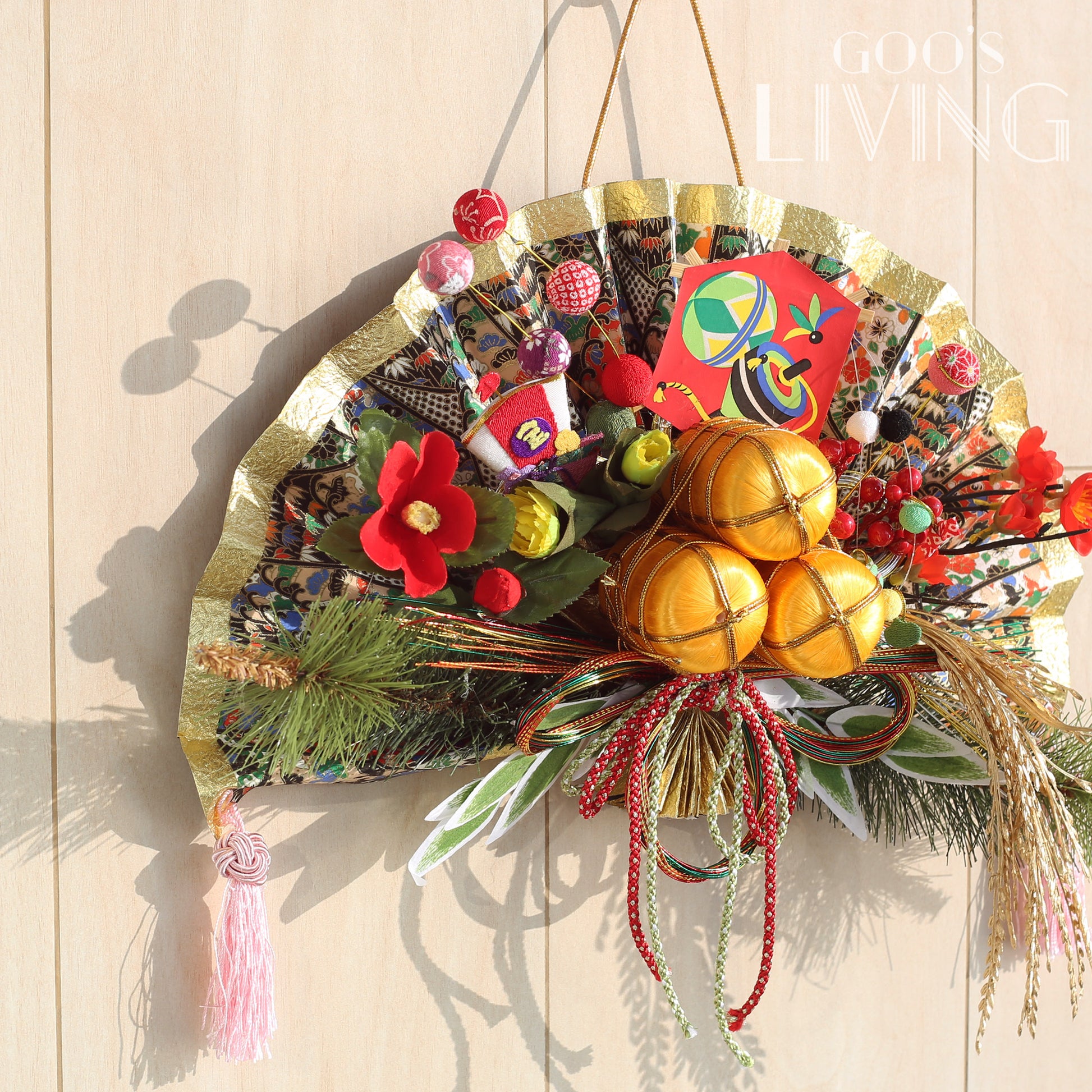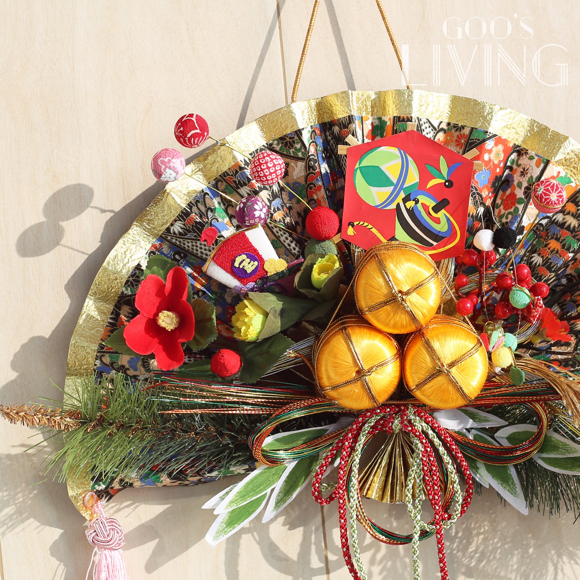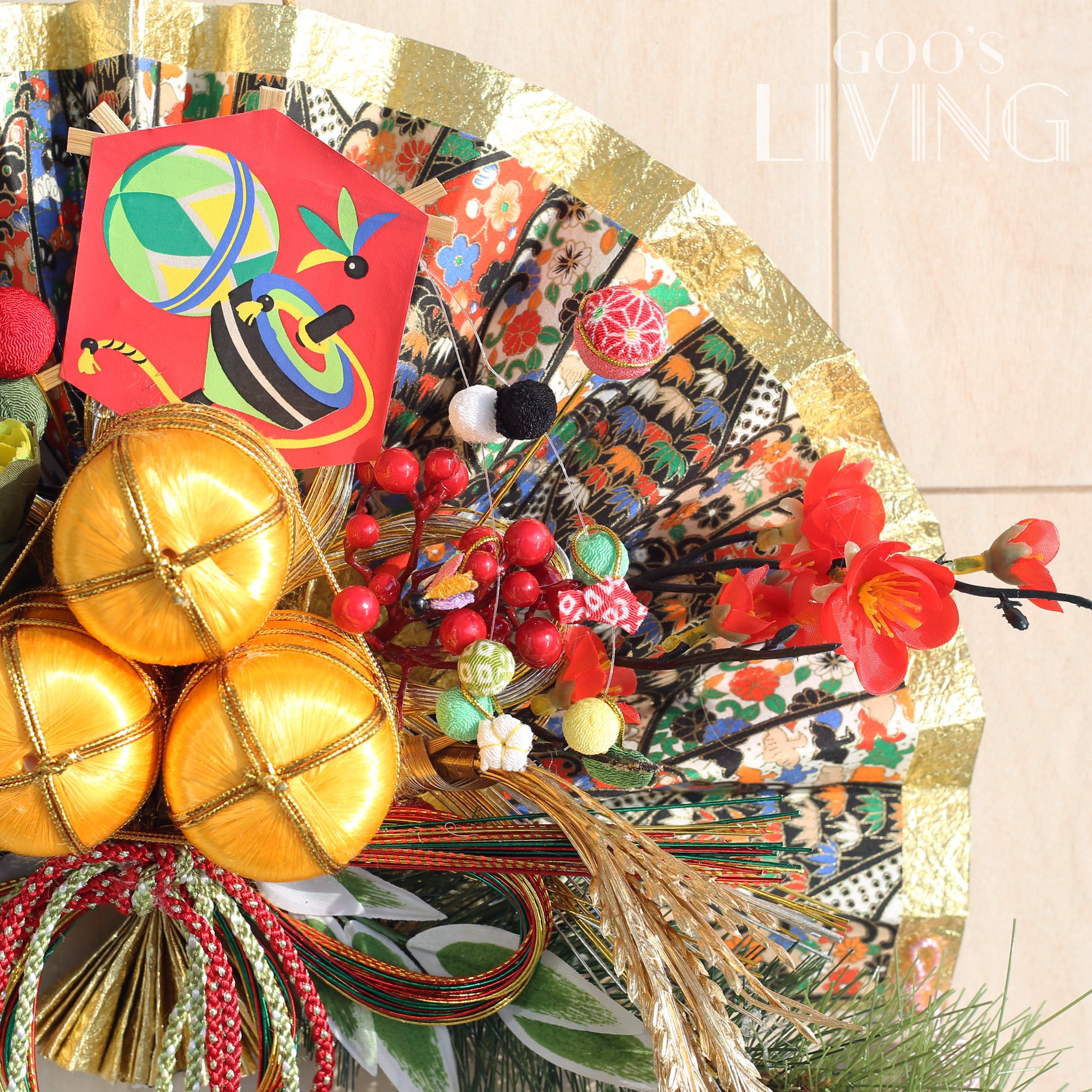 金扇在日本象徵繁榮與繁盛,與寓意五穀豐收、豐衣足食意思的金米桶和大麥相輔相成。而金米桶上的陀螺則象徵財源滾滾、順風順水,是新年必備的吉祥物之一,加上寓意著福氣與財氣的寶船,祝願新一年盆滿缽滿、衣食無憂。