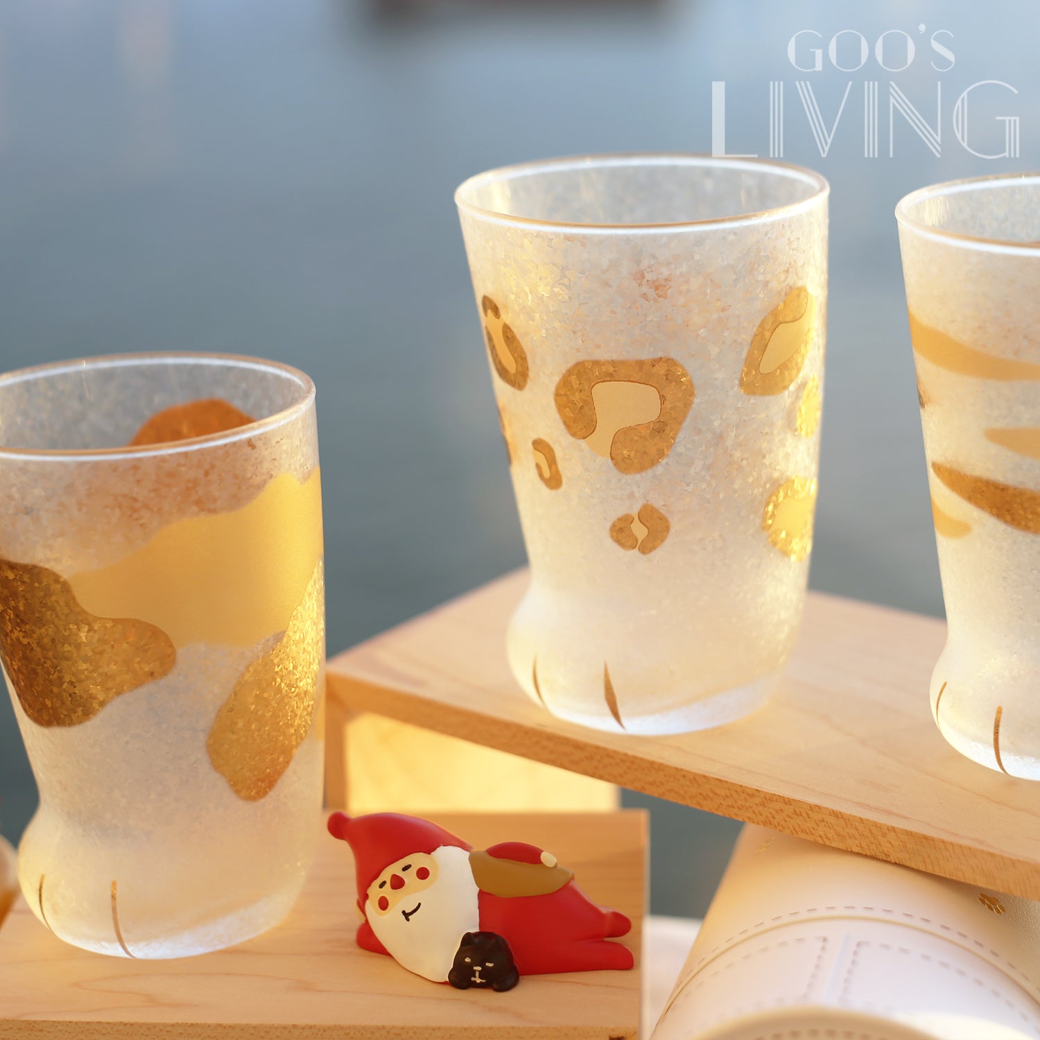 玻璃杯以貓星人的腳仔為題,可愛的造型配以獨特的結晶霧面玻璃,不但能減少水珠凝結,其玻璃表面更由工匠親手以金箔畫上不同的貓咪紋,與貓咪高貴的感覺不謀而合。當你倒入咖啡、可樂、牛奶或果汁時,就如看到不同顏色的貓腳,加上杯底繪製了可愛的金色肉球,更讓人愛不釋手。另,包裝盒採用了圓筒設計,並印上了燙金的貓咪腳印,份外可愛。