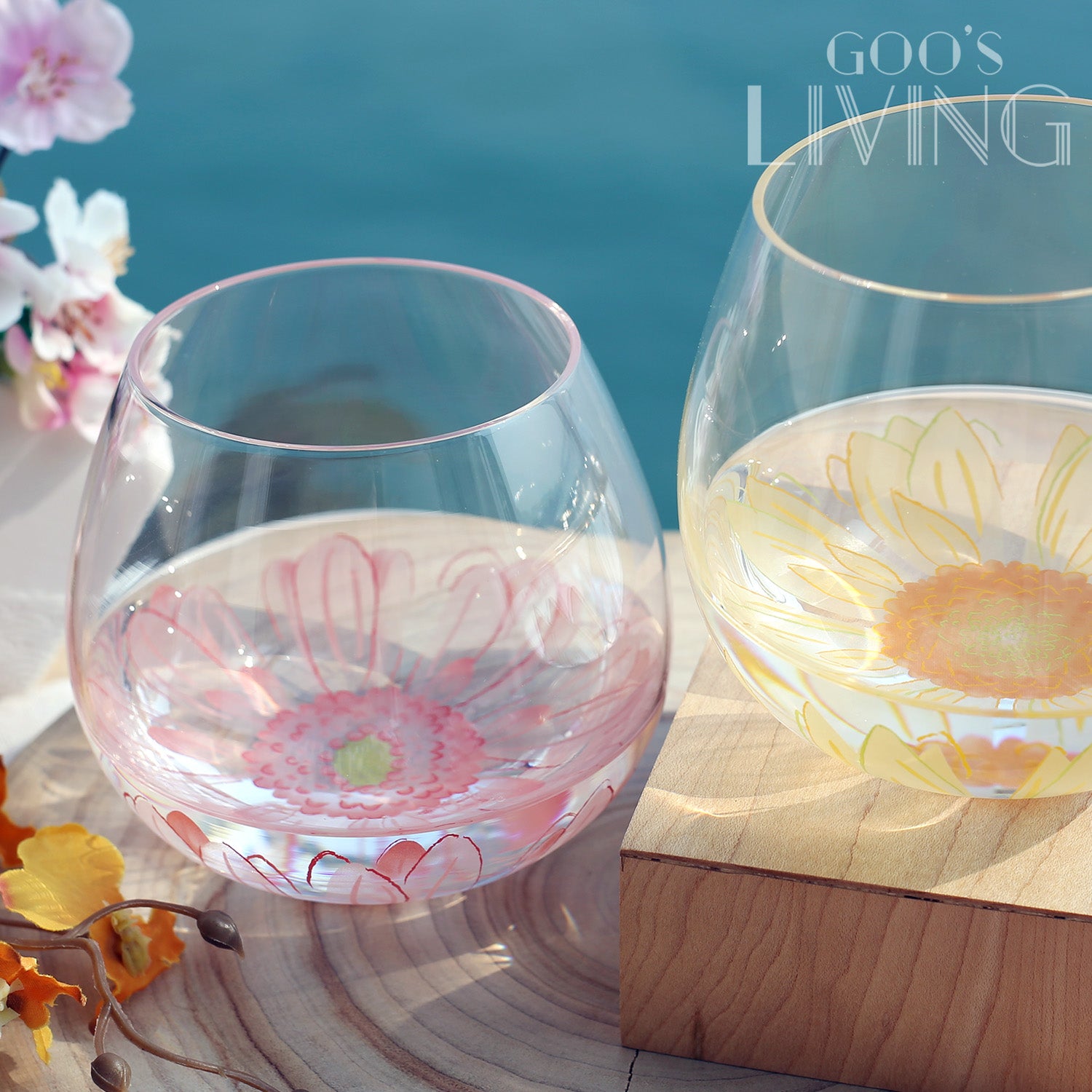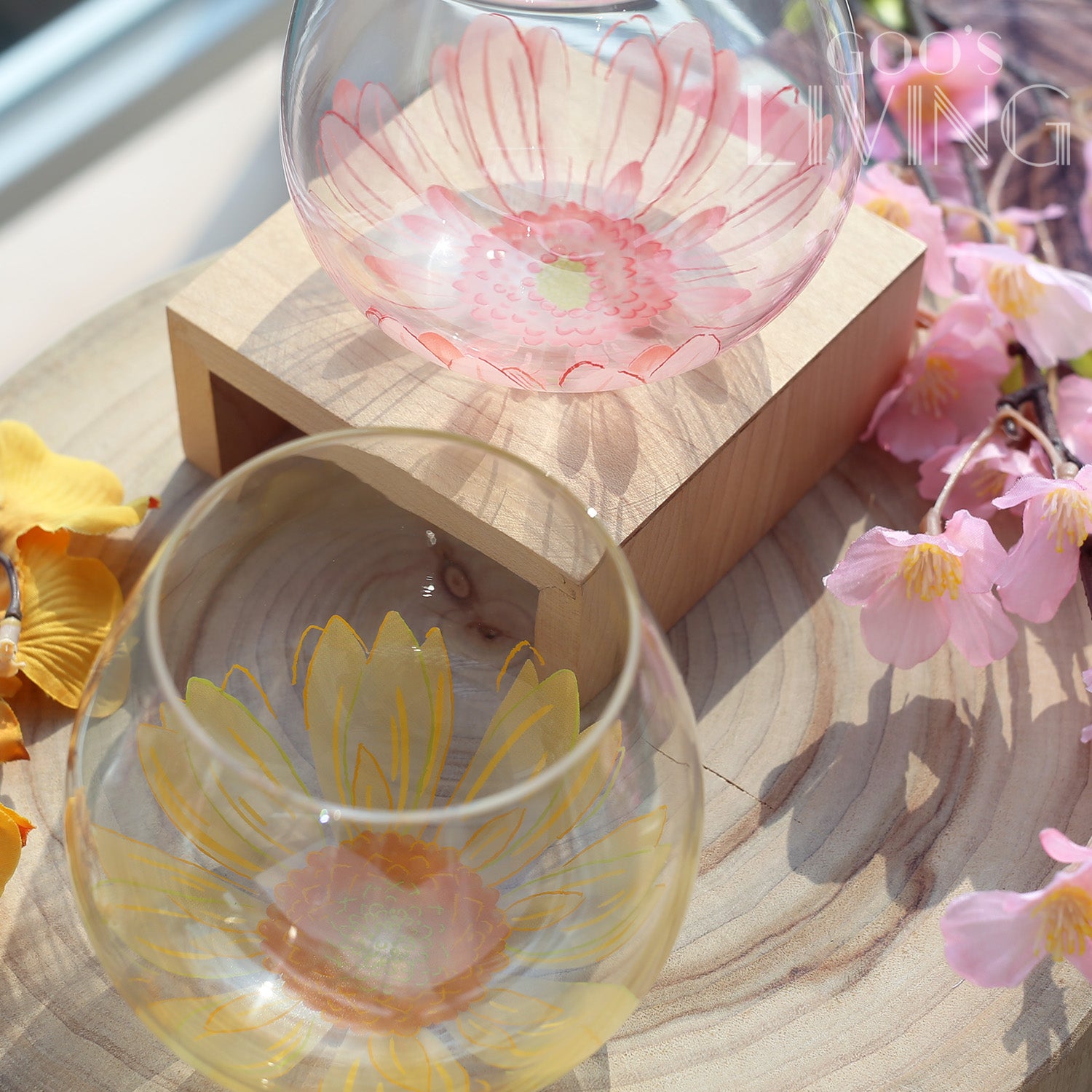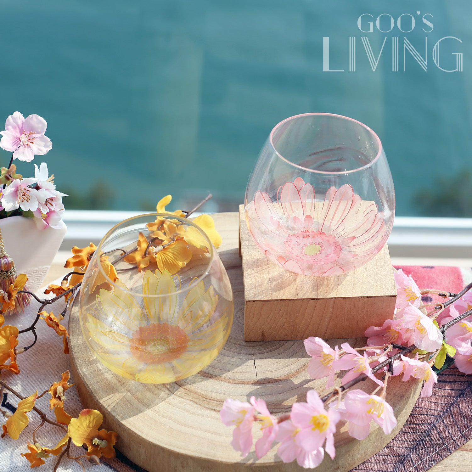 由東洋佐佐木推出的非洲菊不倒翁玻璃杯,美得不可勝收。製作成不倒翁造型的玻璃杯,加上佔滿杯底整個範圍的非洲菊,仍未使用已讓人賞心悅目。而只要將飲品倒進杯內,非洲菊更如在水中綻放,打造出每片花瓣都漂浮於水面上的視覺效果。看著花瓣在水中搖曳生姿的畫面,就如其花語一樣充滿正能量。