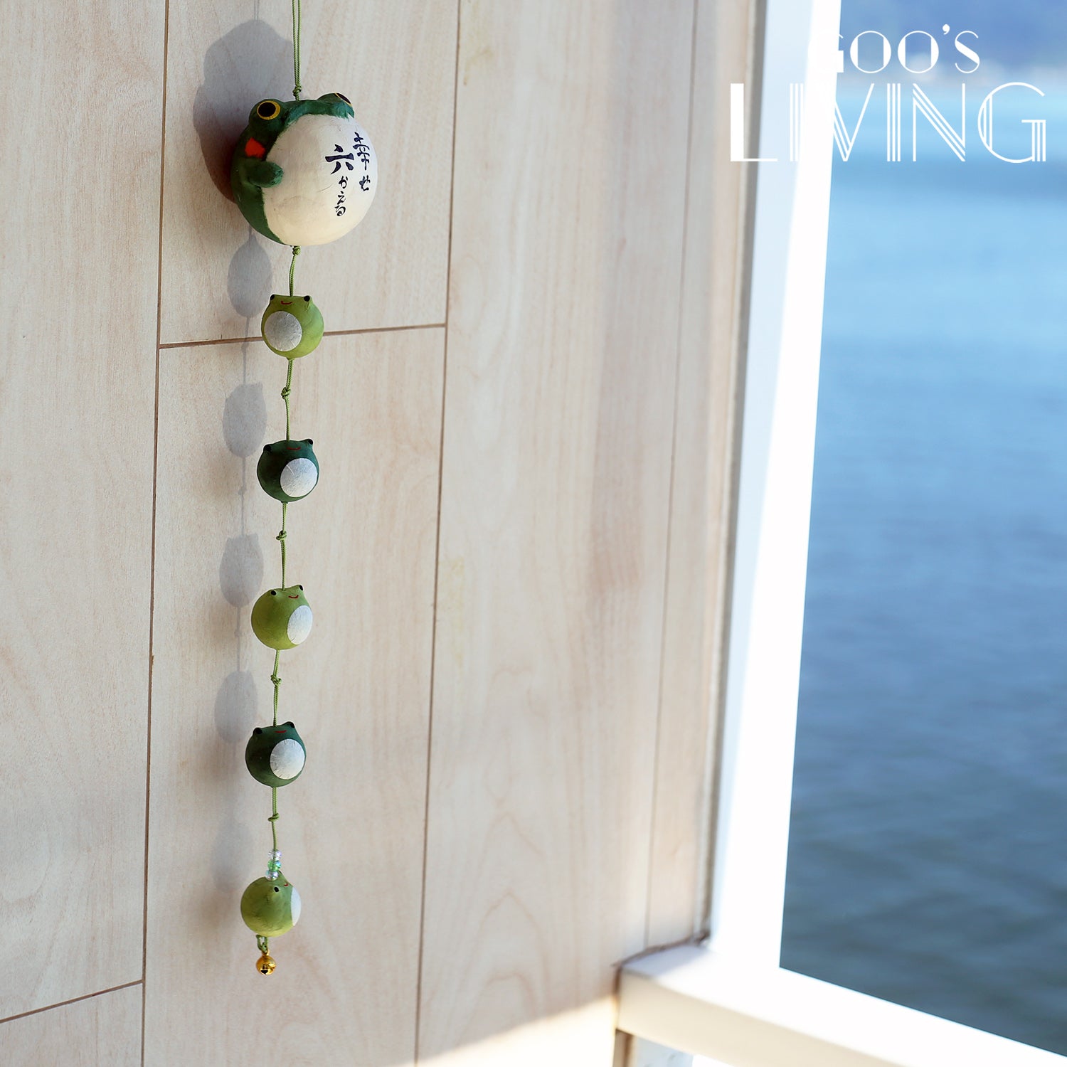 六粒青蛙與「迎接」的日語發音相同,配以肚子上寫著的日文「幸せ」,便有「迎接幸福」的意思。掛在窗邊或門前,伴著微風或每次開門的晃動,青蛙掛飾更會發出舒適的鈴噹聲,猶如福氣降臨,讓大家迎接幸福,獲得好運。