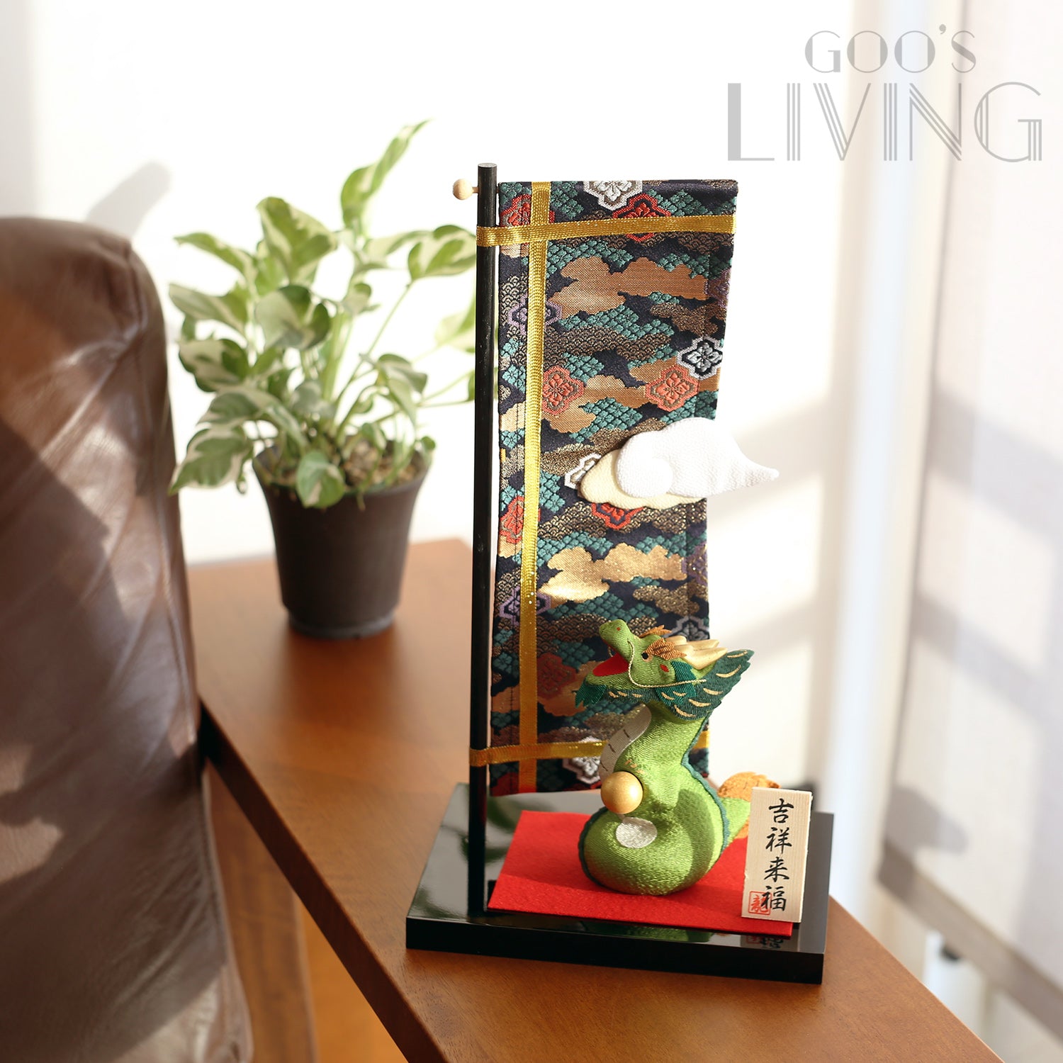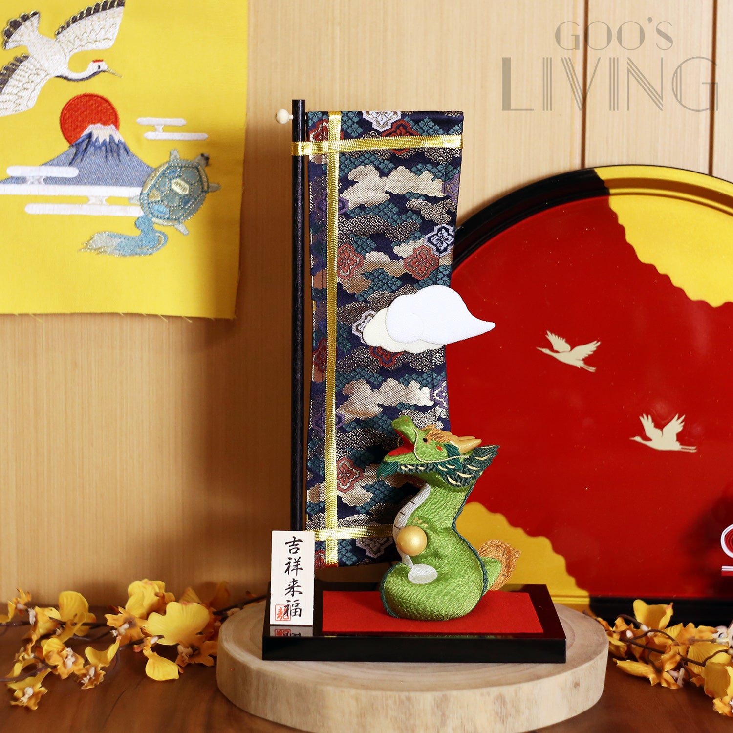 在日本傳說中,昇龍可憑藉其靈力在天空中自由飛翔,故常被描繪成增加運氣的吉祥龍,昇龍手中更持有「龍神球」,據說這球可助人實現願望,讓人心想事成。作為背景的旗幟亦設有雲霧圖案,全年助大家運氣上升。