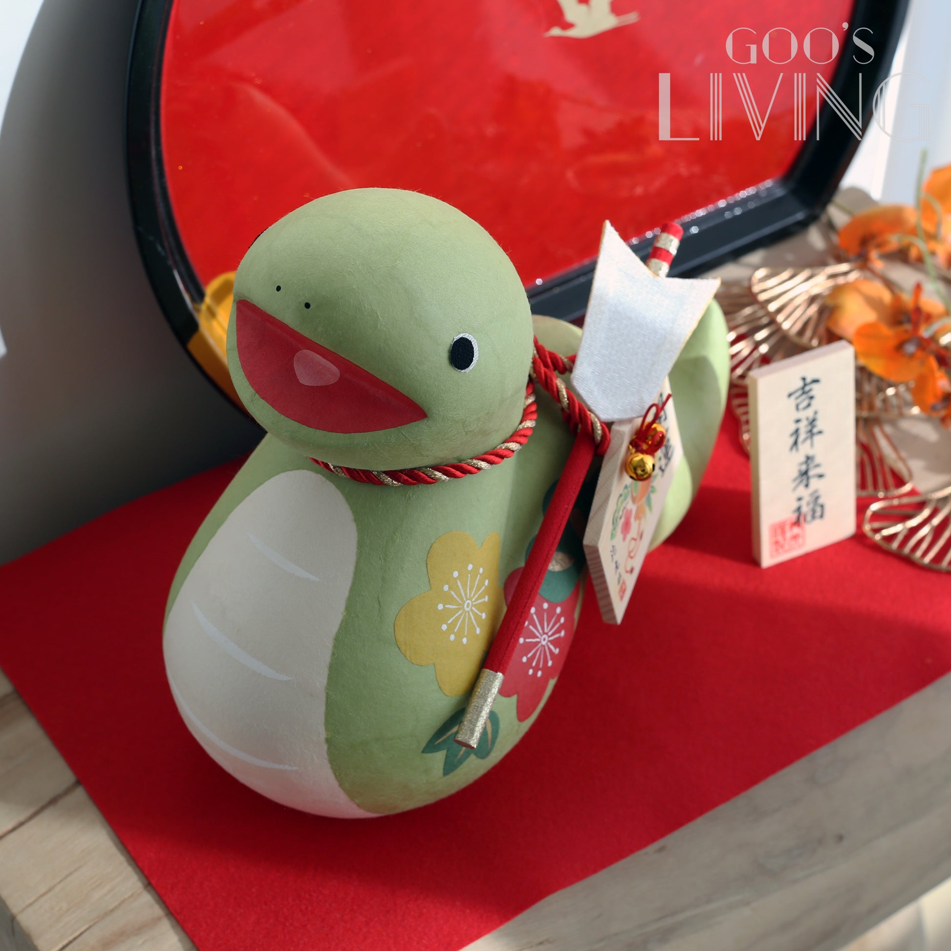 蛇在日本文化中的意義非常豐富,既代表財富智慧,也象徵了重生和力量之源。福蛇身上除了繪有寓意身體健康的松竹梅圖案外,還背著日本傳統的祈福用品「破魔矢」,與一般的箭相比,破魔矢是沒有箭頭的箭,有「破除妖魔、袪邪避厄」的象徵,加上寫有開運的繪馬,更有願望達成的雙重寓意。