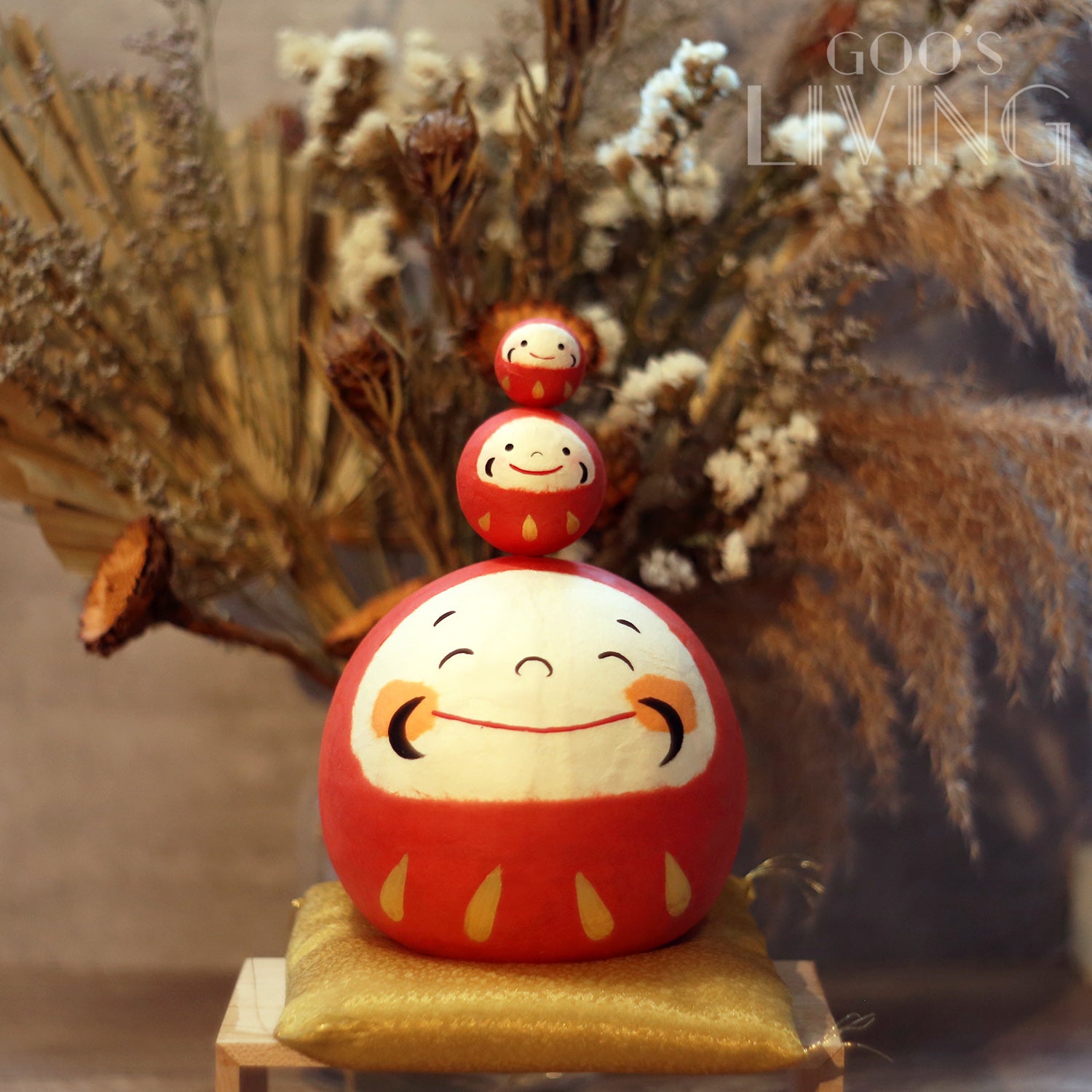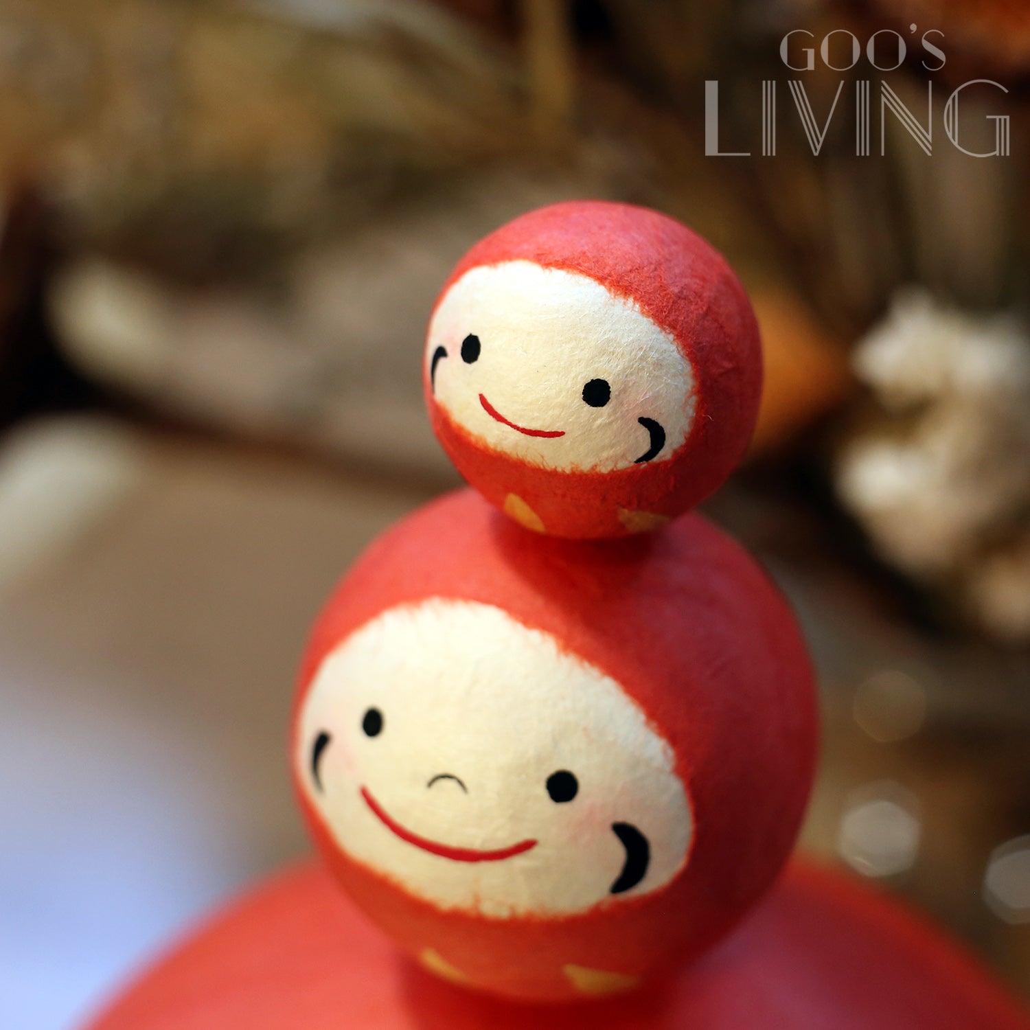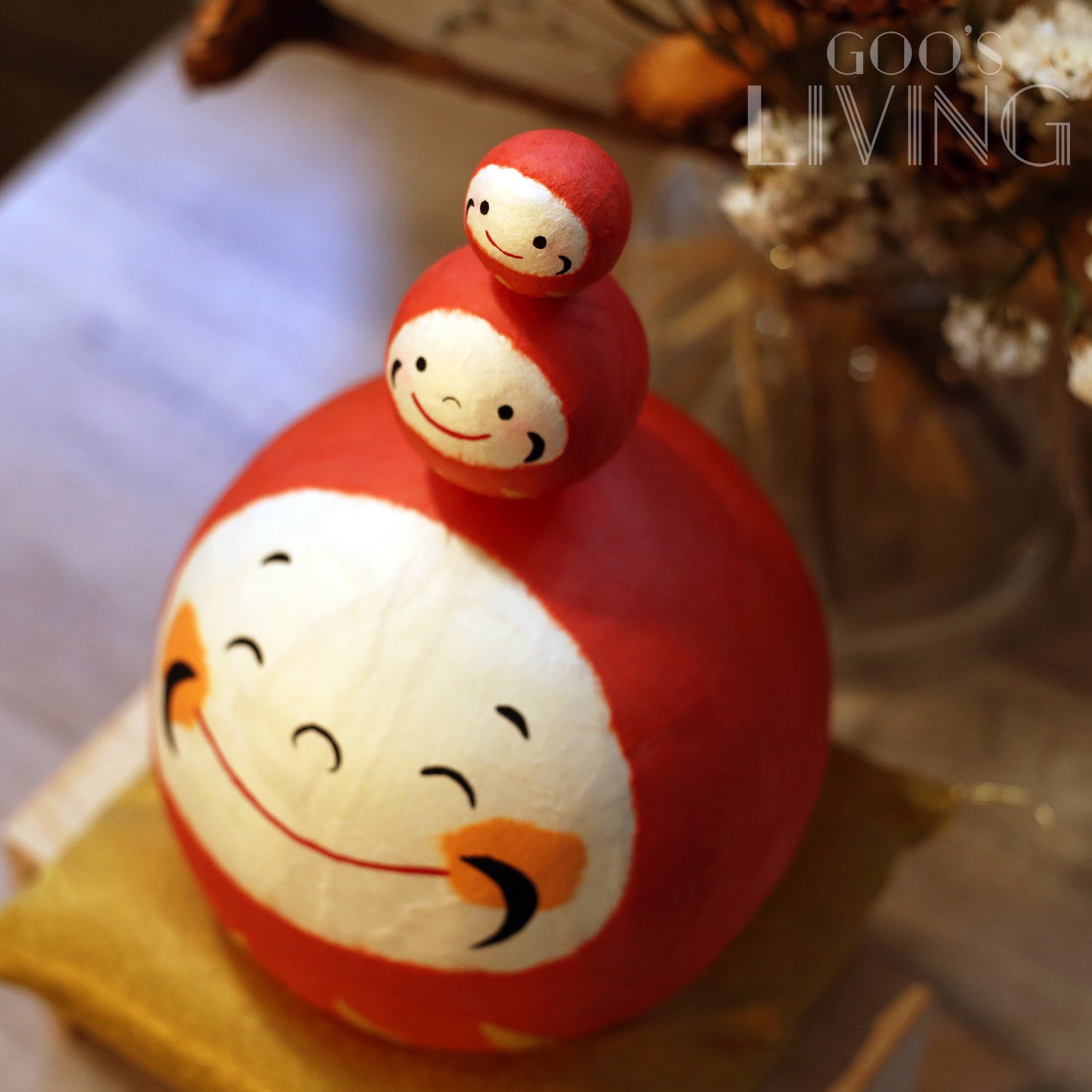 達摩是日本非常流行的吉祥物,亦是最具代表性之一的緣起物,不少人均會在家中或辦公室放置達摩擺設,作招運之用。圓鼓鼓的達摩多是粗眉大眼,配以一副霸氣的神情,而RYUKODO推出的和紙三福大達摩則有著治癒的可愛表情,笑咪咪、圓滾滾的眼睛讓人越看越快樂。紅色的達摩更有消除厄運、家宅平安之寓意,同時亦有「七轉八起」的精神(只要堅持不放棄便能達成願望),三個達摩疊在一起,為你帶來三倍福氣,即使什麼事也打不倒你。