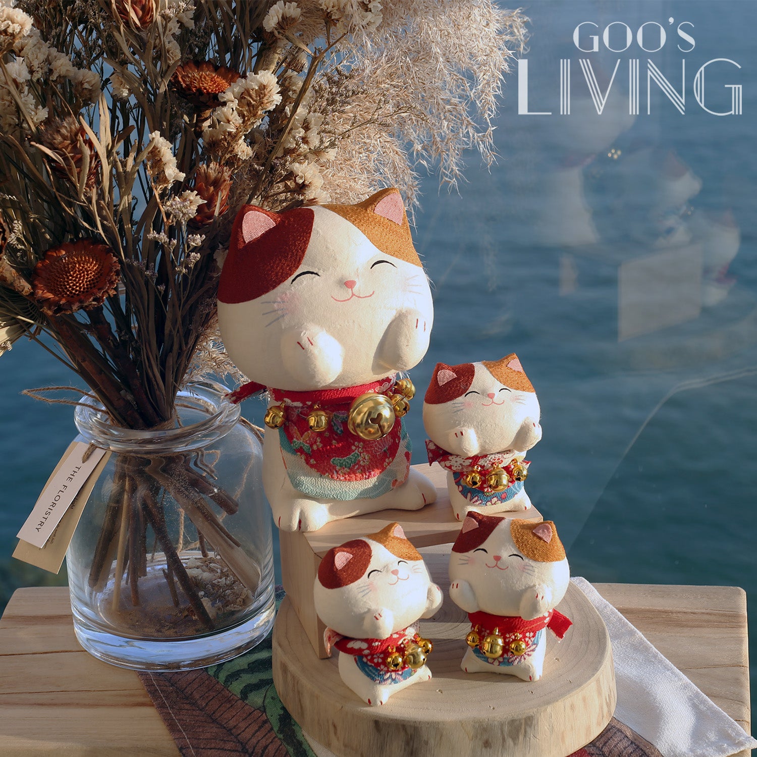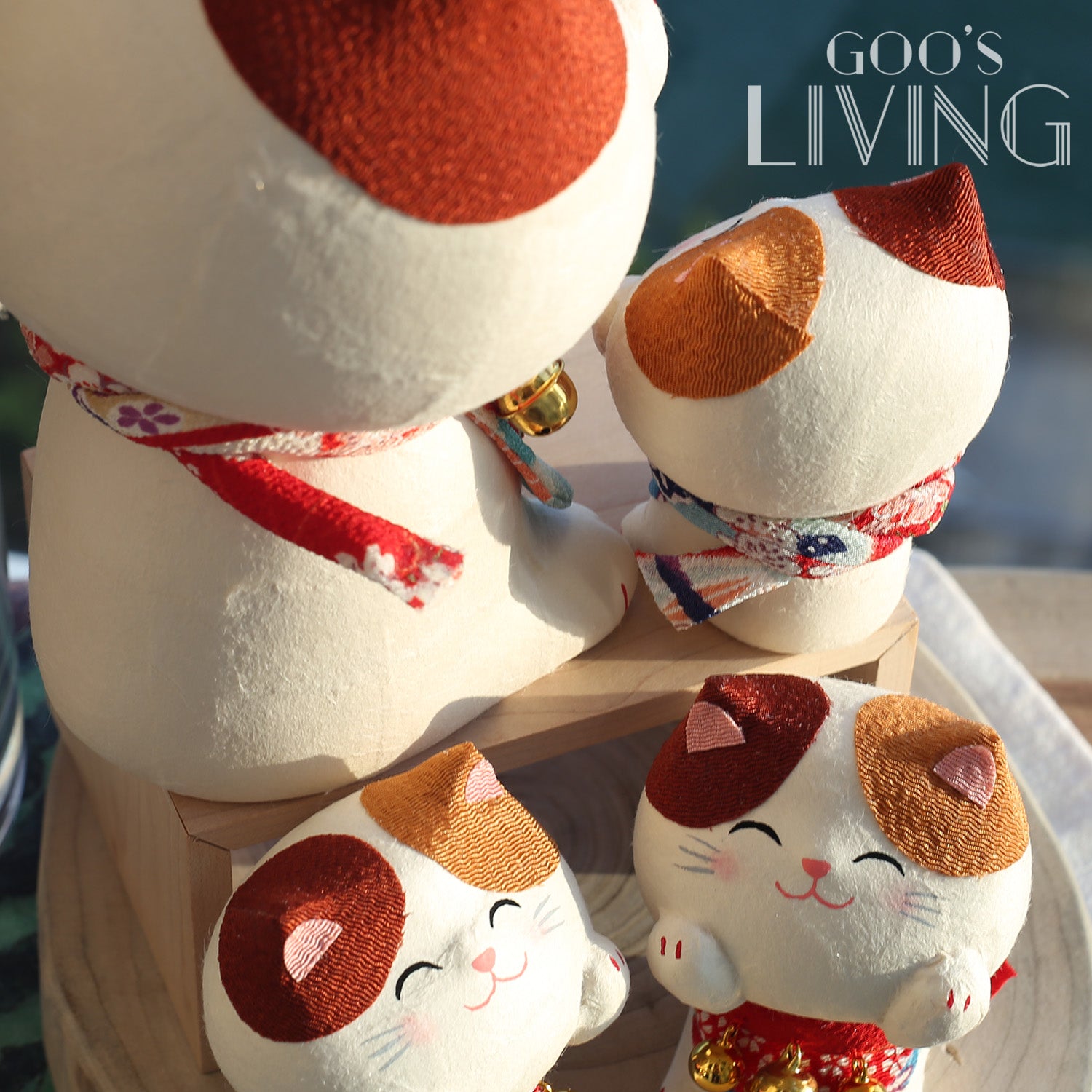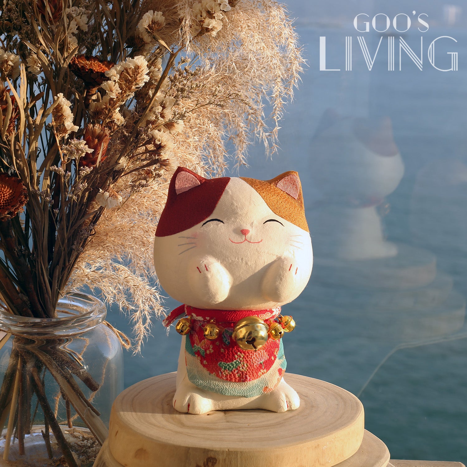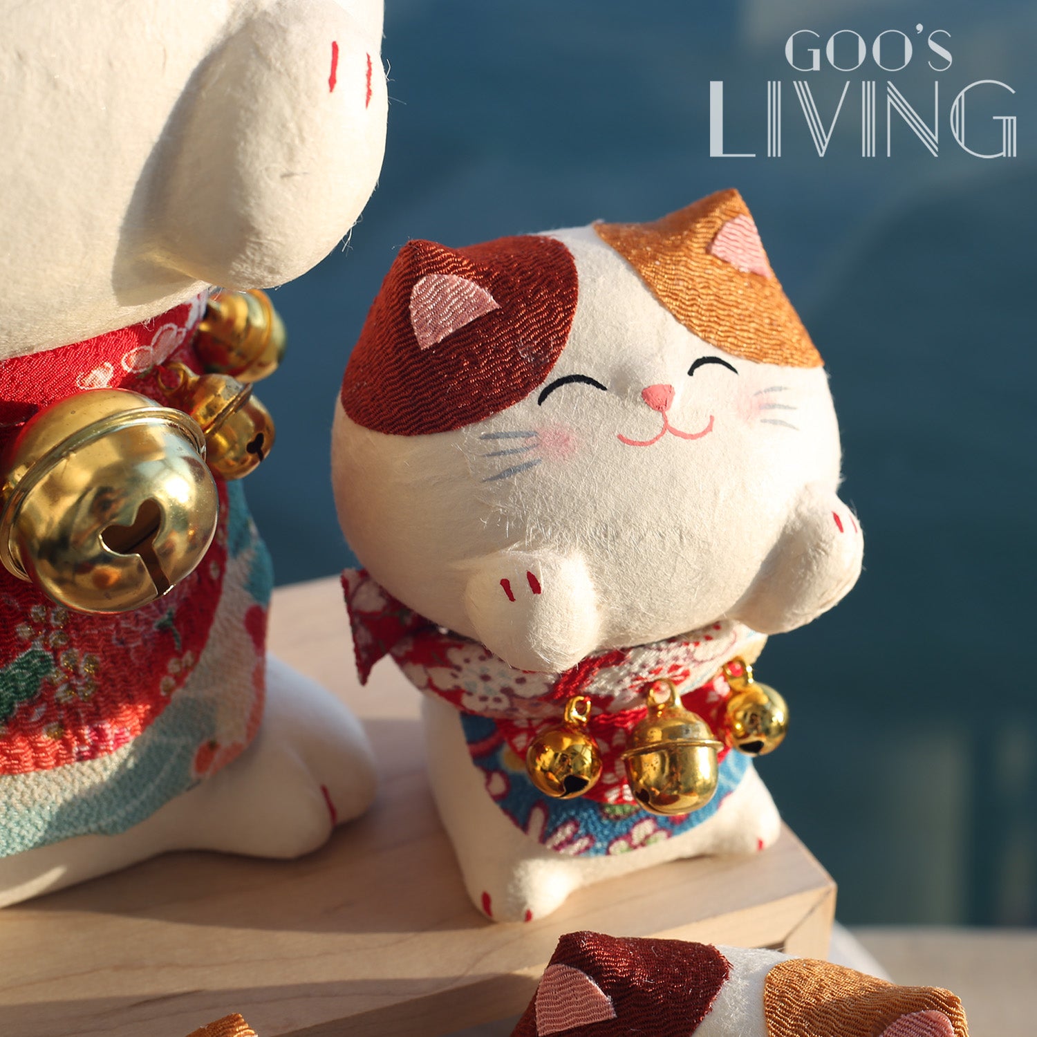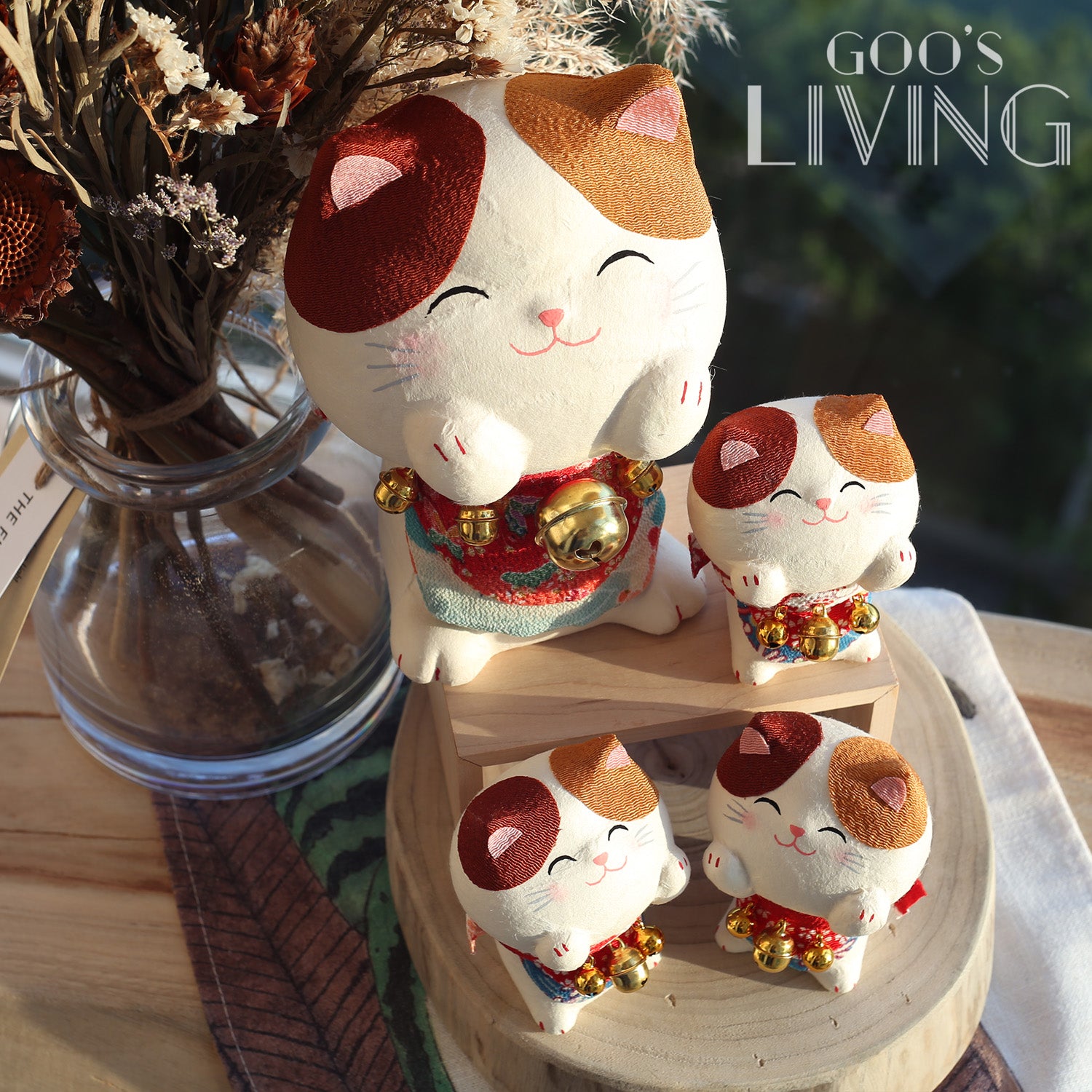 日本招財貓「右手招財、左手招人緣」,舉起雙手的招財貓自然是為大家實現兩個願望,以雙手舉起的大頭貓咪猶如捧著臉頰般可愛,配以身上可辟邪和召喚福神的三個鈴噹,務求為大家帶來好運財運。而19cm高的大大頭鈴噹貓,較8cm高的鈴噹貓多了兩個鈴噹,越多越響的鈴噹自然越多好運,最適合放於玄關或店鋪內。