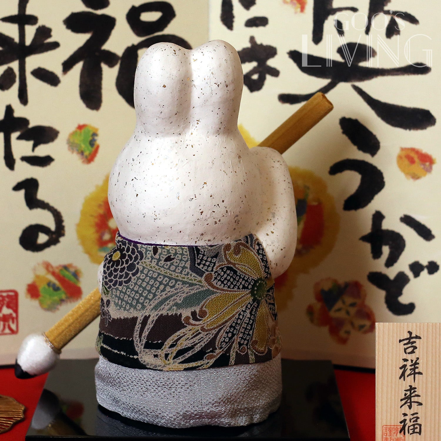 古時候的日本人在新年視筆時多會寫下詩句,如今則會寫上今年的目標或願望,也有一些常用字句,如是次的特大書法兔,就在屏風上寫下「笑門福來」,意指只要保持開朗充滿歡笑,福氣運氣就會來臨。特大的兔子氣勢非凡,手上的大毛筆更造了磁石設計,讓你可隨時改變筆頭方向,不論放在廳中或辦公室內均同樣奪目。