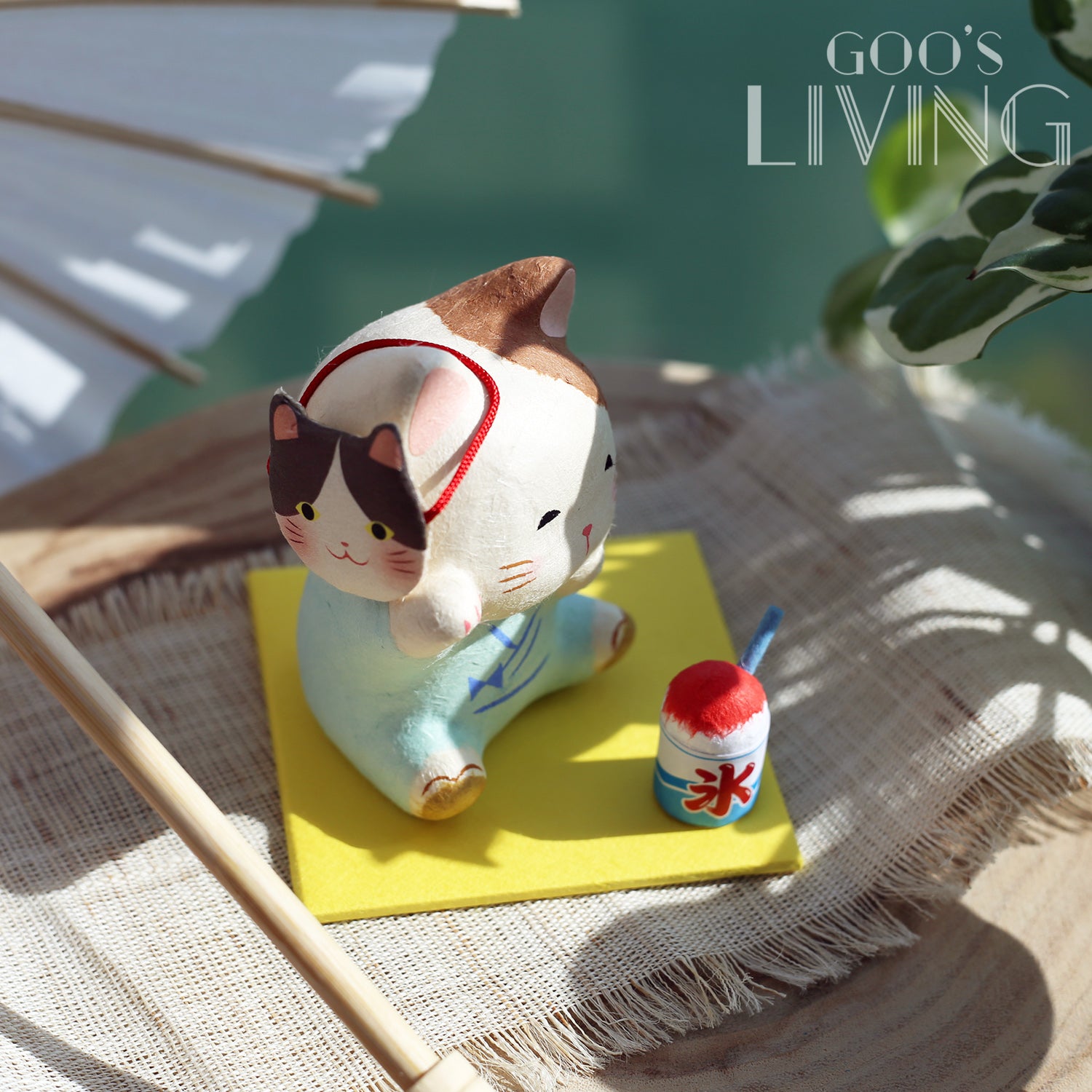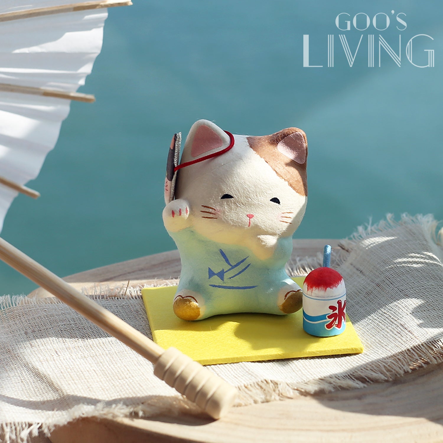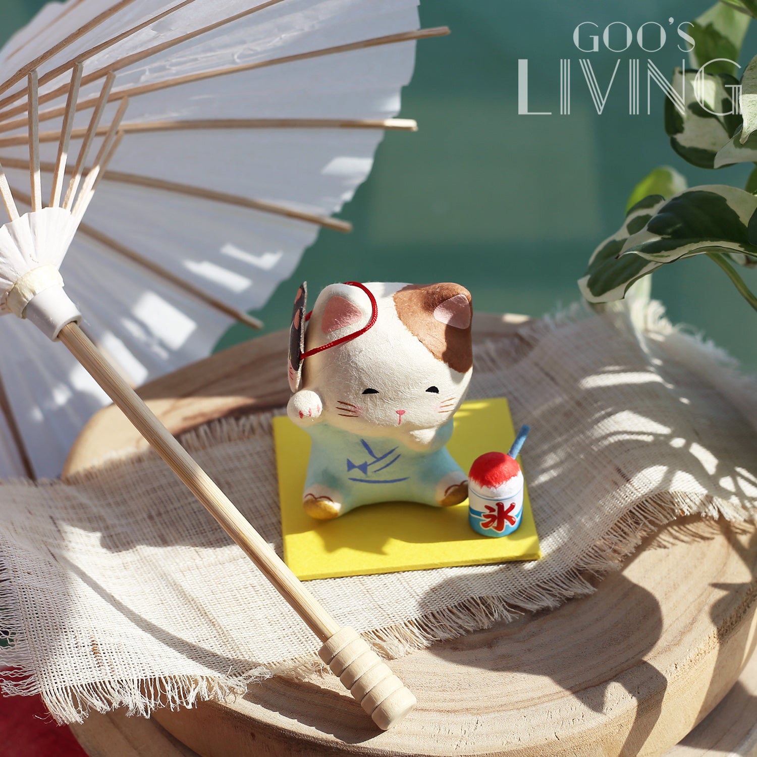 受日本戲劇影響,日本人多會在夏日祭典期間穿上浴衣,一邊享受美食,一邊欣賞各式節日活動。是次的BB貓咪就以此為題,穿上粉藍色浴衣為大家招財招福,耳上更掛著祭典必備的面具,配以附設的小沙冰,形成日本夏日常見景像之一,活潑可愛。