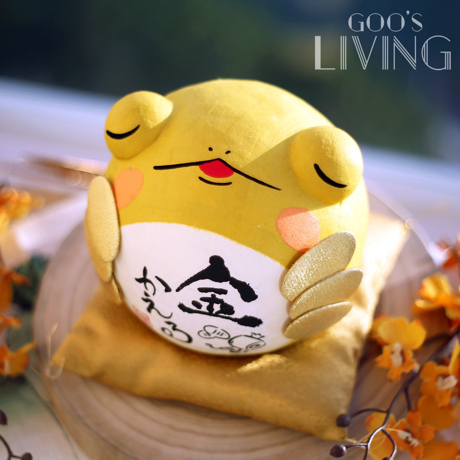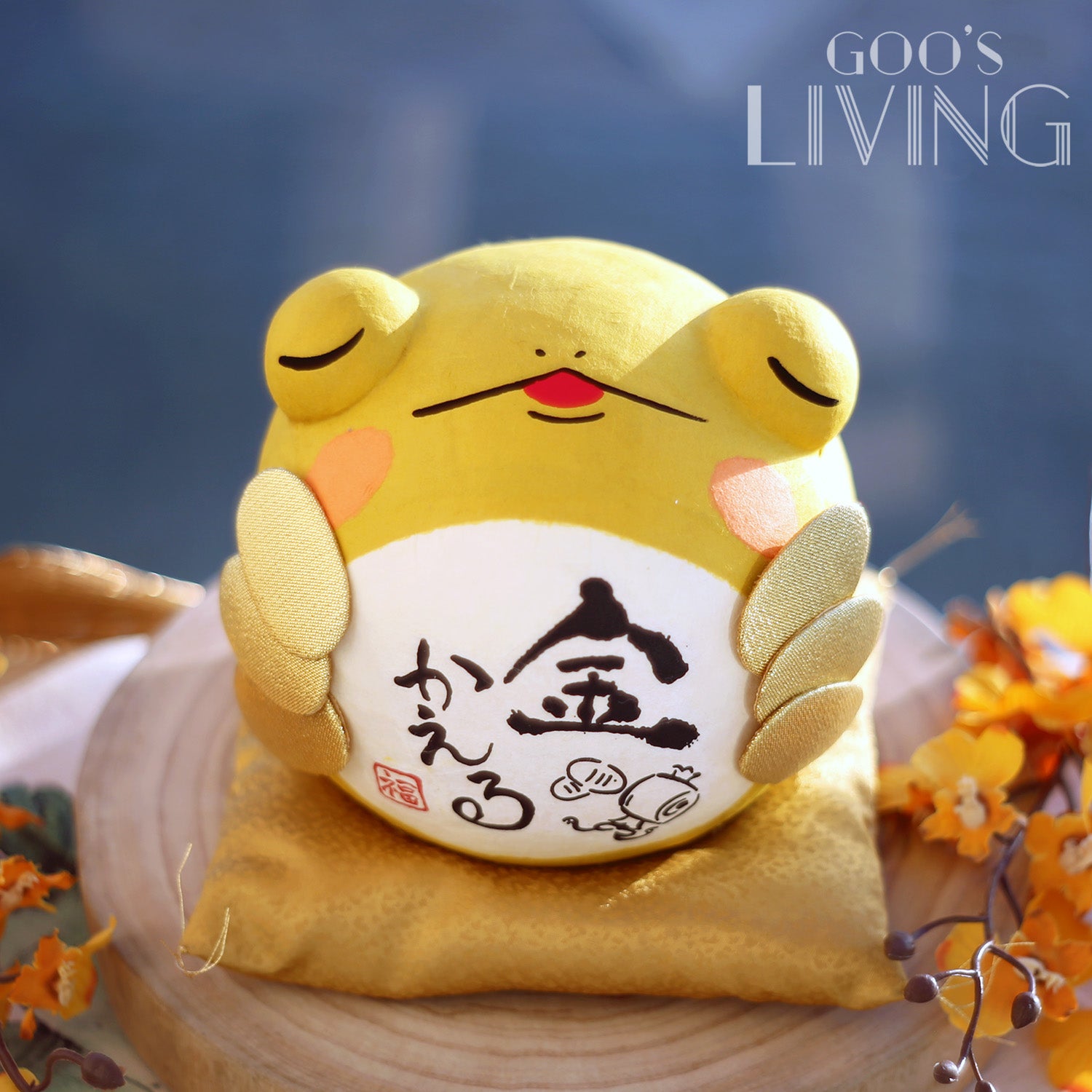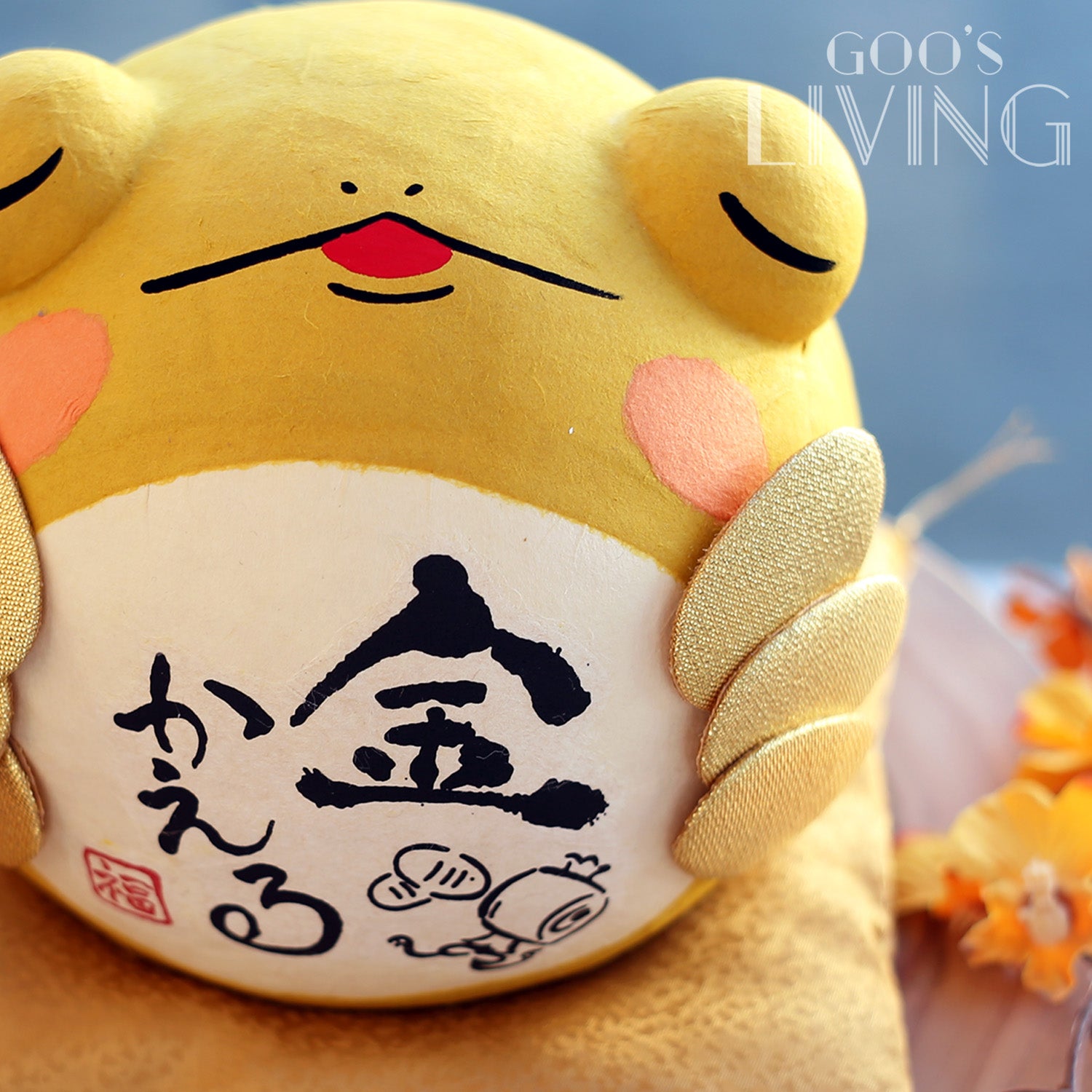 青蛙有化險為夷、財運亨通的寓意,加上一雙大大的眼睛,樣子趣怪可愛。有別於以往的綠色青蛙,是次的青蛙穿上了黃金甲,以金蛙姿態與大家見面。肚旁兩則更貼了六個小判金幣,配以肚上的「金」字書法,全方位為大家招財,賺到盤滿缽滿。