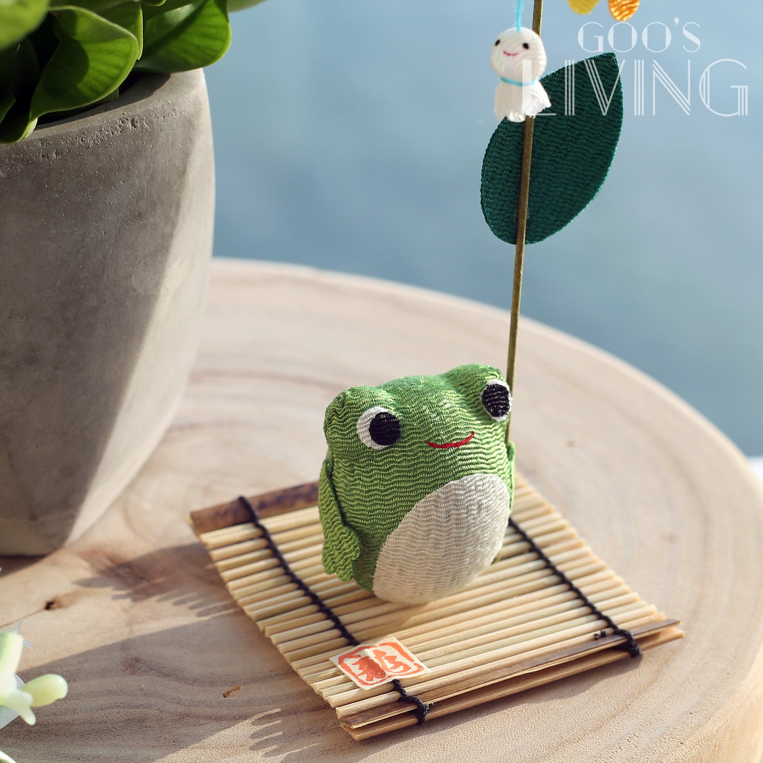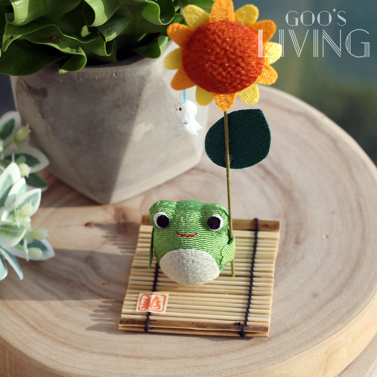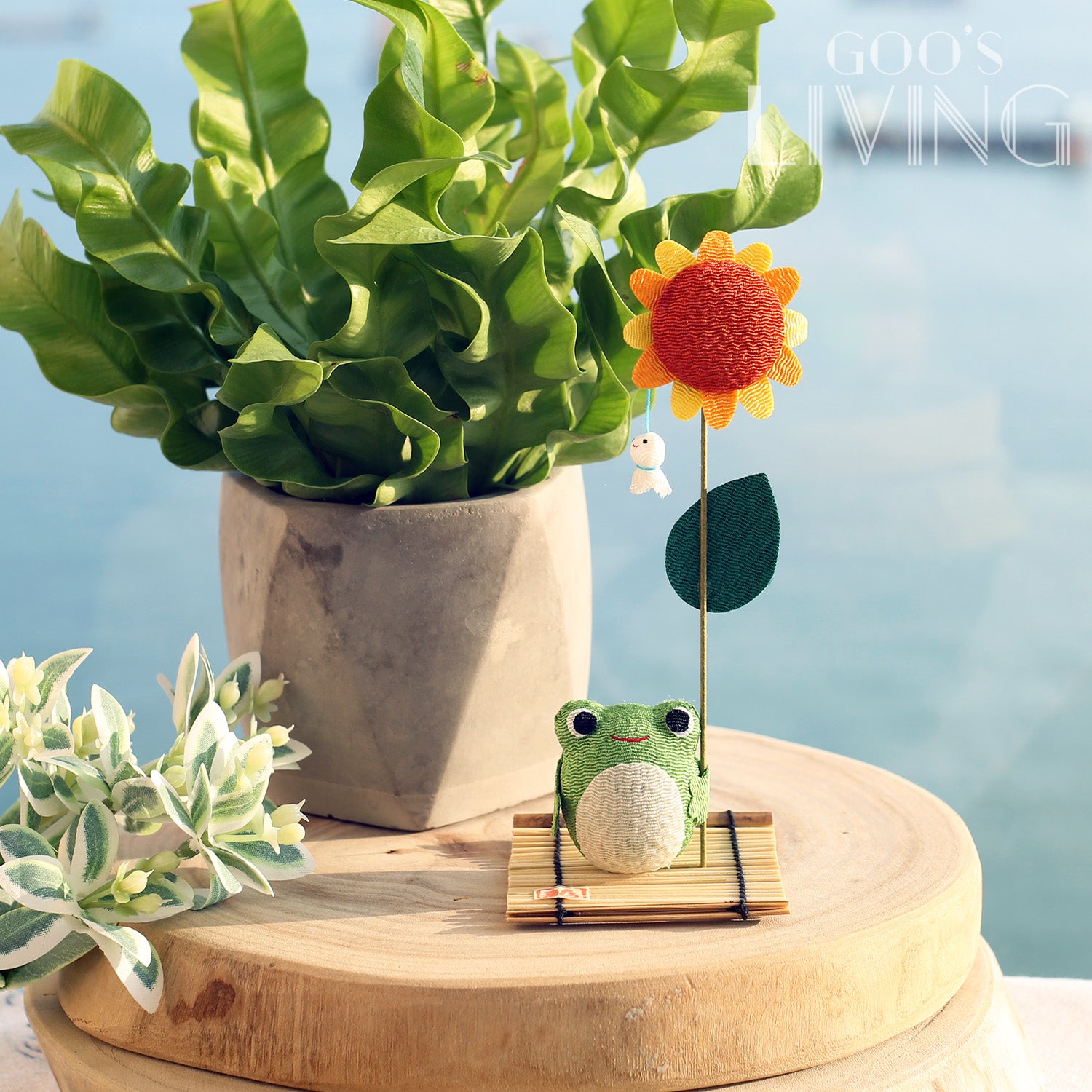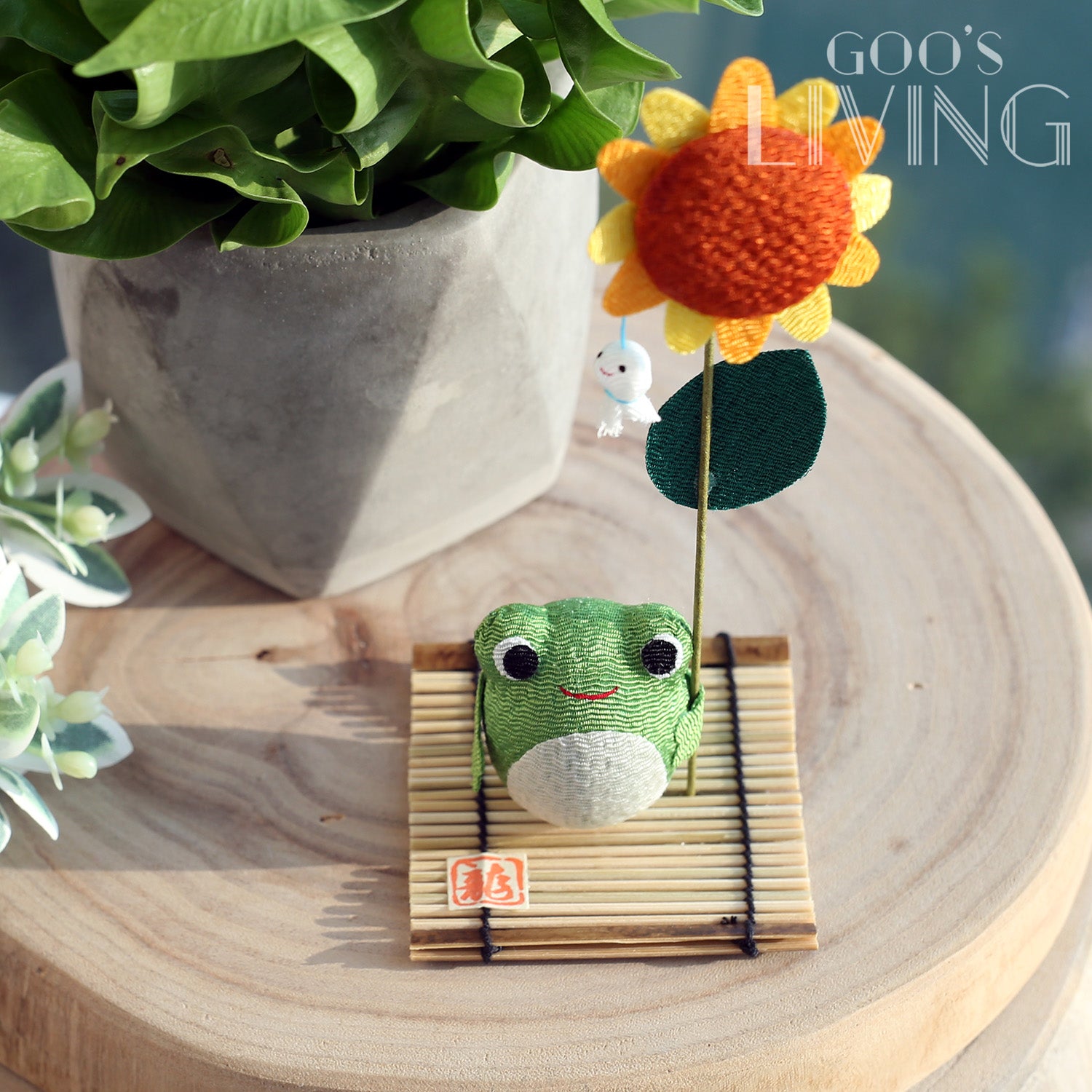 青蛙在日本一般有化險為夷,財運亨通的意思,其日文發音亦有歸來、返還的意思,故不少人會向青蛙祈求好事歸來、錢財歸來與健康歸來等願望。手持太陽花的青蛙自然有晴天歸來的寓意,細看下太陽花旁還有一個小小的晴天娃娃,最適合下雨天時擺放,療癒感十足。