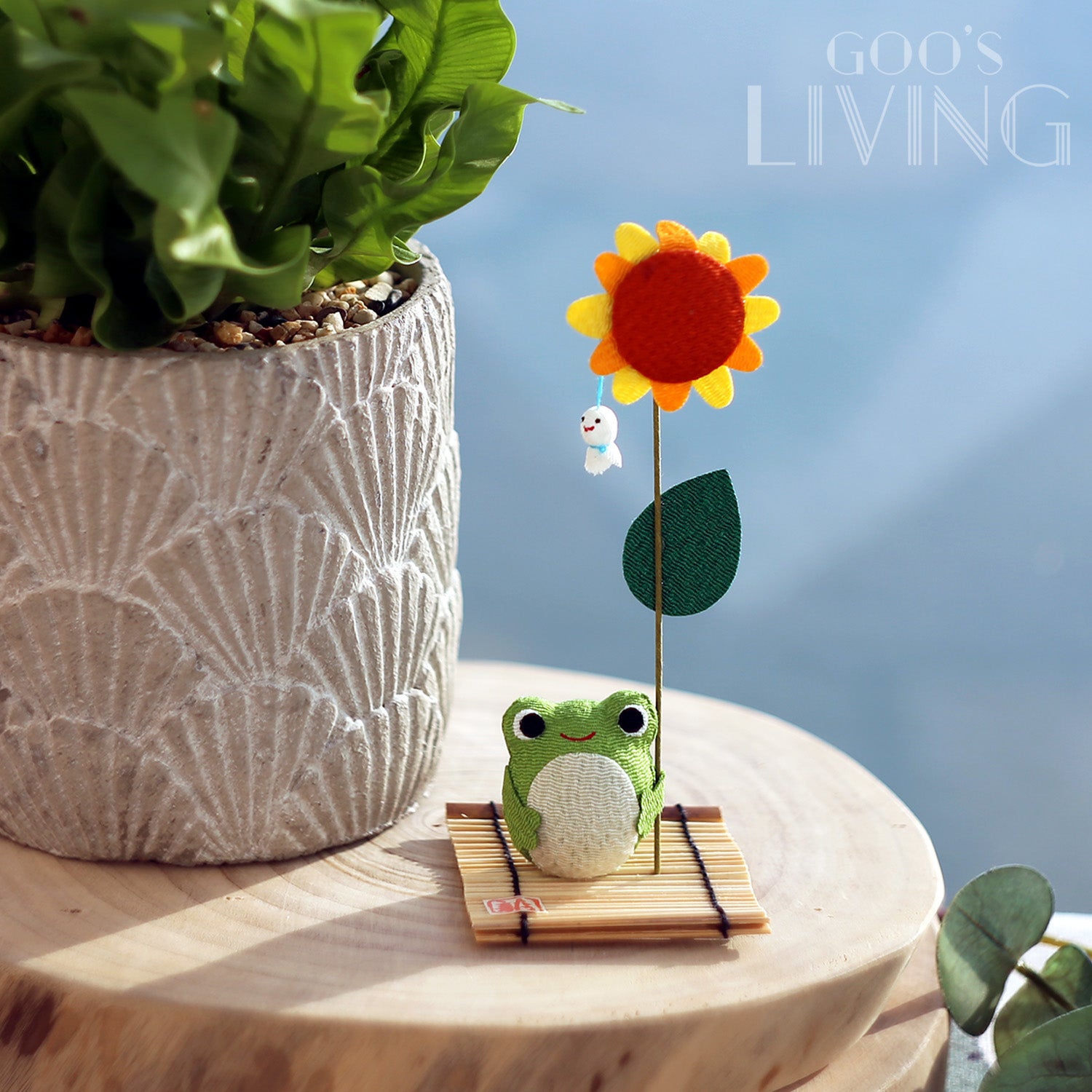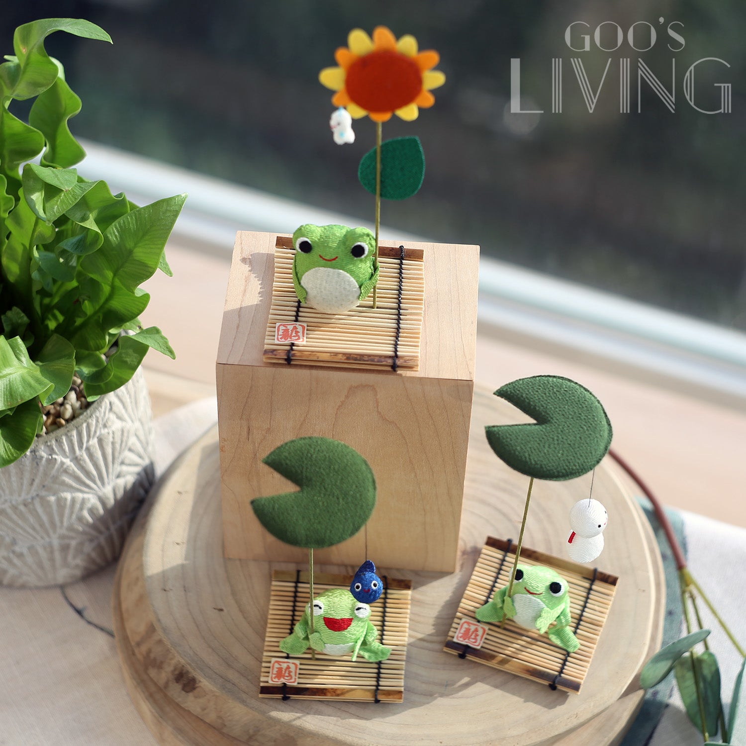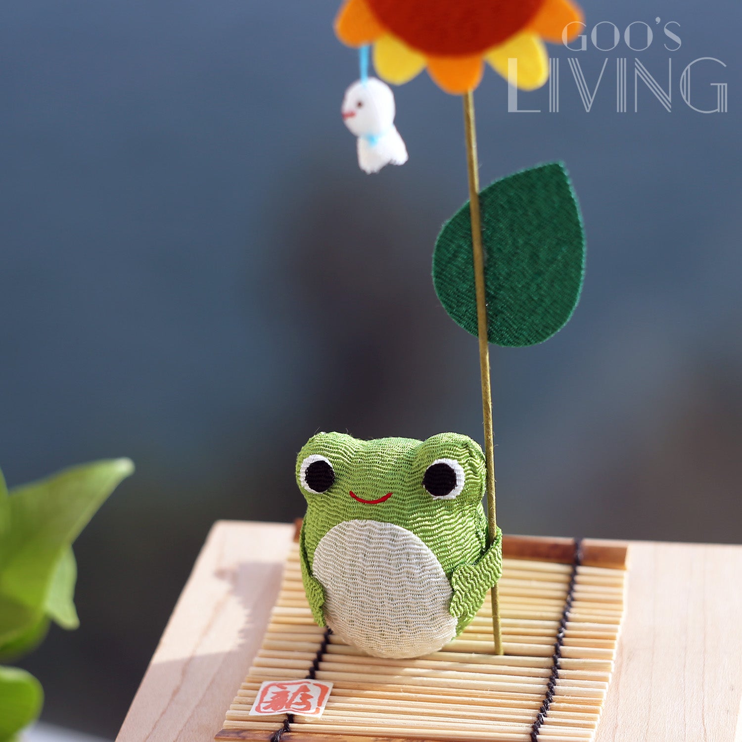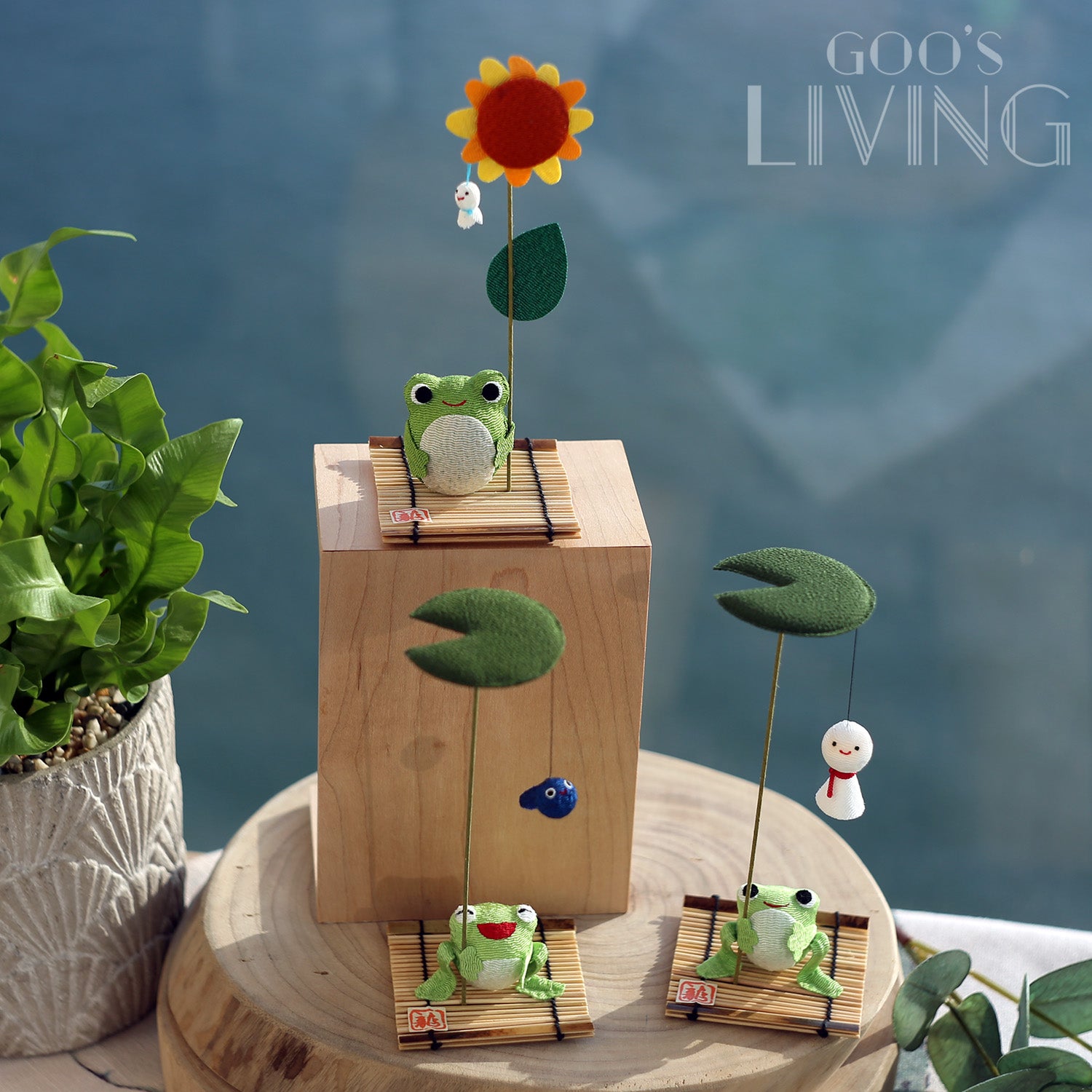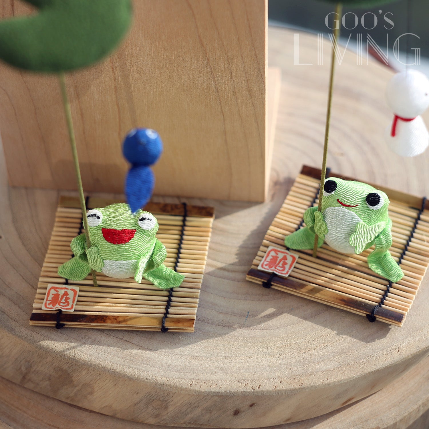 三款青蛙中有兩款設有晴天娃娃,寓意晴天歸來,最適合下雨天時擺放;而笑開懷的青蛙則掛著小蝌蚪,以親子姿態為你帶來好事。竹上的小物更可隨晃動而搖晃,而且用上不易摔爛的縐紗物料,最適合放在車上或櫃上作小擺設。