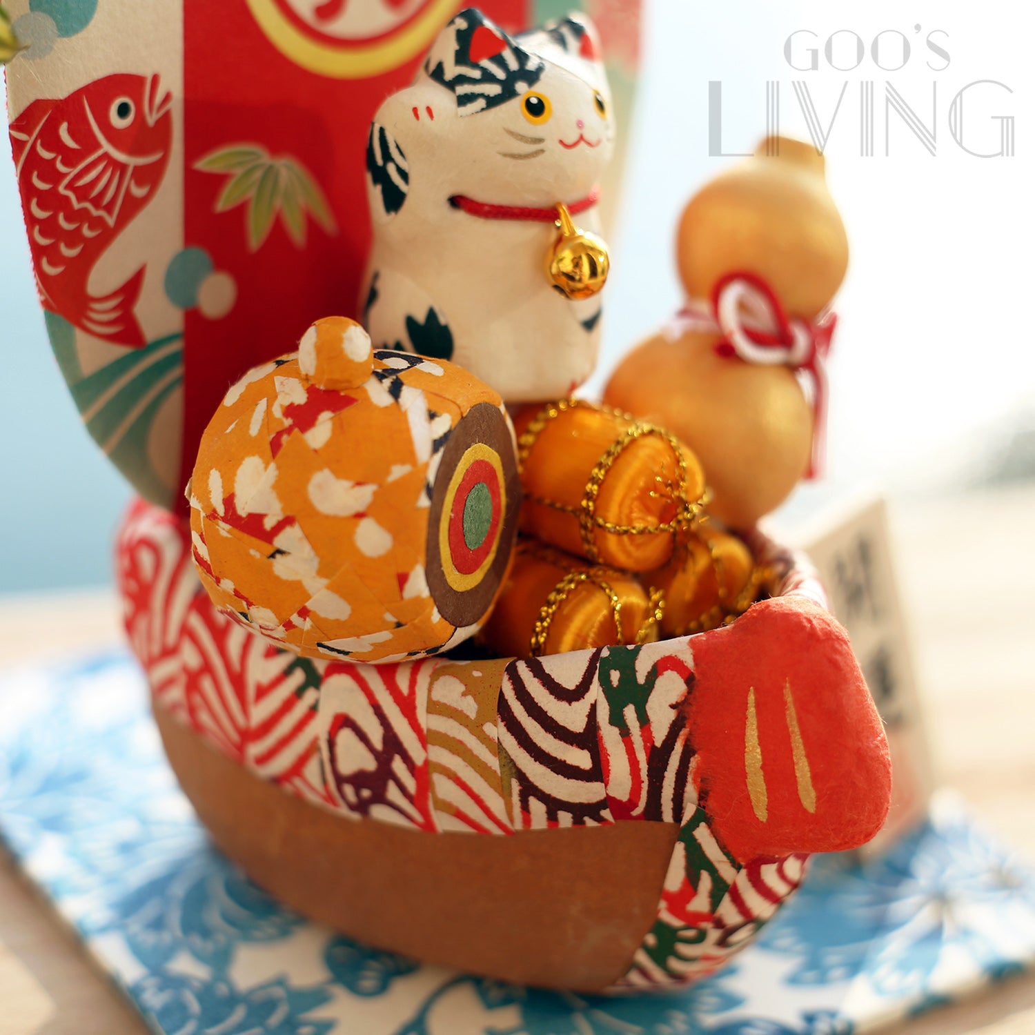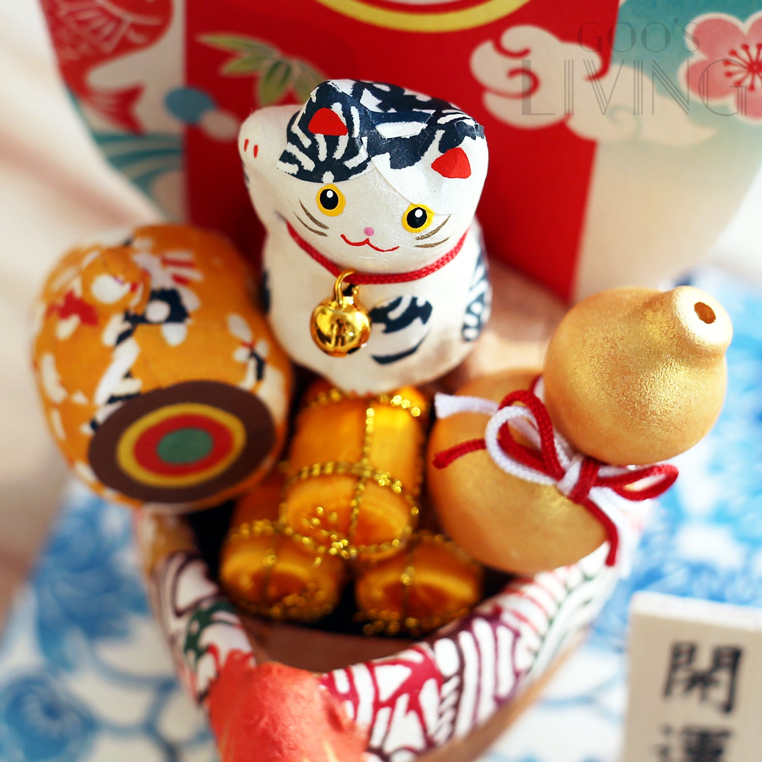 貓咪和紙製開運寶船讓人一見難忘,舉起右手的招財貓坐著戴滿寓意各式好運的寶船向你駛來,如有象微豐衣足食的金米桶、助你心想事成的小槌子和望大家身體健康的葫蘆,配以船帆上的富士山和鯉魚圖案等,招財之餘亦為你送上所有福氣好運。