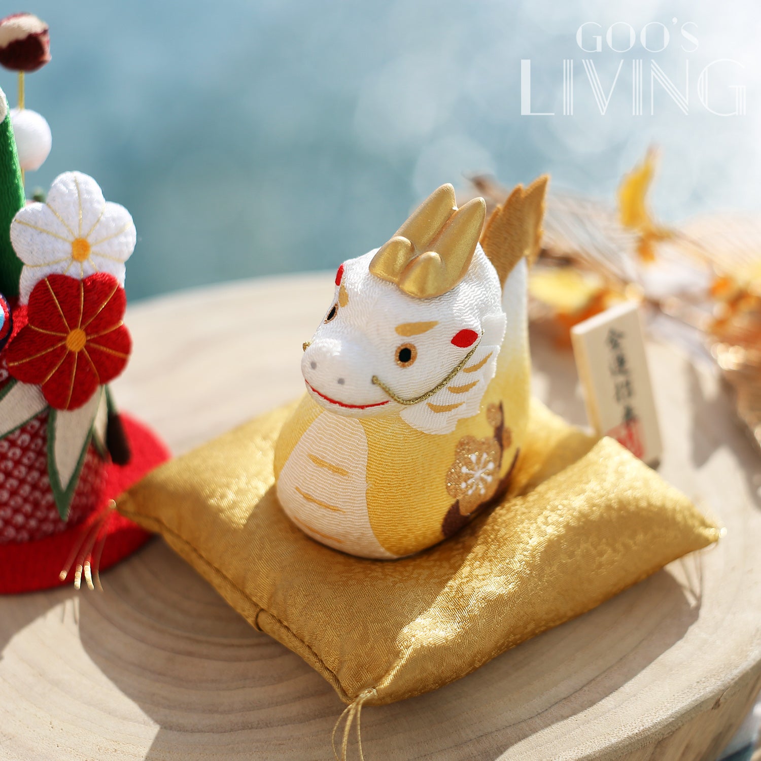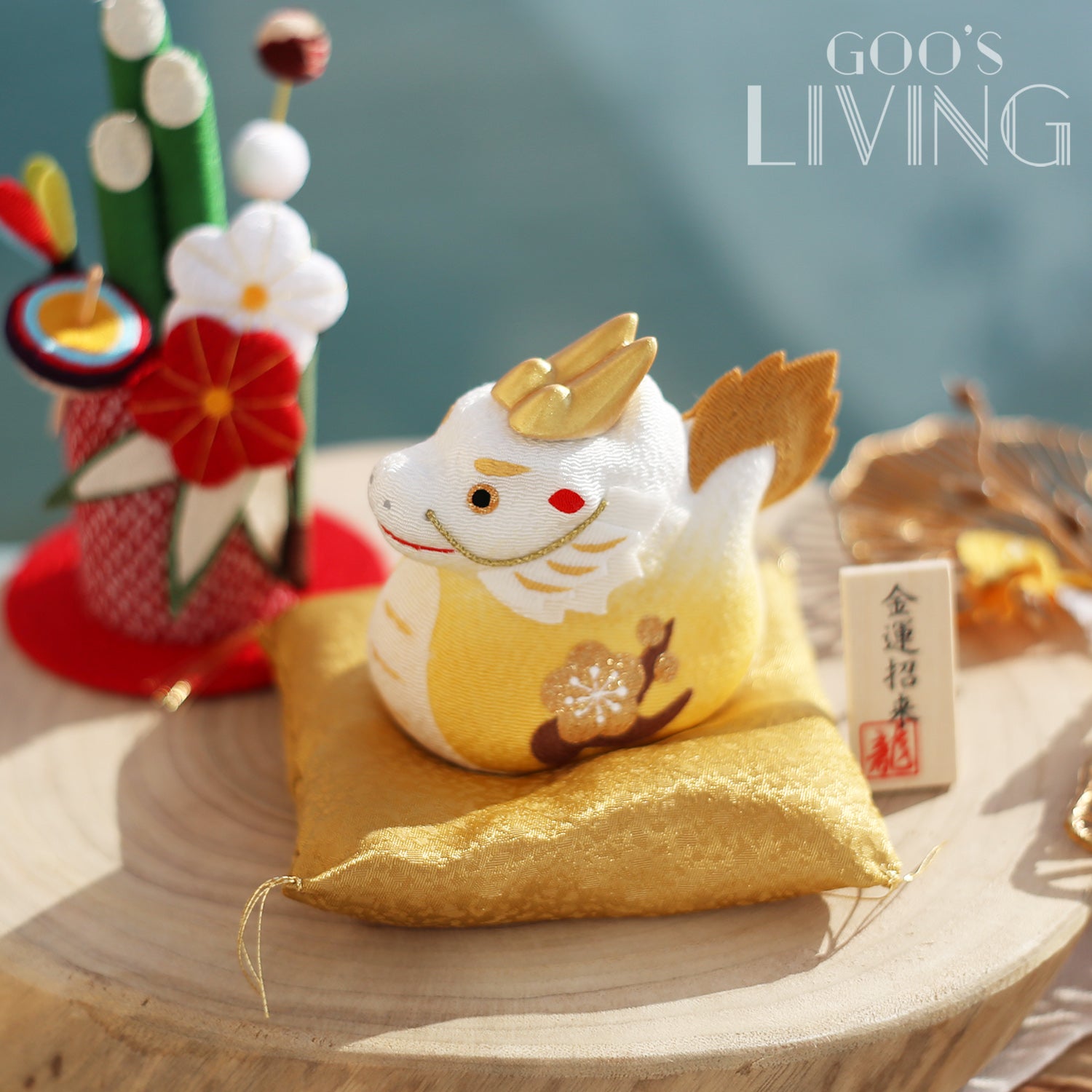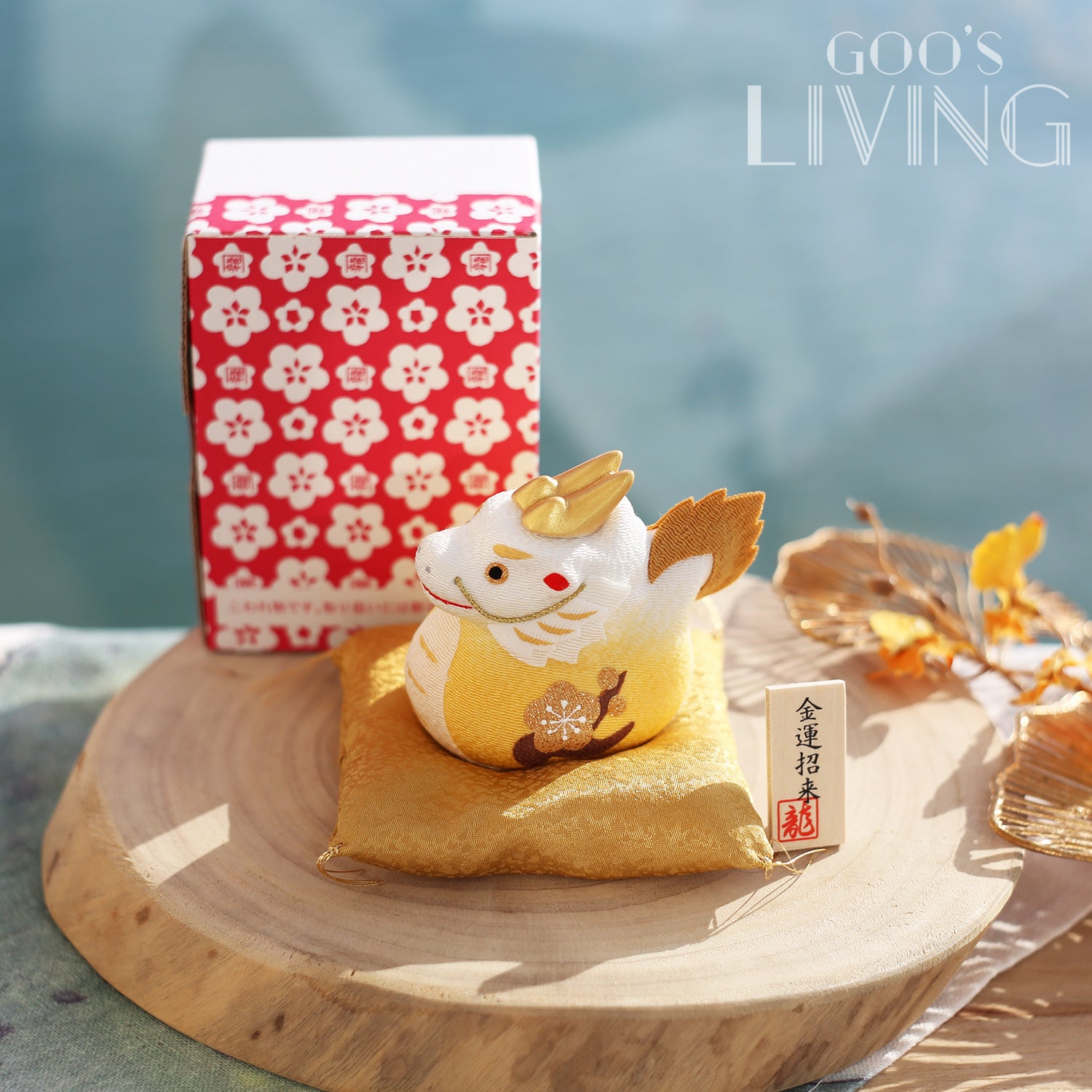 龍在日本人心中被崇拜為稻作之神、生育之神和天氣之神,加上人們相信龍能帶來豐收,故與金錢運息息相關,有著吉祥祝福的形象。呈黃金色的神龍自然與金運相關,不論龍角或龍身均以金色為主,配以高貴的金綿墊,絕對是新年擺設的最佳選擇。