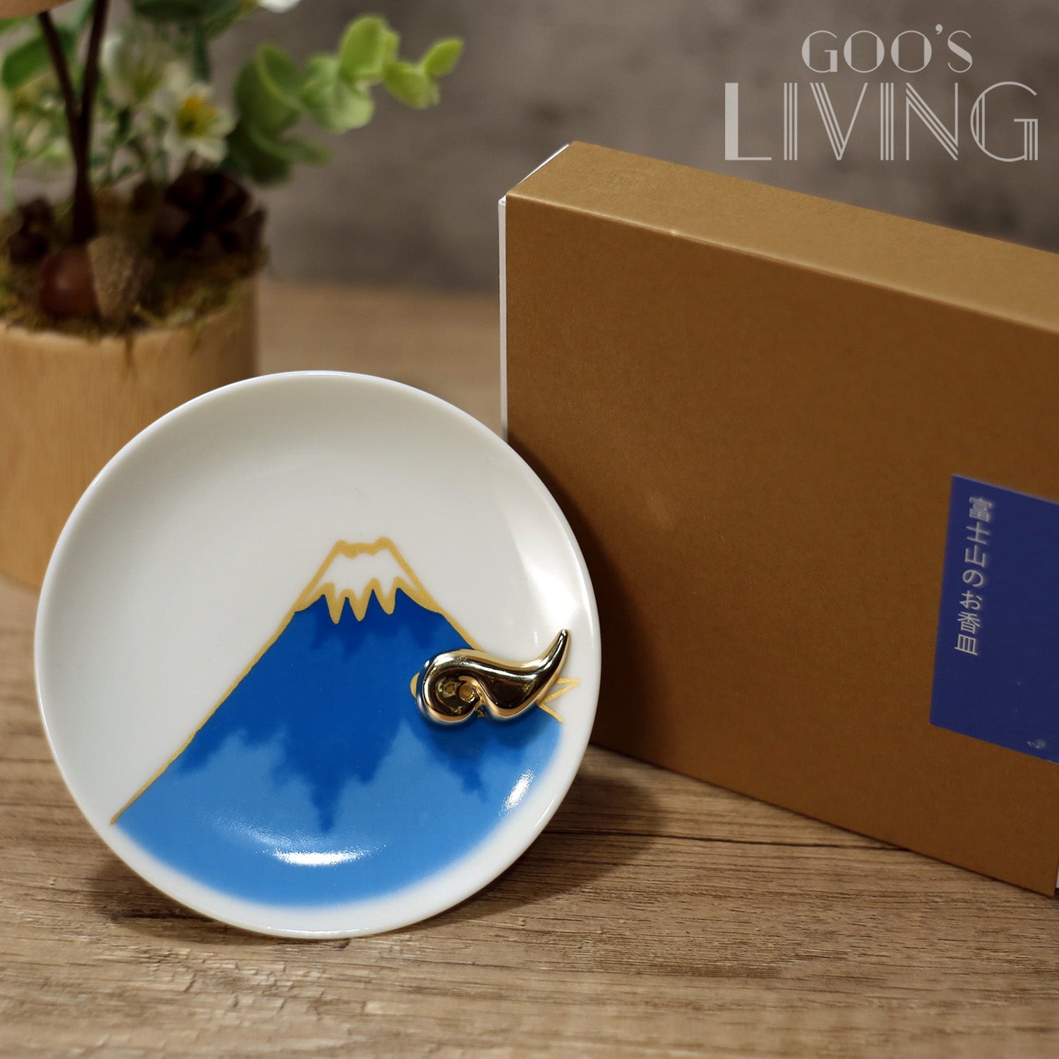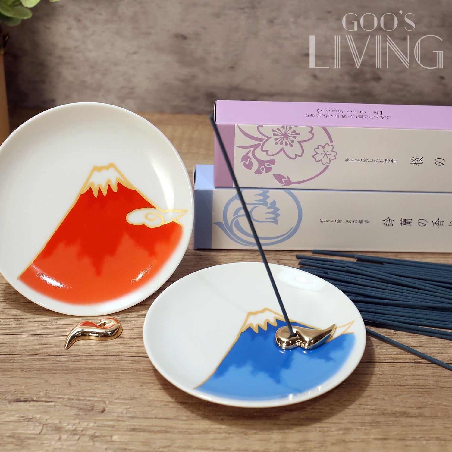悠悠庵推出的線香碟以日本最具代表性的富士山為主角,備有經典青富士與赤富士兩款色澤,配合浮雲形的線香座,令人有放鬆的感覺。「赤富士」是指富士山在早晨陽光或是西下夕陽的照耀下,而呈現出有紅色背景的富士山美景,因赤富士是非常罕見的自然現象,故有著幸運招福的意思。同時,這線香碟較平日使用的載器大,即使較長的線香亦不怕灰燼跌落桌上。